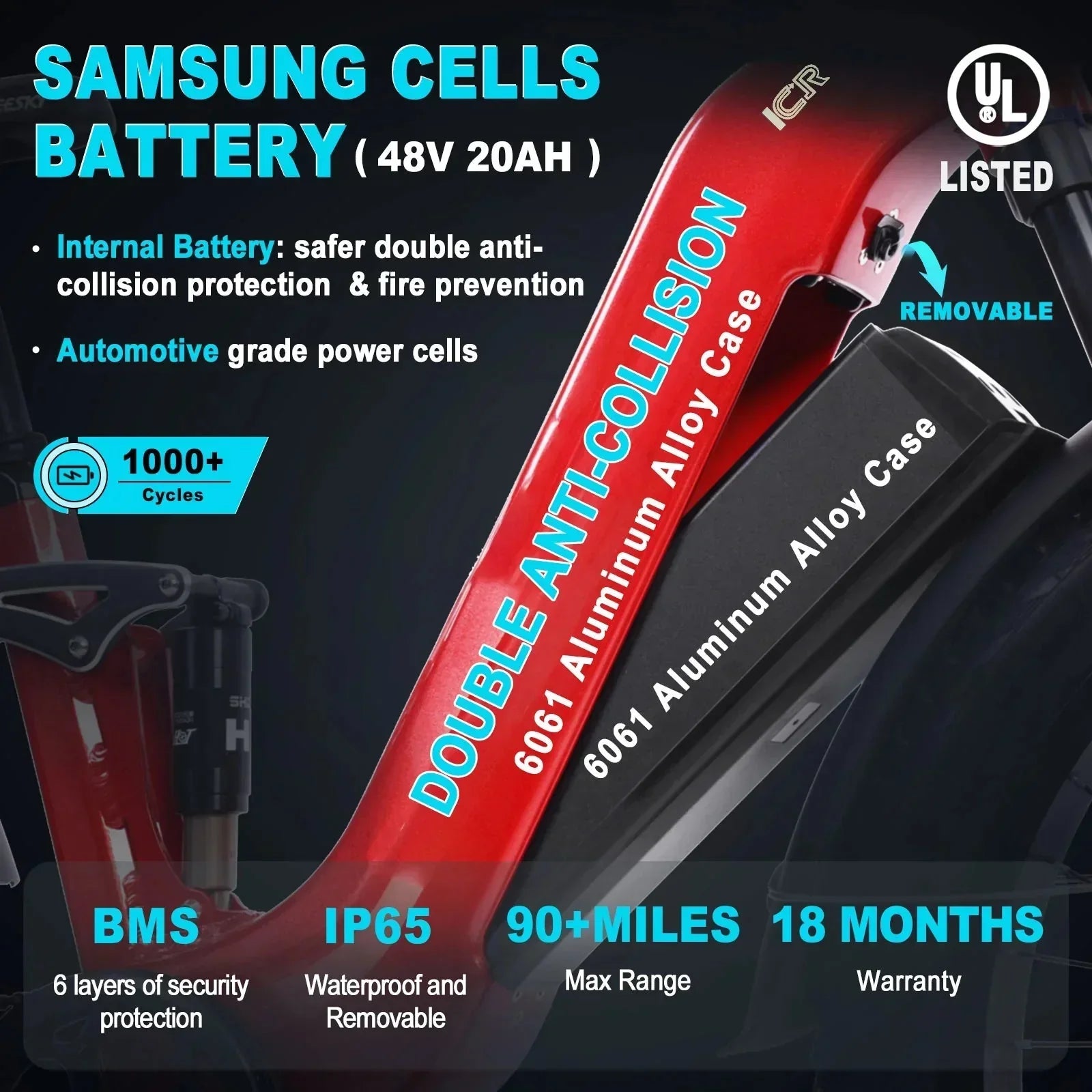 A: The 48V 20Ah battery allows for a range of 45–90 miles per charge, depending on factors like terrain, weight, and riding style.