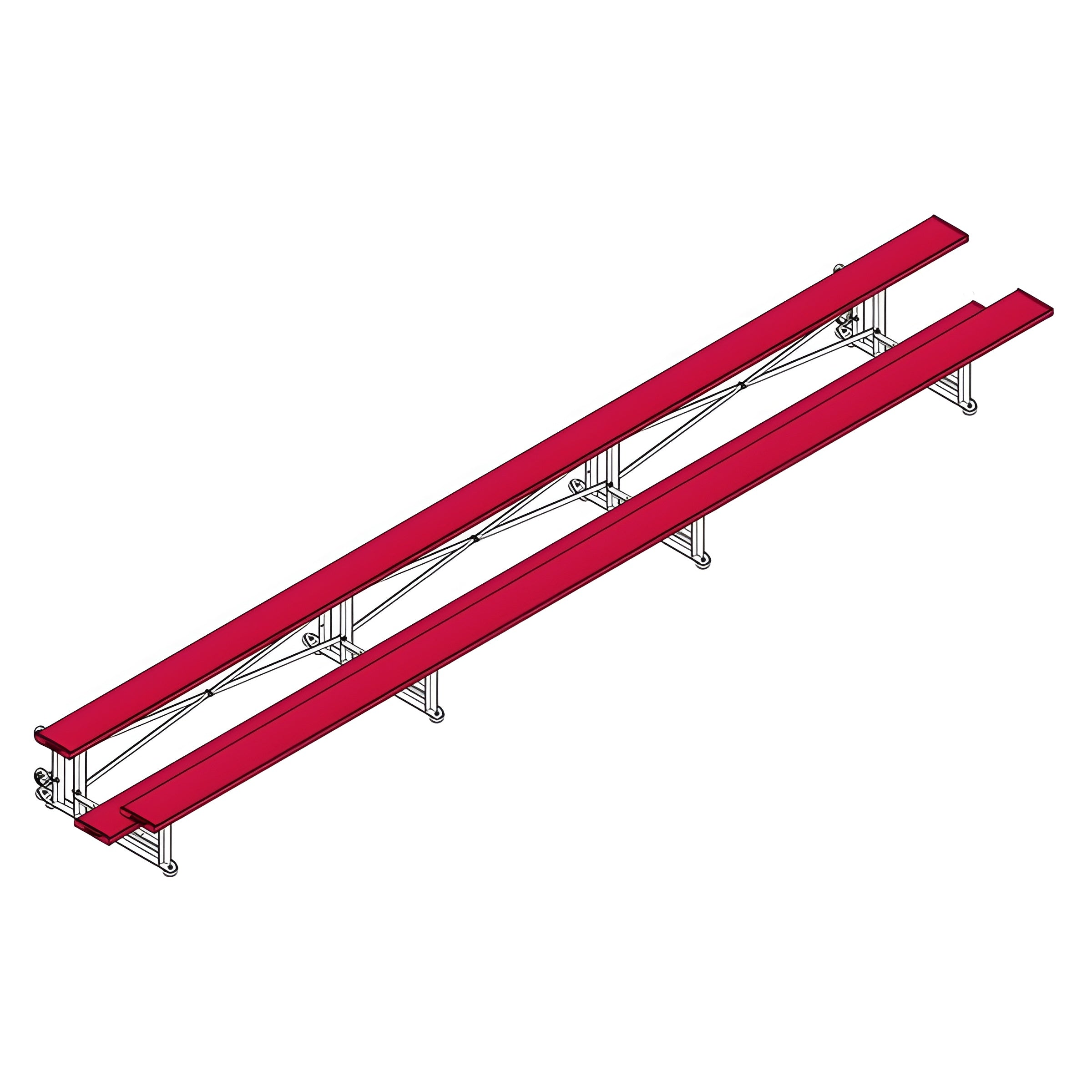 A: These 27' tip & roll bleachers feature a 2-row single-foot plank design with a durable aluminum frame and a "tip & roll" feature for easy mobility and storage.