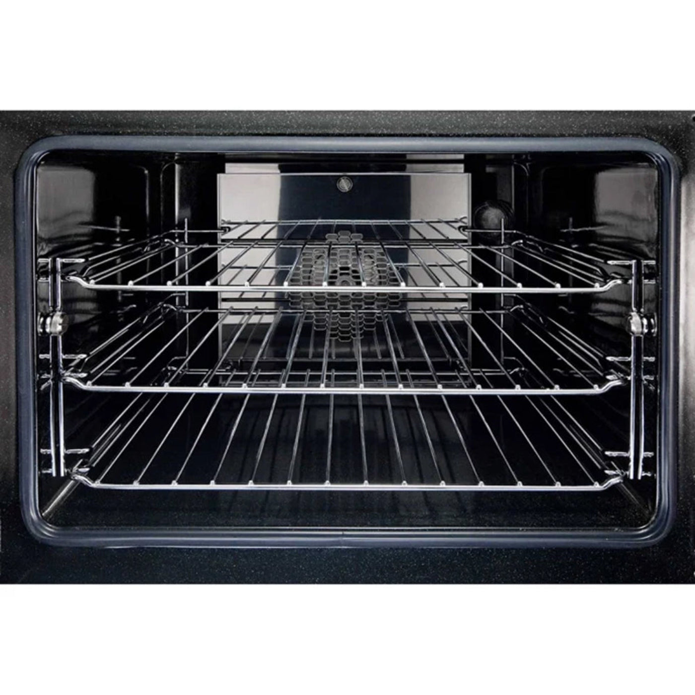 This Turbofan oven is controlled using a mechanical thermostat with a range of 150°F to 500°F (50°C to 260°C) and comes equipped with a 60-minute timer and alarm. The interior oven chamber is porcelain enameled, which makes it extremely easy to clean. It fits three half-size sheet pans easily and comes supplied with three wire racks that offer just over 2.5 inches of space between each one.