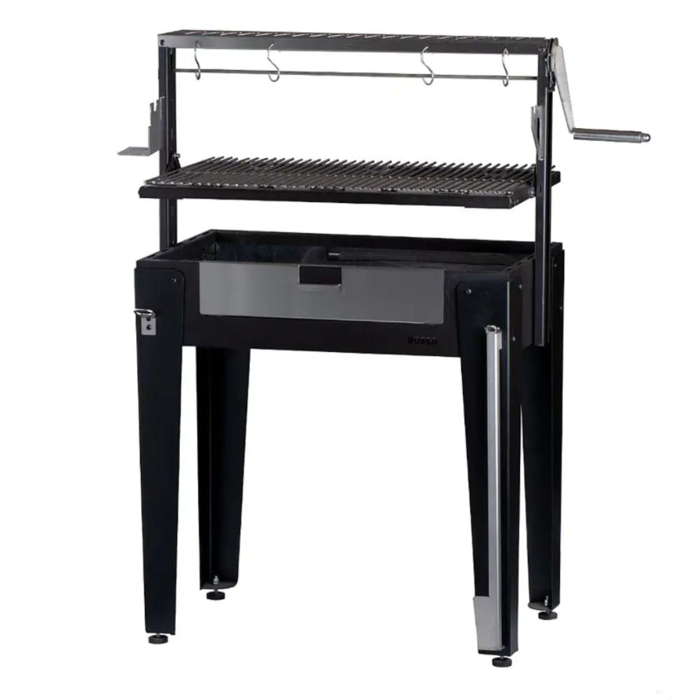 The Maitén grill is designed to be compatible with V-shaped grates and a drip channel from the Block Grill line, preventing meat juices from falling directly onto the coals.