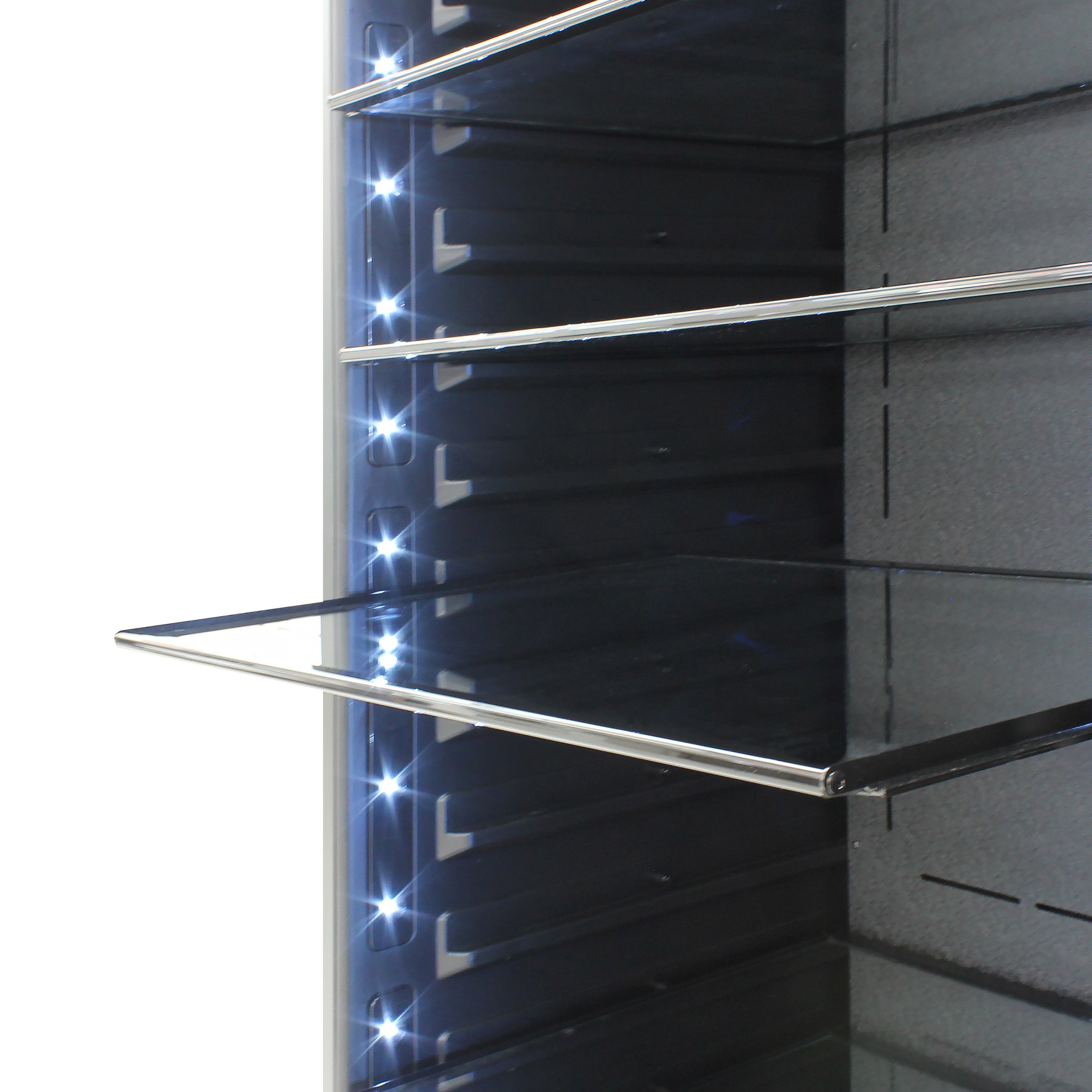 The Brama 300-Series Pantry Refrigerator features a sleek black cabinet body and door with a pole handle that makes this unit a great addition to any pantry or garage setting. Beautiful enough to place inside the home, we designed this refrigerator with added insulation to be able to be used out of sight as well. With special insulation in both the cabinet and the door, it can withstand the higher temperature changes in warmer or colder climates. With a single temperature zone, this unit is perfect for storing beverages at the right temperature. The glass shelves are designed for storage display inside the unit. The internal digital control panel makes setting the perfect temperature simple and enables you to store all of your goods under the exact same conditions. You can also turn the interior blue LED lighting on or off with a switch of a button. A front exhaust makes it simple to build this refrigerator into existing cabinetry of a garage, or it can also be used freestanding. Shelves can be adjusted to store various items in multiple configurations. Side-by-side installation with EL-300GFEB-L Garage Dual-Zone Wine Cooler (Left Hinge) gives you a left and right setting with matching wine cooler and refrigerator for your garage or pantry. Covered by the Vinotemp One-Year Limited Warranty.