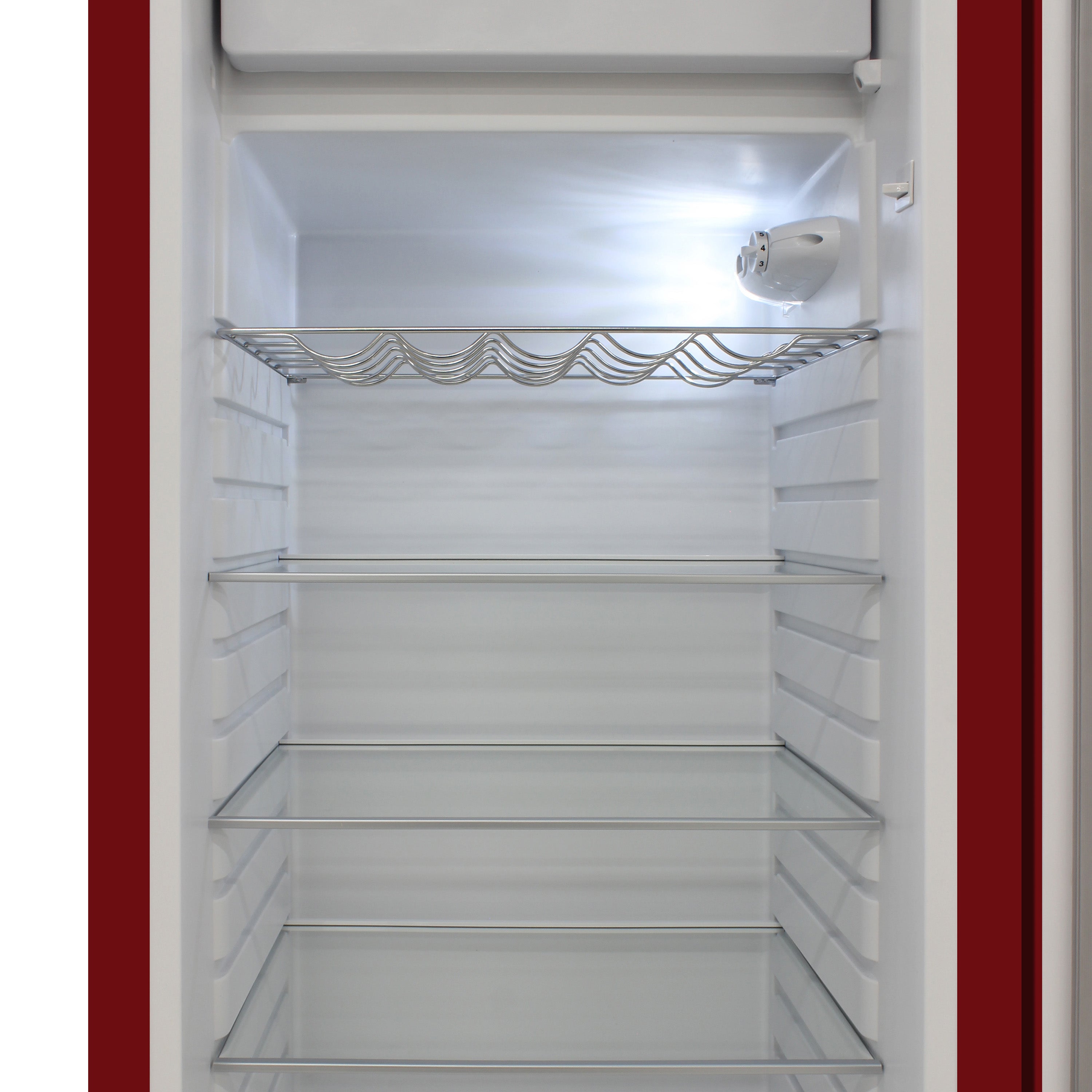 Keep all of your goods at the perfect serving temperature with the Brama by Vinotemp Retro Refrigerator. This retro style refrigerator features a top freezer, interior light, open storage with four pull-out shelves including one metal wire rack, bottom bulk storage and four rows of small storage behind the door. The red fridge has a rounded exterior with solid steel door, giving it a retro look with all the benefits of a modern appliance. This stylish retro fridge with freezer makes a perfect addition to any space. Covered by the Vinotemp One-Year Limited Warranty.Keep all of your goods at the perfect serving temperature with the Brama Retro Refrigerator. This unit features a top freezer, interior light, open storage with 4 pull-out shelves including one metal wire racking, bottom bulk storage, and 4 rows of small storage behind the door. The red, rounded exterior with solid steel door gives a retro and modern look and makes a perfect addition to any space.