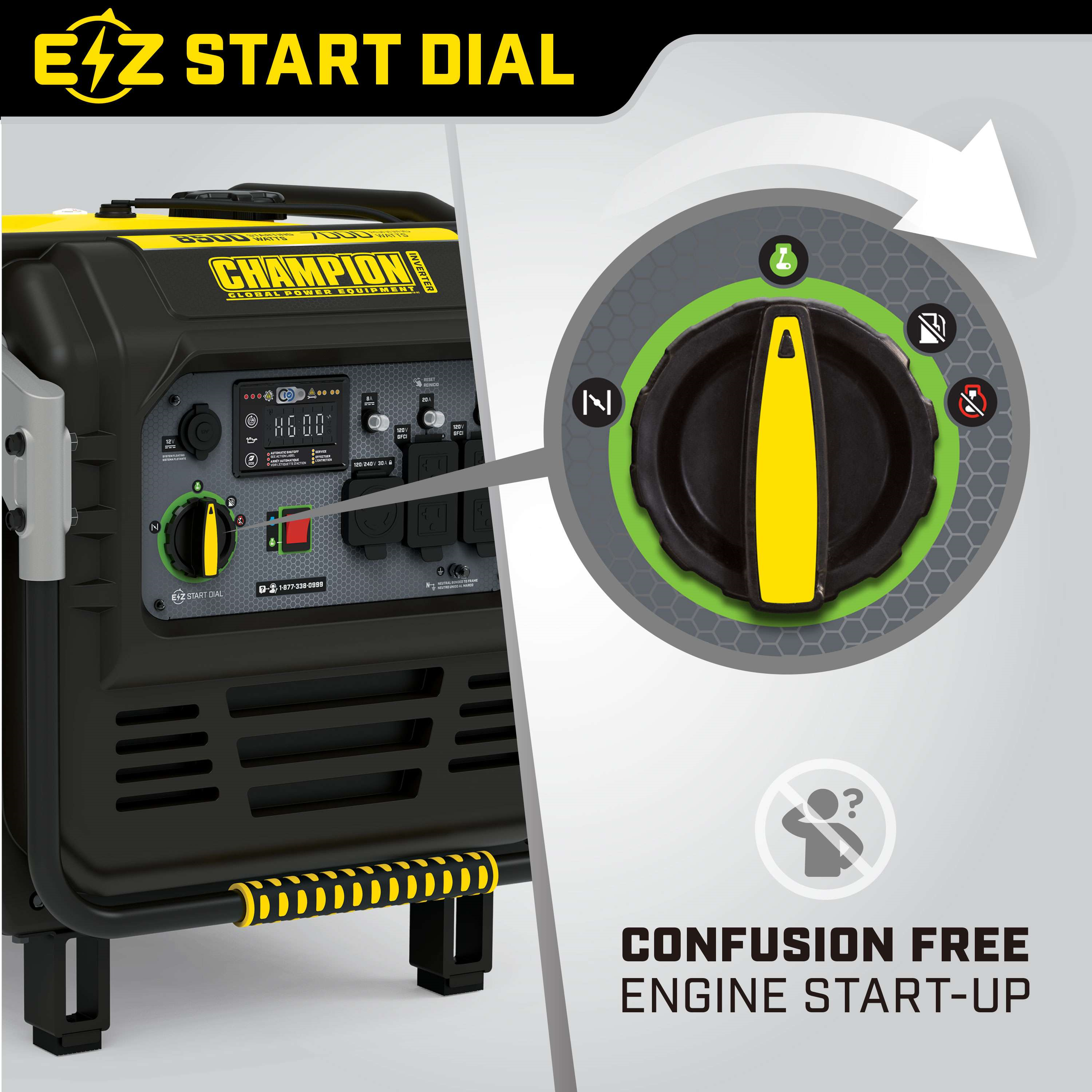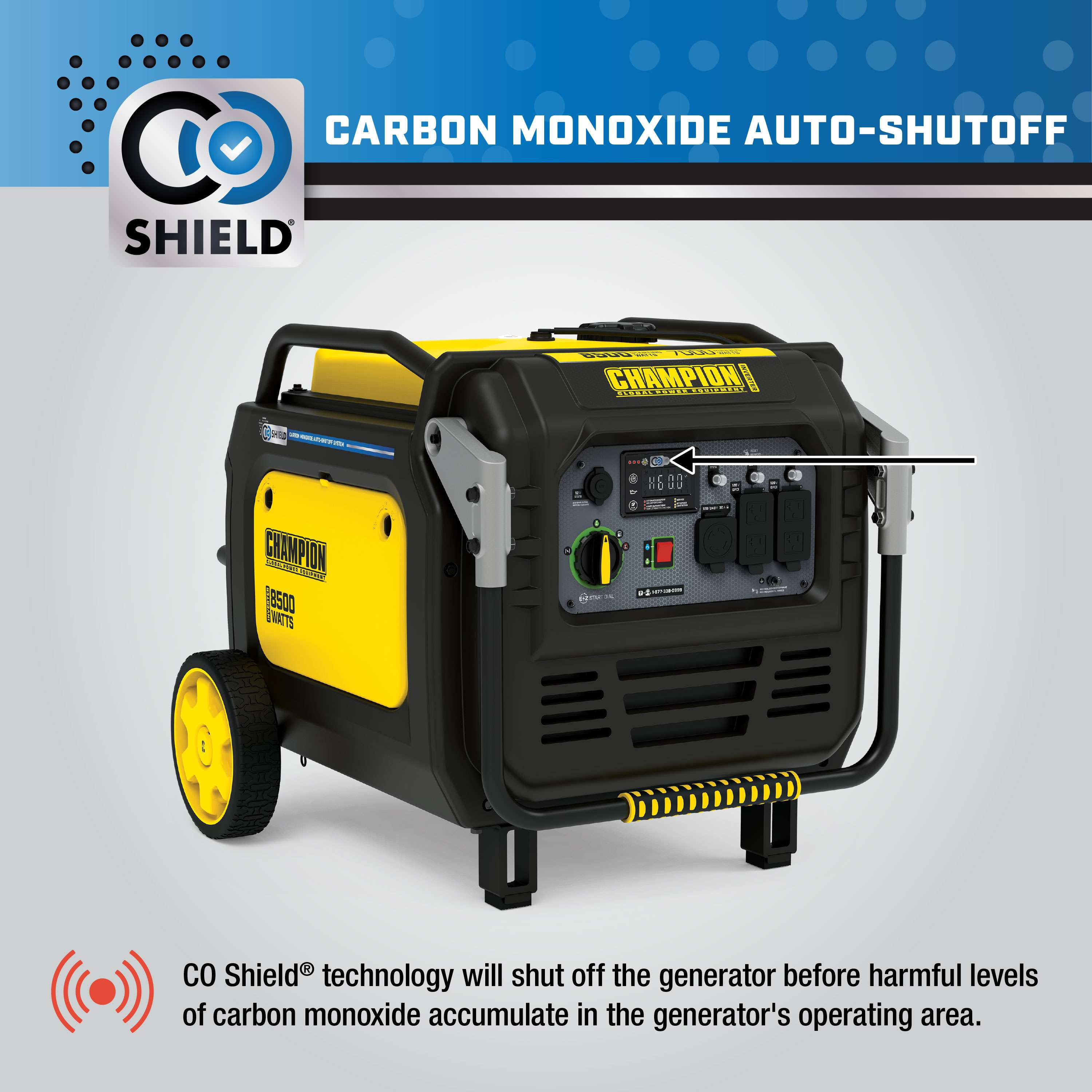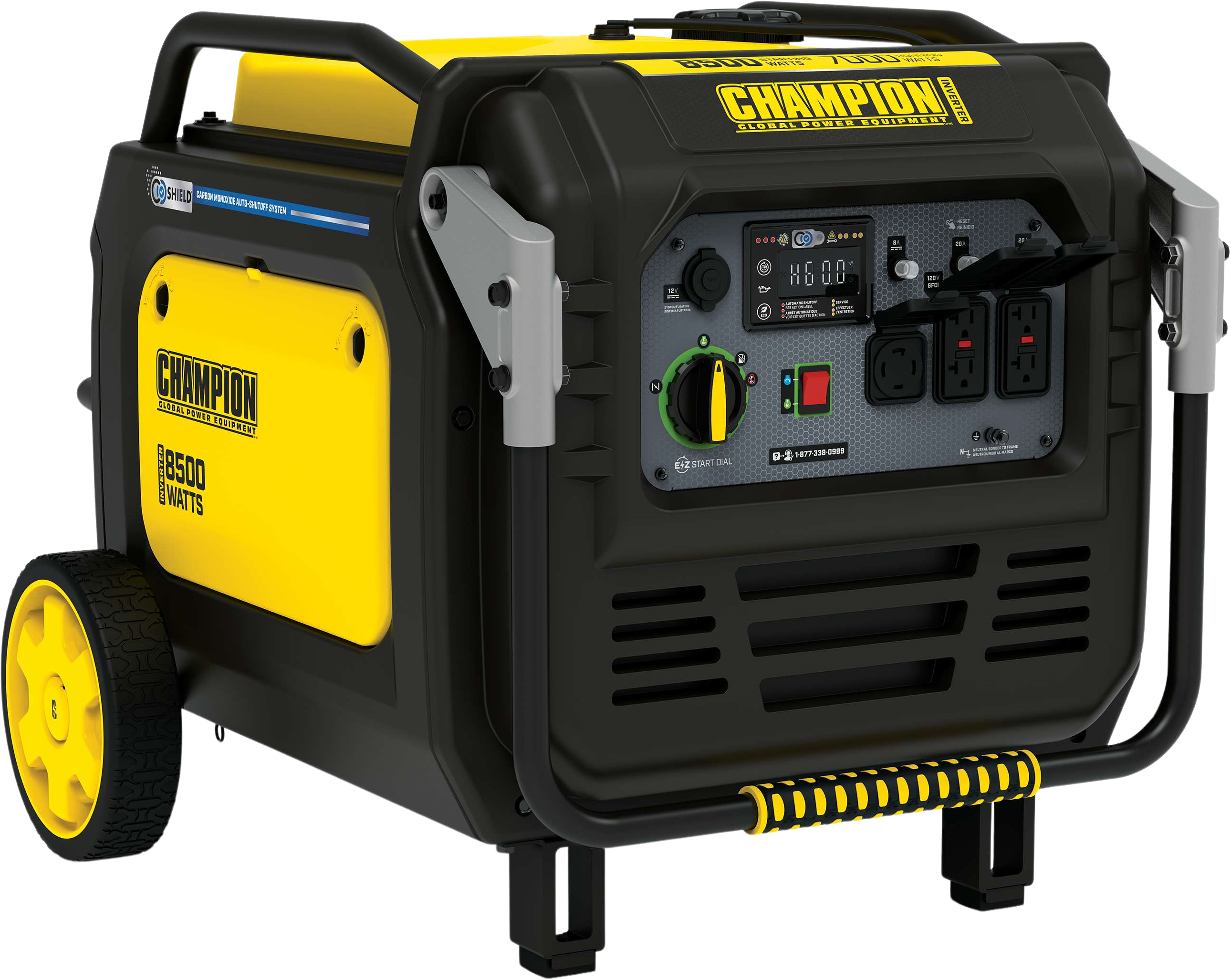The Champion Power Equipment 8500-Watt Inverter Generator with CO Shield® is ultra-quiet and ideal for camping, tailgating, powering items around the RV or providing backup for your essentials. Champion’s EZ Start Dial makes getting started quick and easy. Featuring Cold Start Technology, Extended Run Time, and an easy to read fuel gauge, the reliable 420cc Champion engine produces 8500 starting watts and 7000 running watts, and runs for 14 hours at 25% load when the 5.3-gallon fuel tank is full. With a 1.2-quart oil capacity (included 10W-30) and a low oil shut-off sensor, this inverter operates at an ultra-quiet 61 dBA from 23 feet, which is about as loud as normal speech. The no tool access panel and oil drain tube allow for easy maintenance. Confidently connect your sensitive electronics since this inverter produces Clean Power (less than 3% THD).
