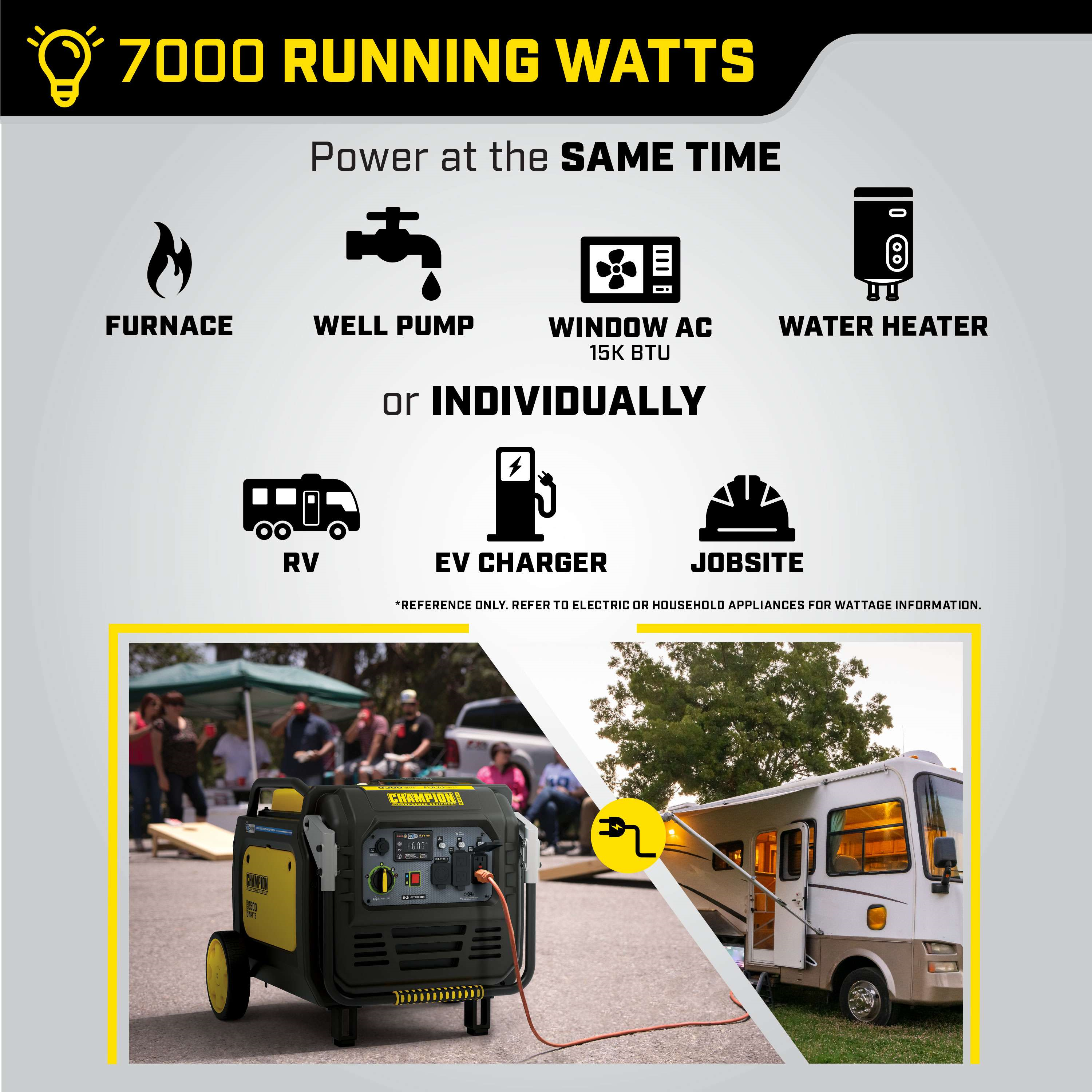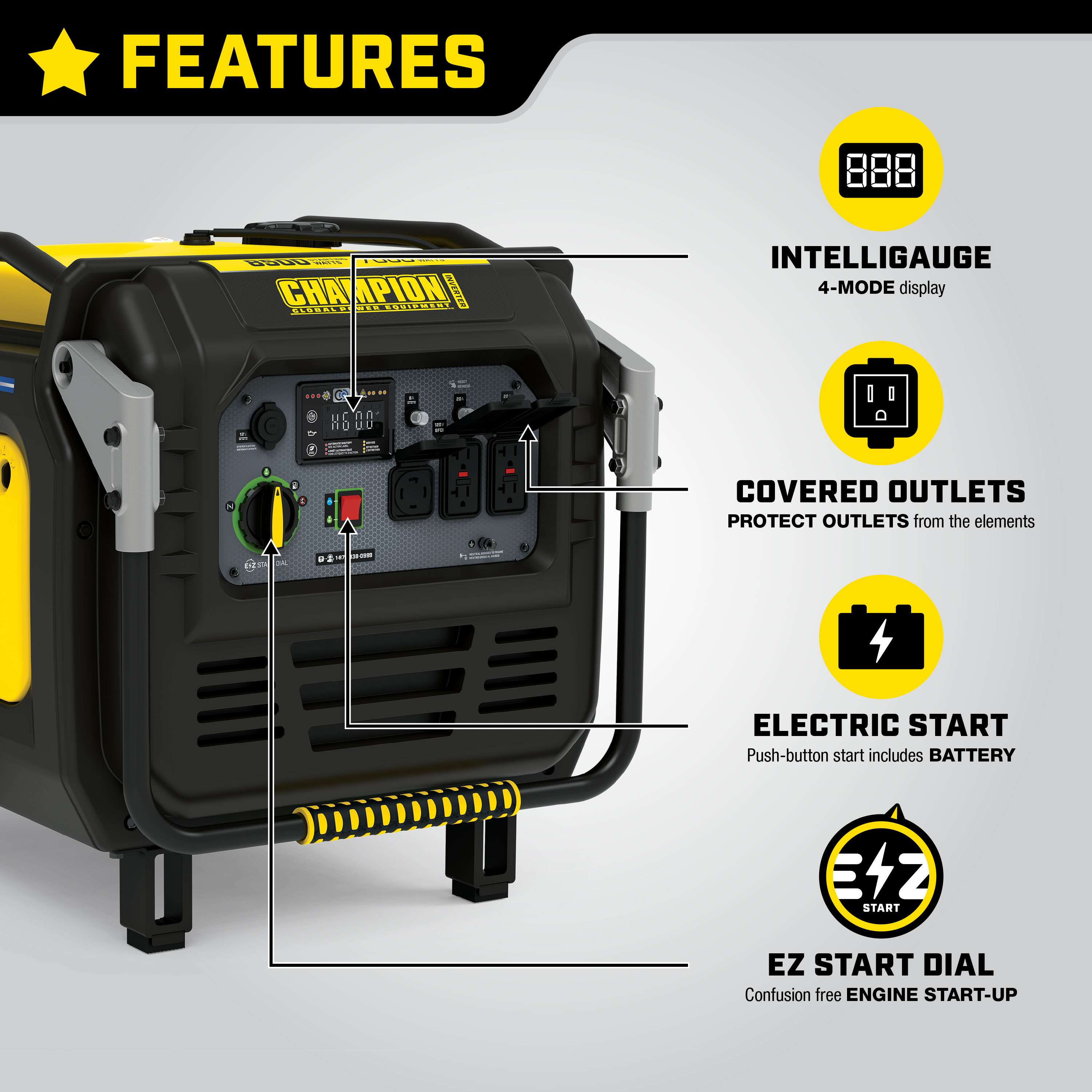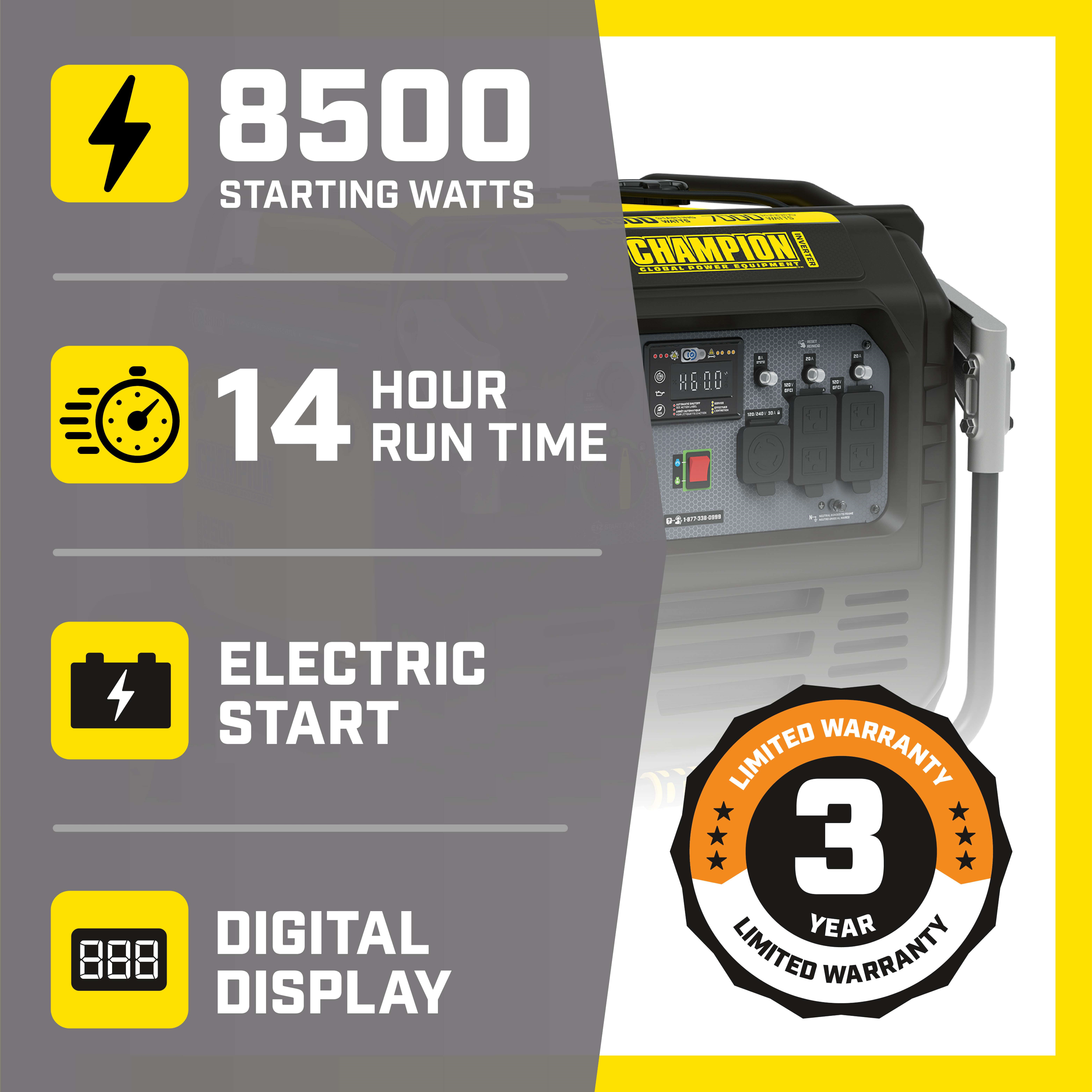 The Champion Power Equipment 8500-Watt Inverter Generator with CO Shield® is ultra-quiet and ideal for camping, tailgating, powering items around the RV or providing backup for your essentials. Champion’s EZ Start Dial makes getting started quick and easy. Featuring Cold Start Technology, Extended Run Time, and an easy to read fuel gauge, the reliable 420cc Champion engine produces 8500 starting watts and 7000 running watts, and runs for 14 hours at 25% load when the 5.3-gallon fuel tank is full. With a 1.2-quart oil capacity (included 10W-30) and a low oil shut-off sensor, this inverter operates at an ultra-quiet 61 dBA from 23 feet, which is about as loud as normal speech. The no tool access panel and oil drain tube allow for easy maintenance. Confidently connect your sensitive electronics since this inverter produces Clean Power (less than 3% THD).