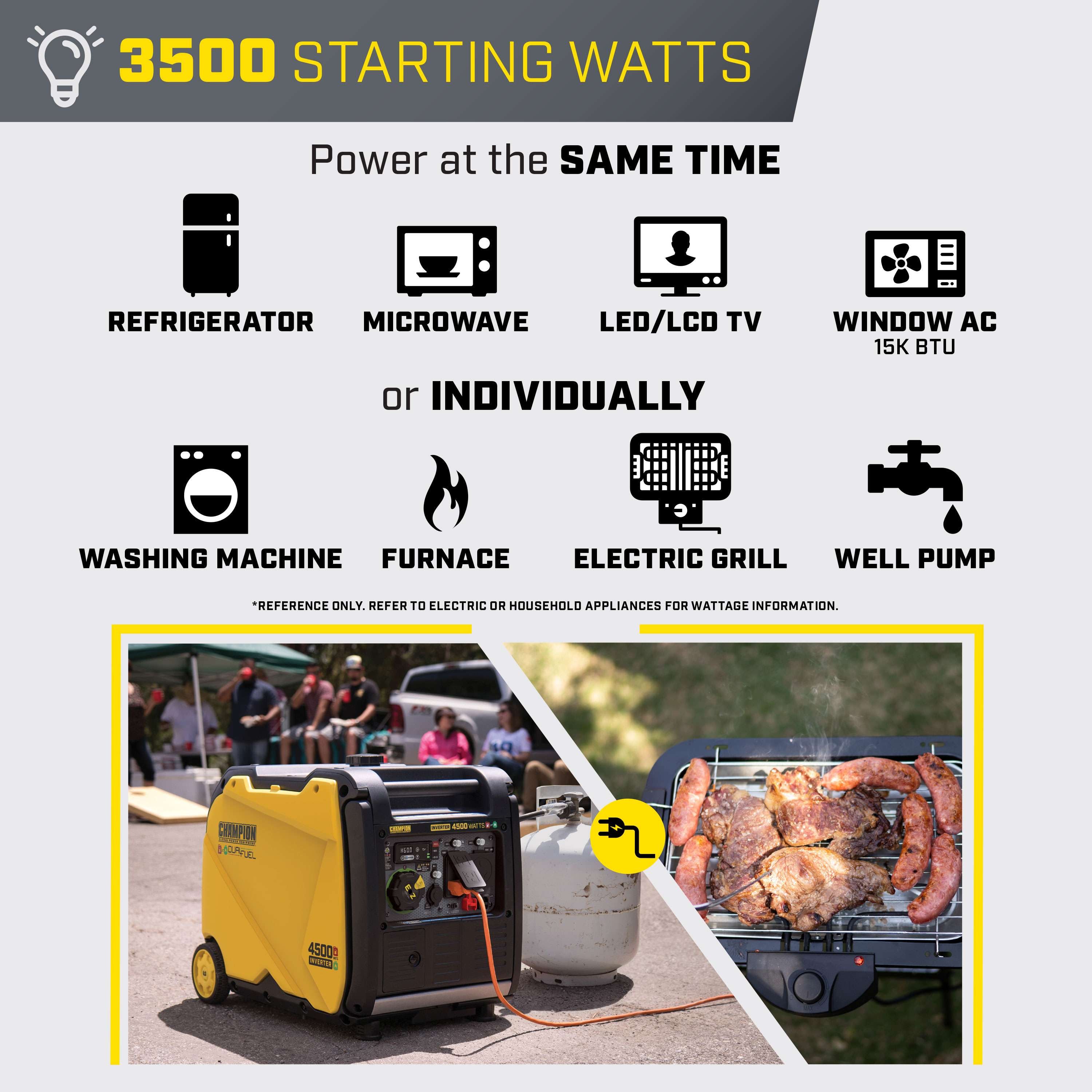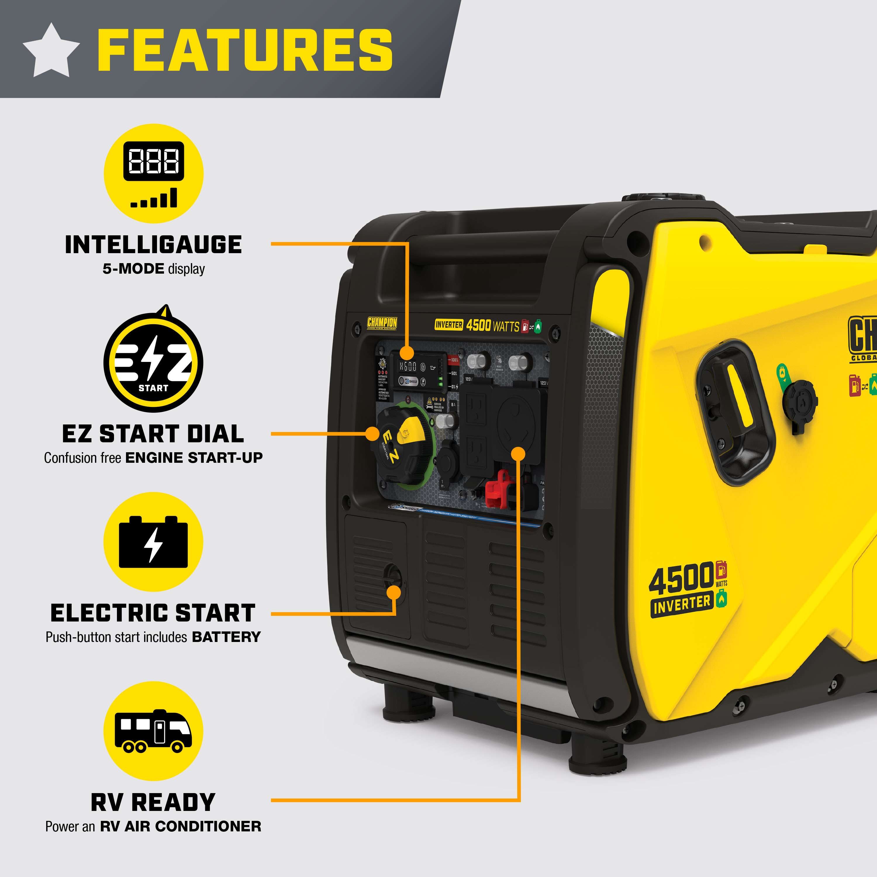 The Champion Power Equipment 4500-Watt Inverter Generator with CO Shield is ultra-quiet and ideal for camping, tailgating, powering items around the RV or providing backup for your essentials. Champion’s EZ Start Dial makes getting started quick and easy. This unit features Cold Start Technology, Extended Run Time, and an easy to read fuel gauge. With a 0.5-quart oil capacity (included 10W-30) and a low oil shut-off sensor, this inverter operates at an ultra-quiet 61dBA from 23 feet, which is about as loud as normal speech. The no-tool access panel and oil drain tube allow for easy maintenance. Confidently connect your sensitive electronics since this inverter produces Clean Power (less than 3% THD).