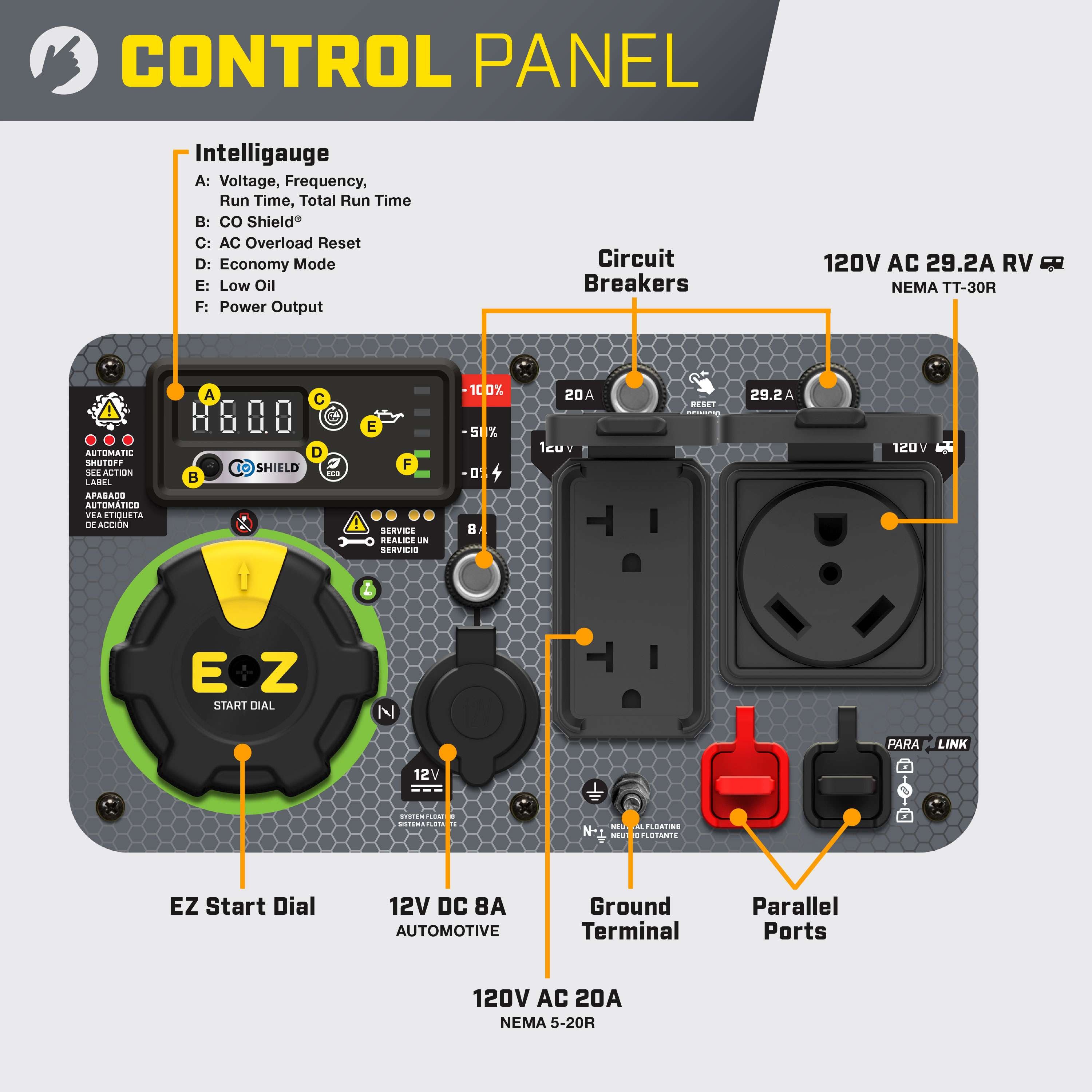 CO Shield Technology: Monitors carbon monoxide levels and automatically shuts down the generator to keep you safe.