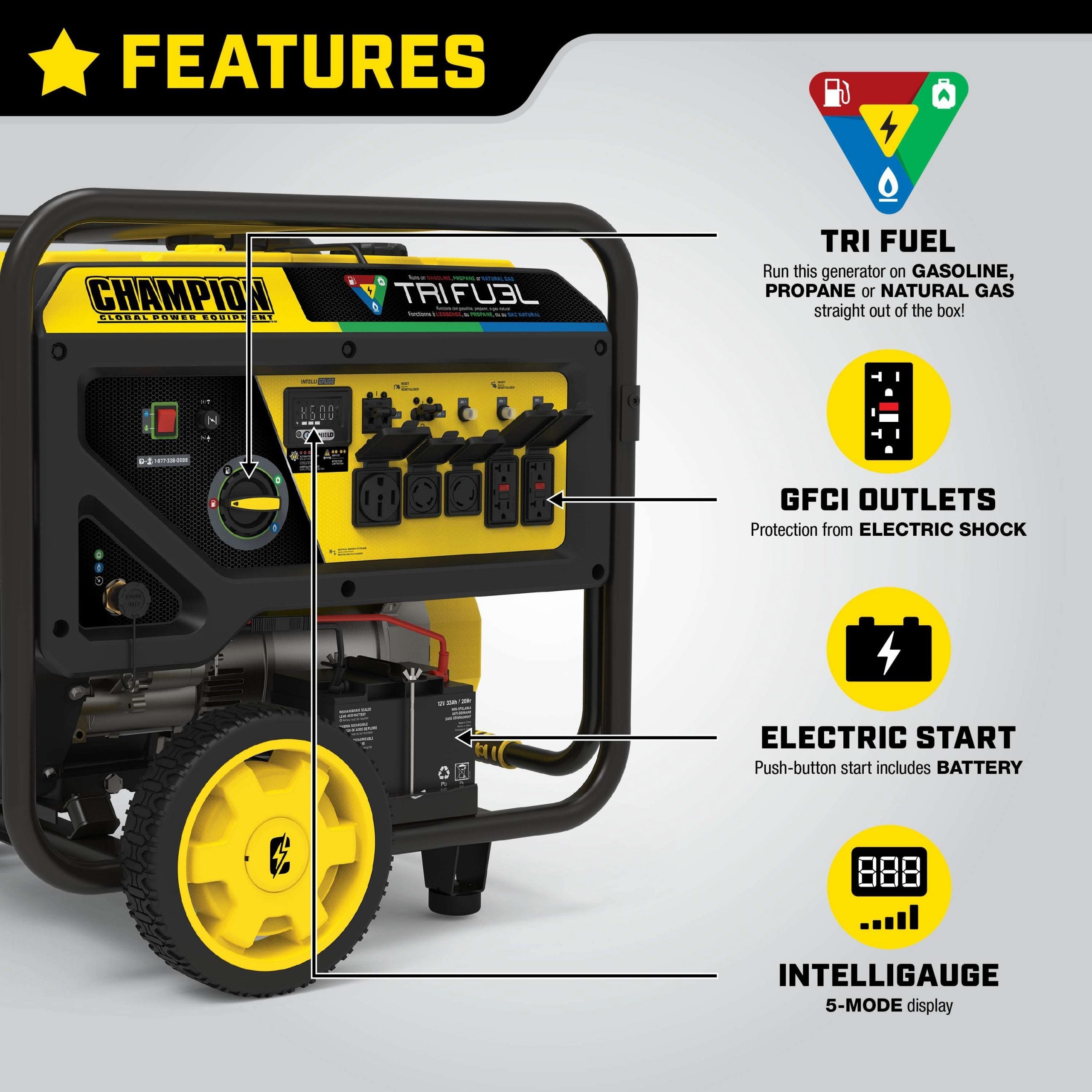 Tri-Fuel Flexibility: Runs on gasoline, propane, or natural gas, offering convenience and adaptability in any situation.