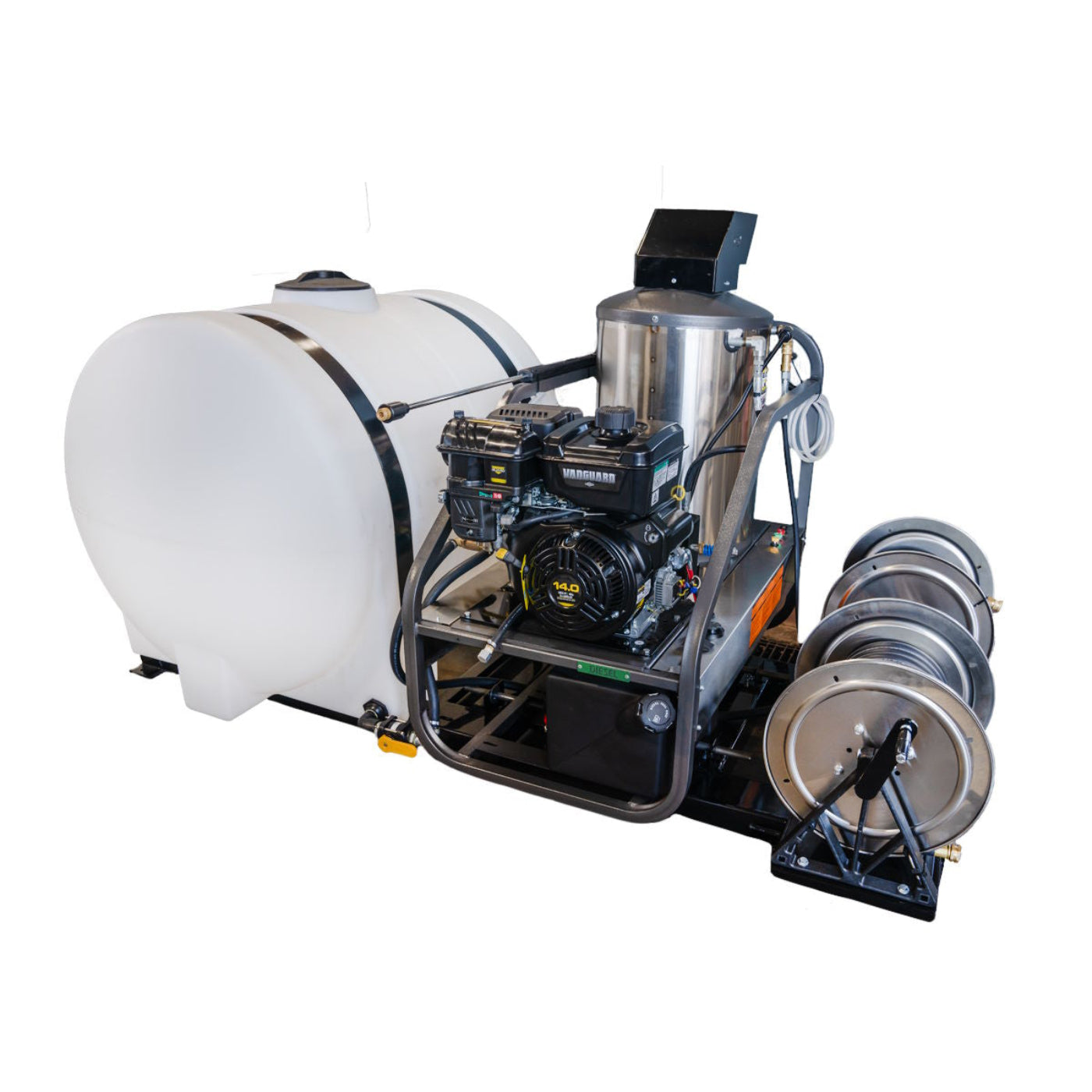 Self-Contained Skid System – Includes water tank, hose reels, and spray gun, perfect for mobile cleaning operations.