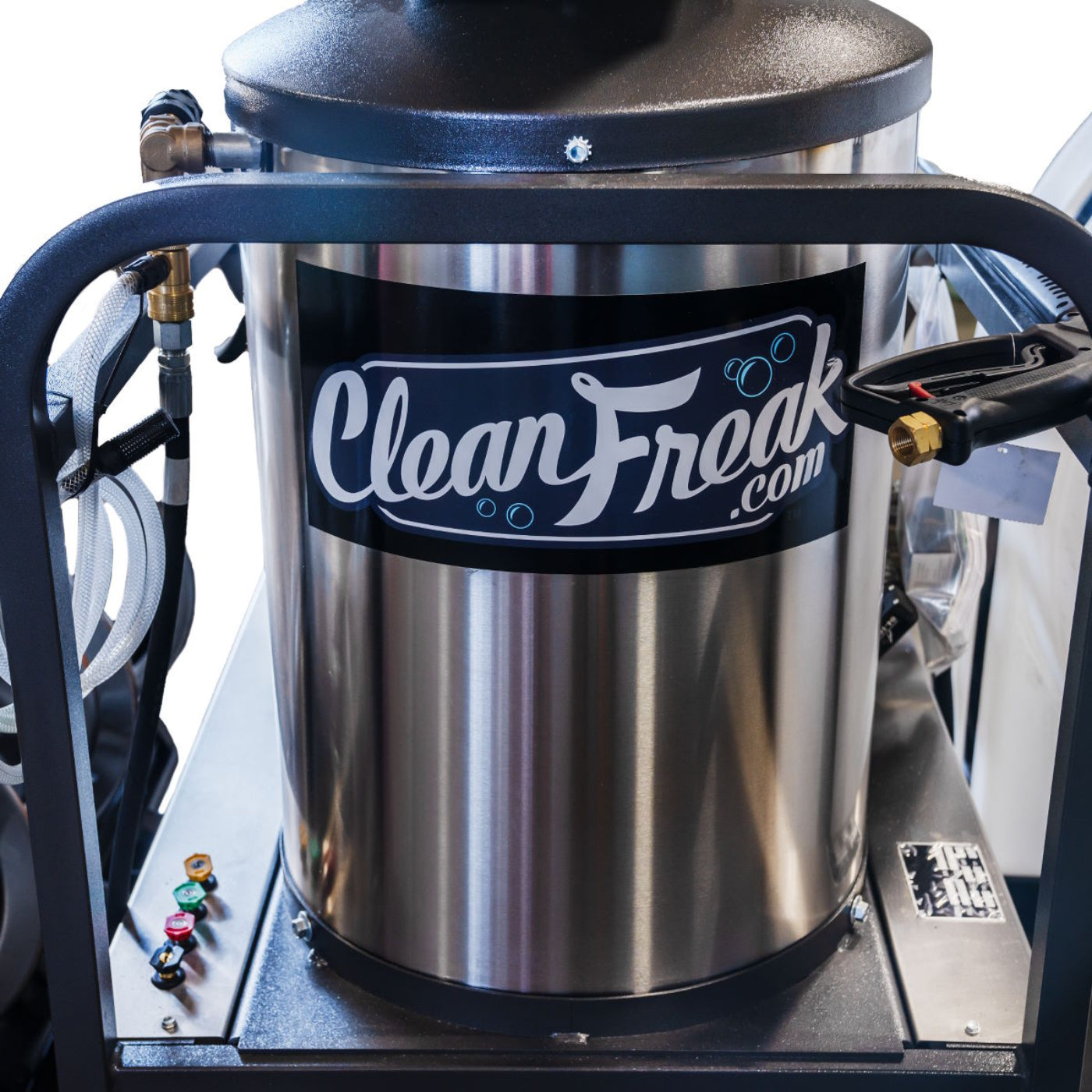 This CleanFreak 4.0 GPM pressure washing system has a 225 gallon fresh water tank, a 14 HP Vanguard gas engine from Briggs & Stratton, a diesel fired heater, and is mounted to a steel framed skid. The steel frame has foklift channels to lift up and move the pressure washer skid around. It can be a portable unit that is moved around and transported around to different areas, or it can be permanently mounted in a truck bed or trailer. When permanently mounting, please check the vehicle or trailers gross weight limitations, as this skid will weigh approximately 3,800 pounds when the 225 gallon storage tank is filled with water.