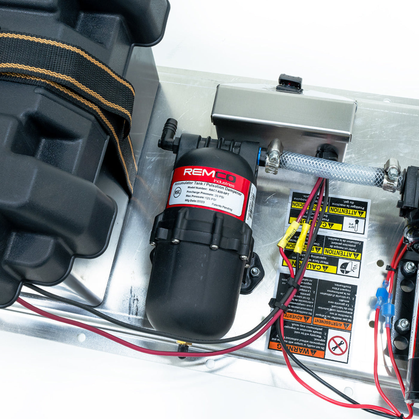 The basic skid plate mounted unit comes with a Remco pump, accumulator and switch. When you upgrade to the complete system, you get all those same features plus a proportioner, heavy-duty battery charger, hose reel and spray wand with nozzle