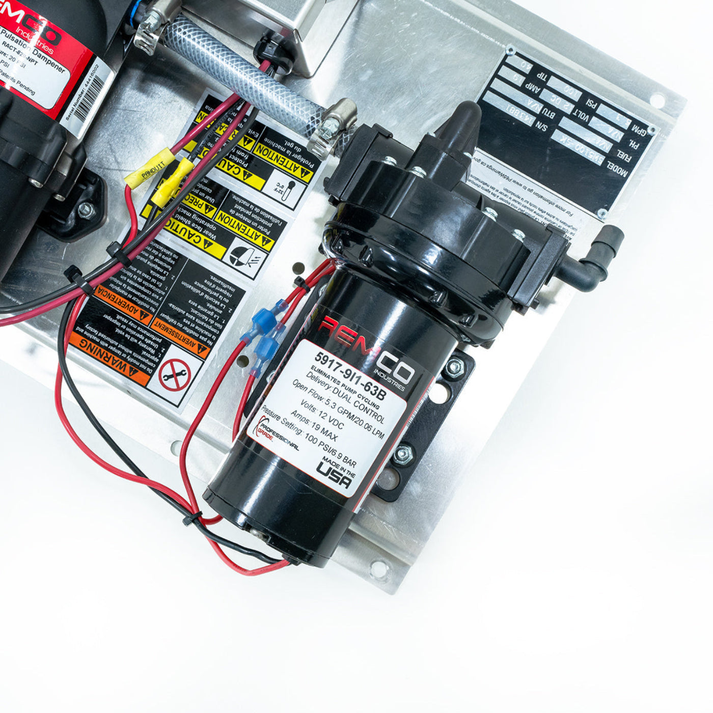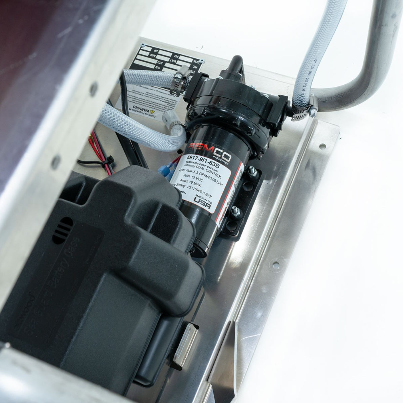 A: Equipped with a Remco 12V pump, known for reliability and chemical resistance.