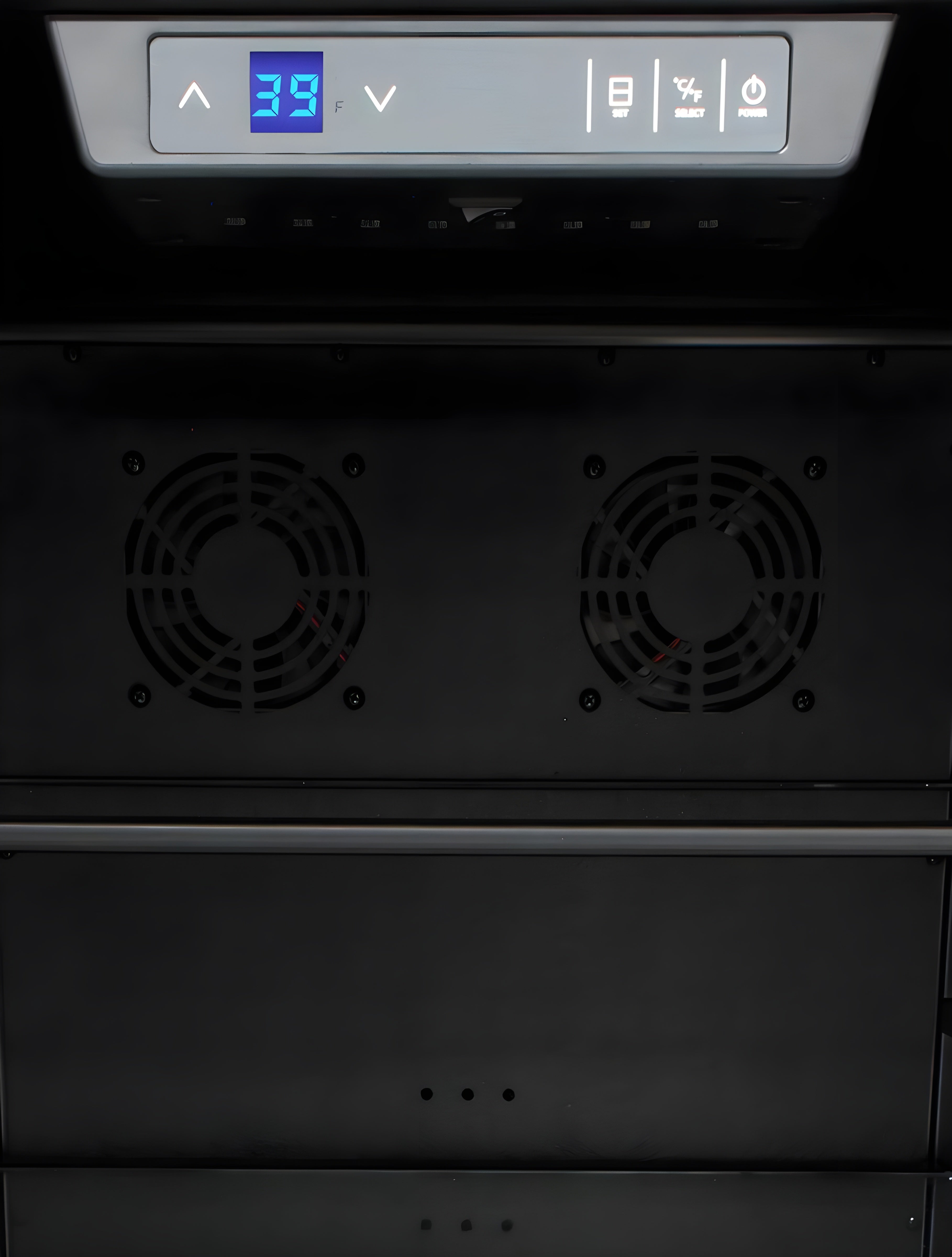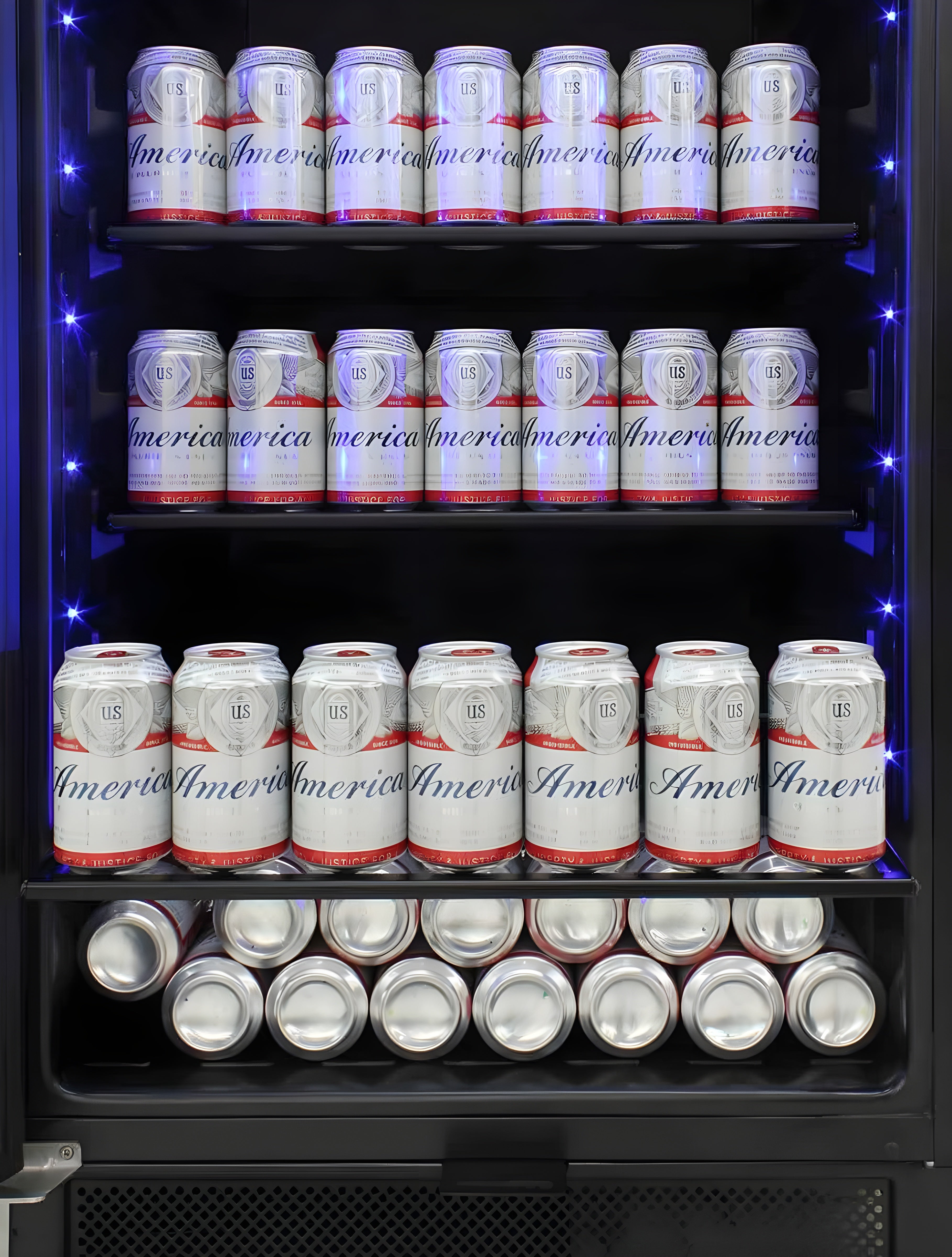 Set the right temperature for your beverages with simple digital buttons. The blue LED lighting illuminates the beverage cooler’s contents on both sides and top, while the tempered glass shelves let you display your collection of cans behind a glass door.
