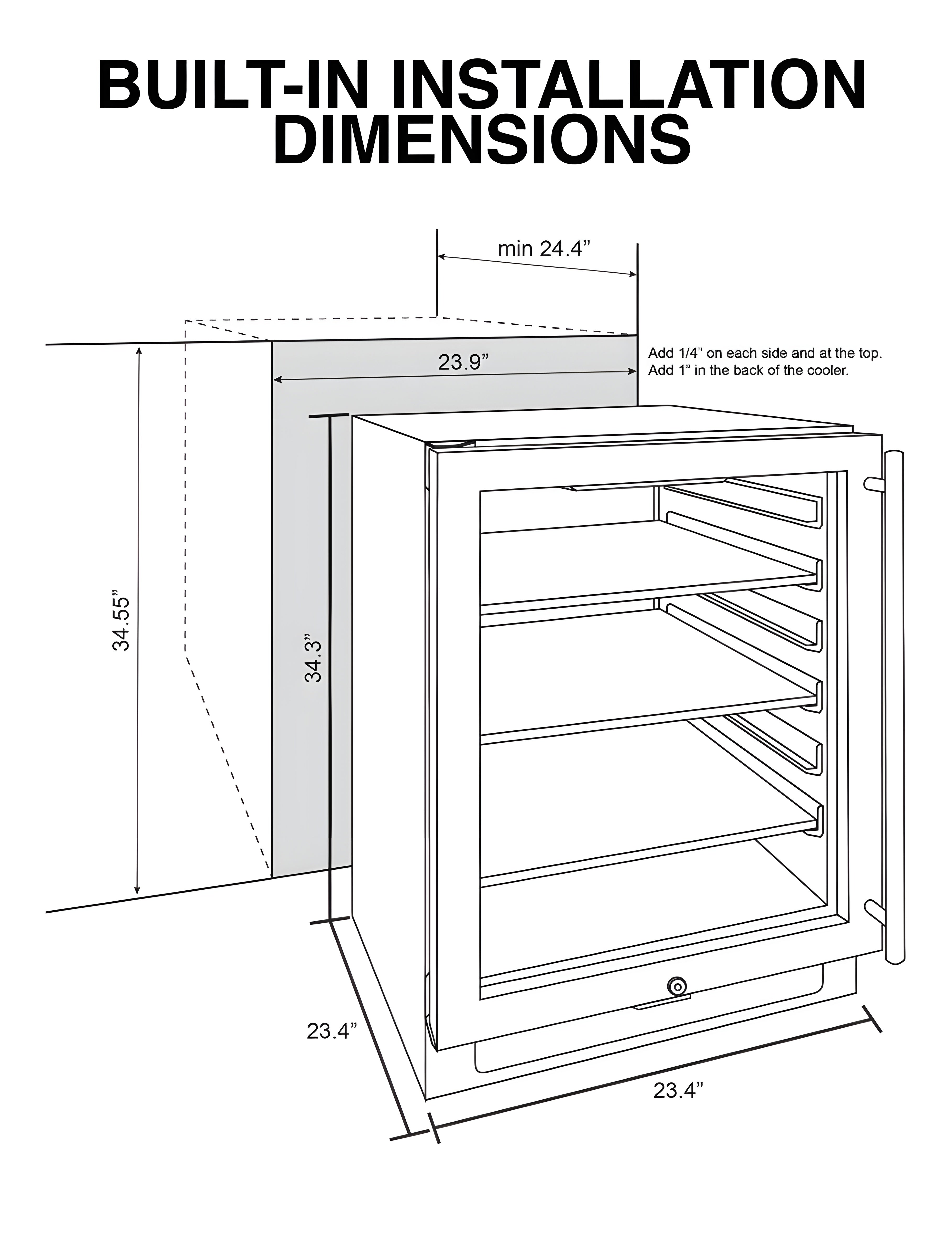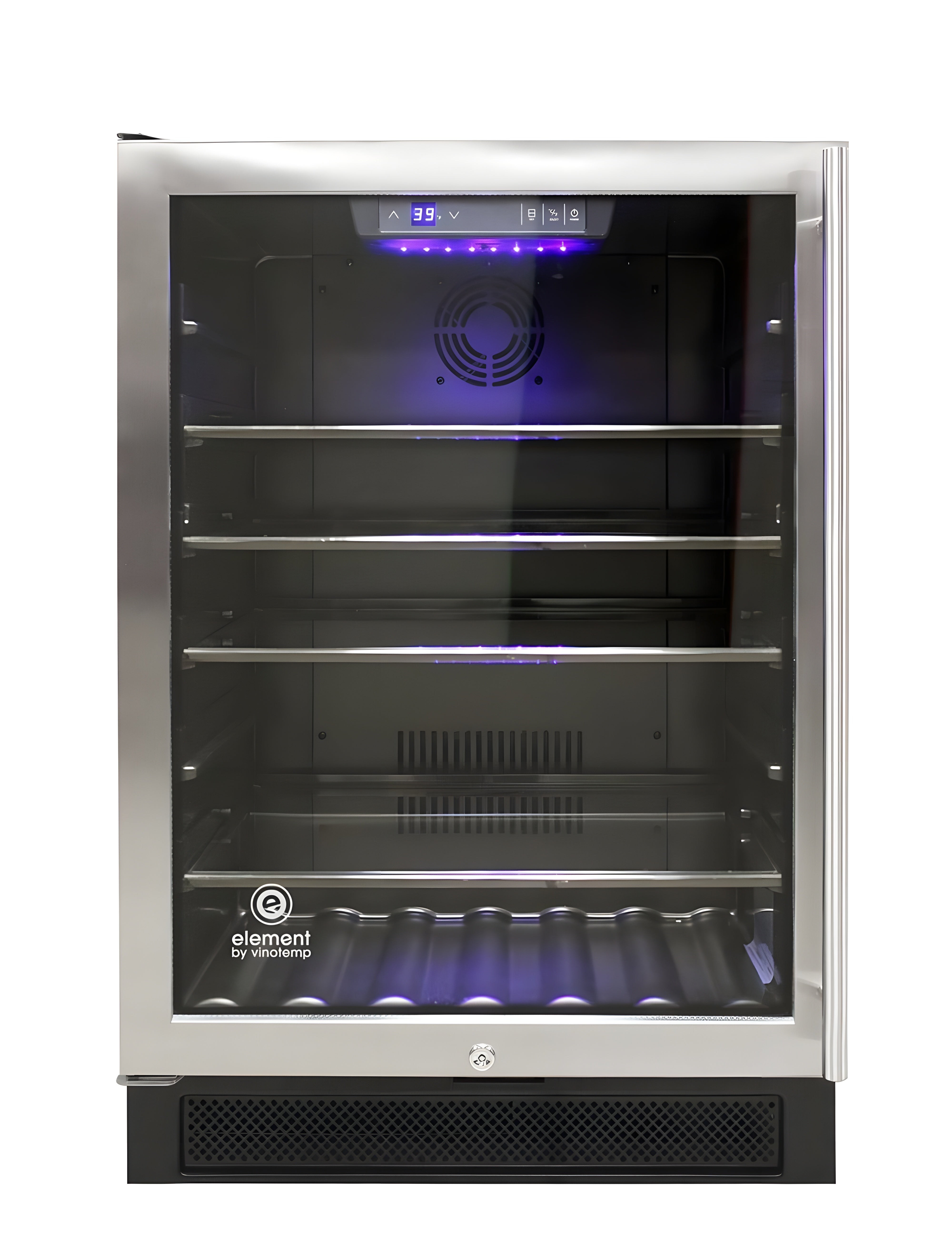 The Connoisseur Series 46 Single-Zone Beverage Cooler is an essential for those who love to entertain. Equipped with front exhaust, this beverage cooler is designed to fit seamlessly in existing cabinetry. The easy to use digital control panel makes adjusting the temperature simple while providing peace of mind that your beverages are always ready to be enjoyed. The blue LED lighting illuminates the cooler’s contents behind a seamless stainless steel door, making this beverage cooler an aesthetically pleasing addition to any room. Sliding tempered glass shelves holds approximately 161 12 oz. cans. Beautiful and functional, this beverage cooler is sure to be the centerpiece of get-togethers for years to come.