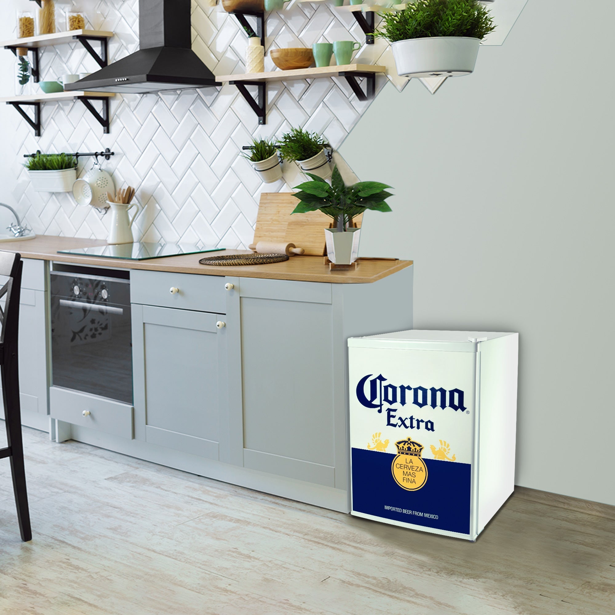 Licensed Corona Artwork: Celebrate your favorite beer or surprise your favorite beer-lover with this unique compact fridge featuring eye-catching Corona graphics and iconic blue, white, and gold color scheme