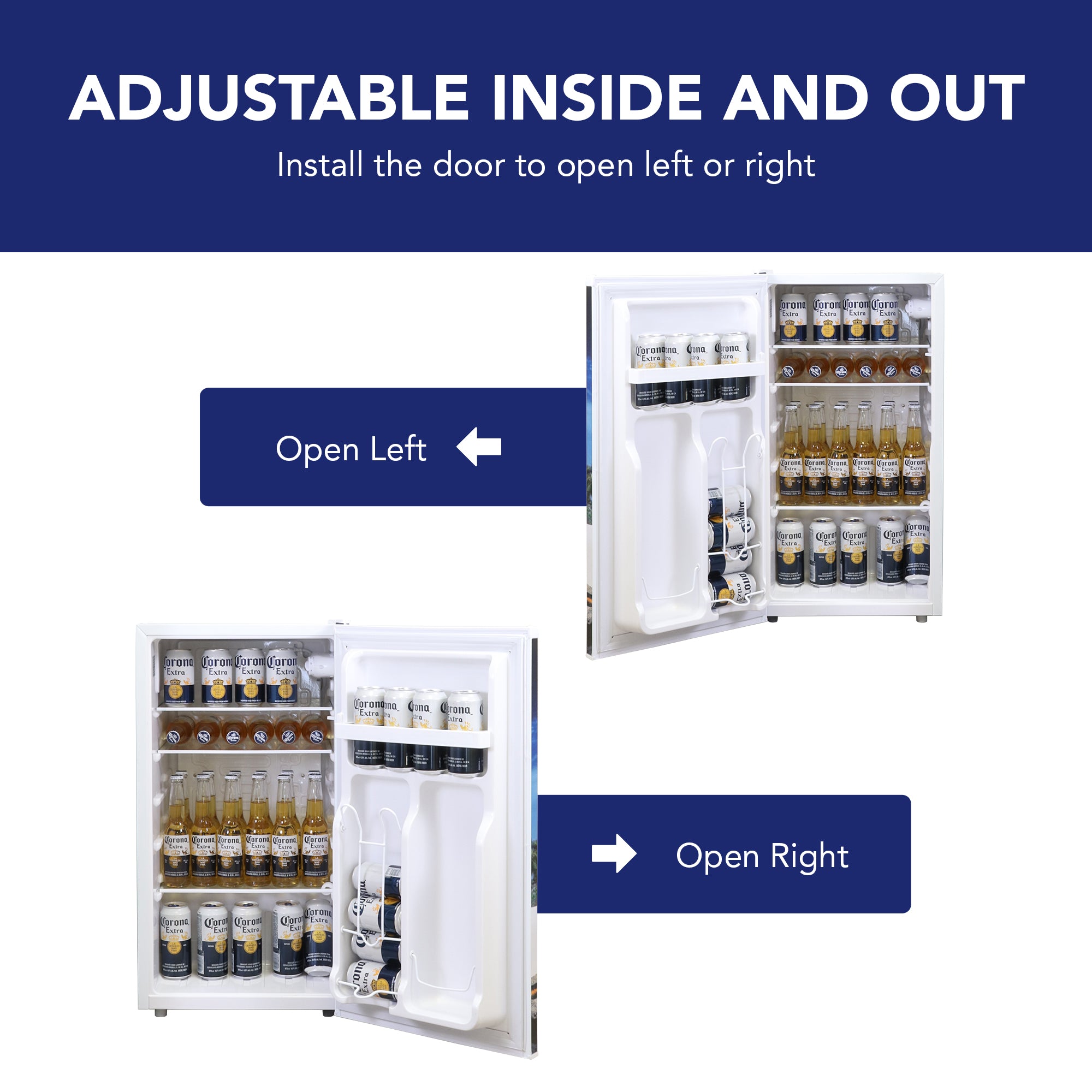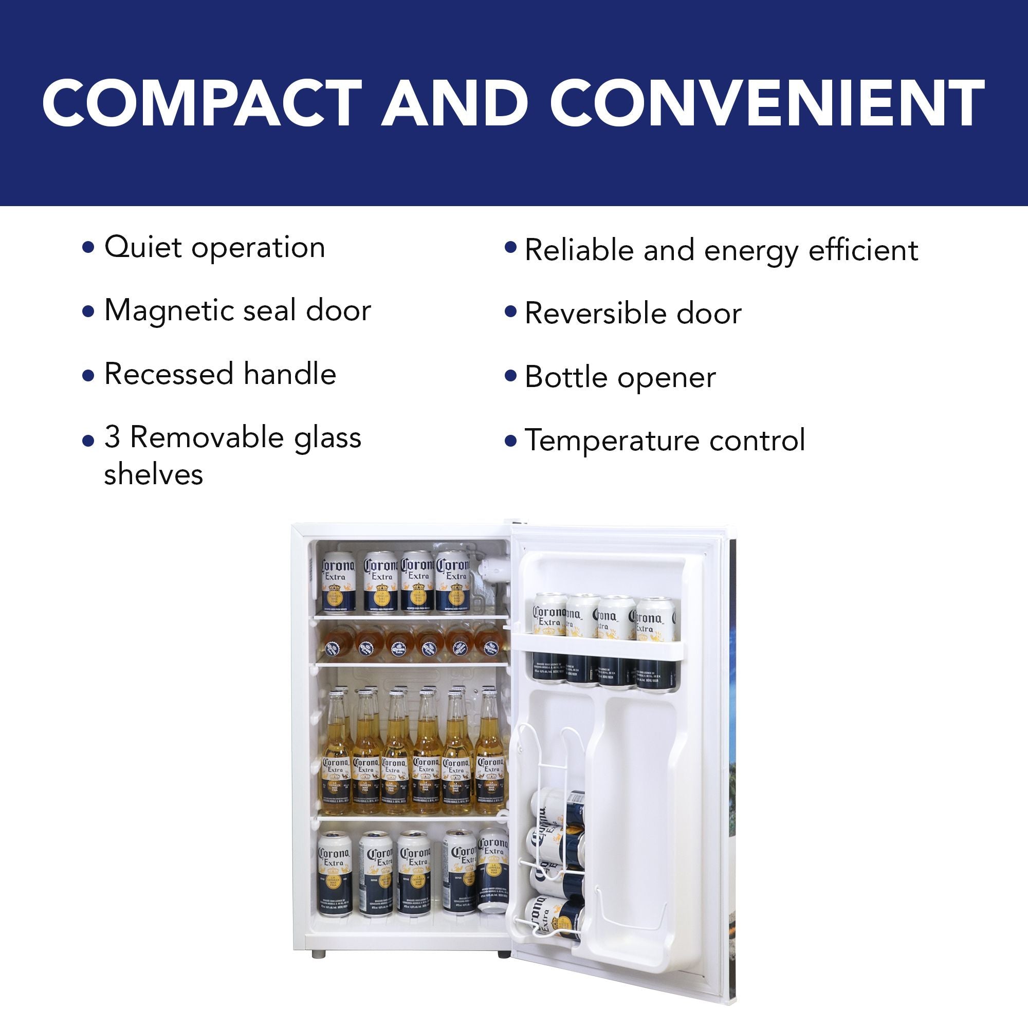 Celebrate Your Favorite Beer: Find your beach with this eye-catching bar fridge featuring licensed Corona graphics on the outside and an easy-to-clean classic white interior with plenty of room for your favorite beer!