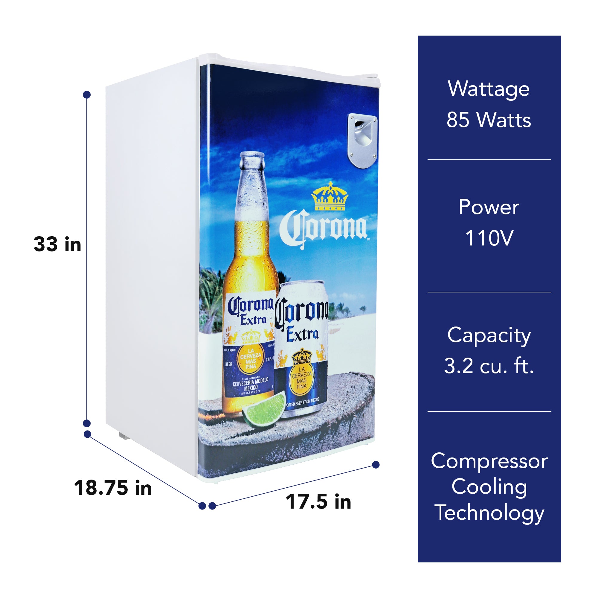Corona Compact Fridge w/ Bottle Opener, Tempered Glass Shelves, Licensed Corona Artwork, Perfect for Beer-Lovers -COR-90