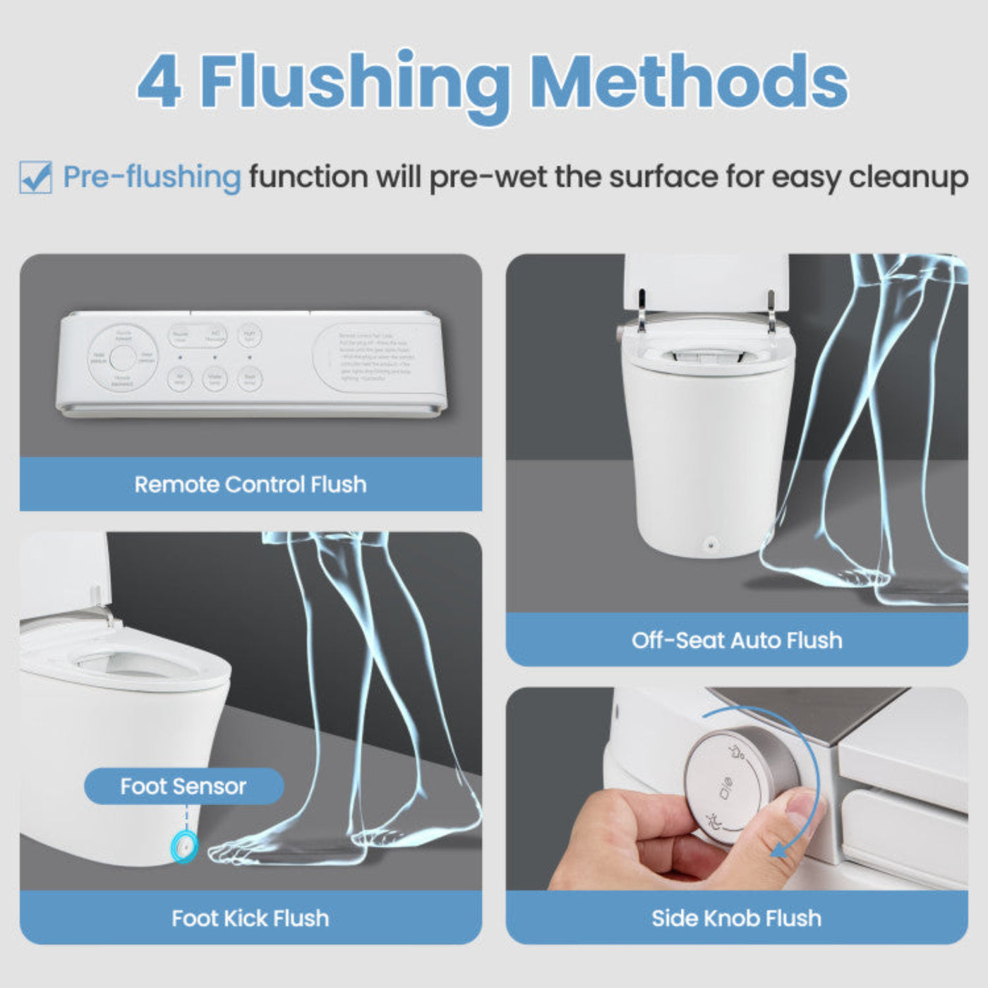 Multiple Flushing Options: This smart bidet toilet offers 4 flushing options for you: off-seat auto flash, foot kick flush, remote control flush and side knob flush. In addition, you can press the side knob to flush in case of power outages (1 x 9V battery needed).