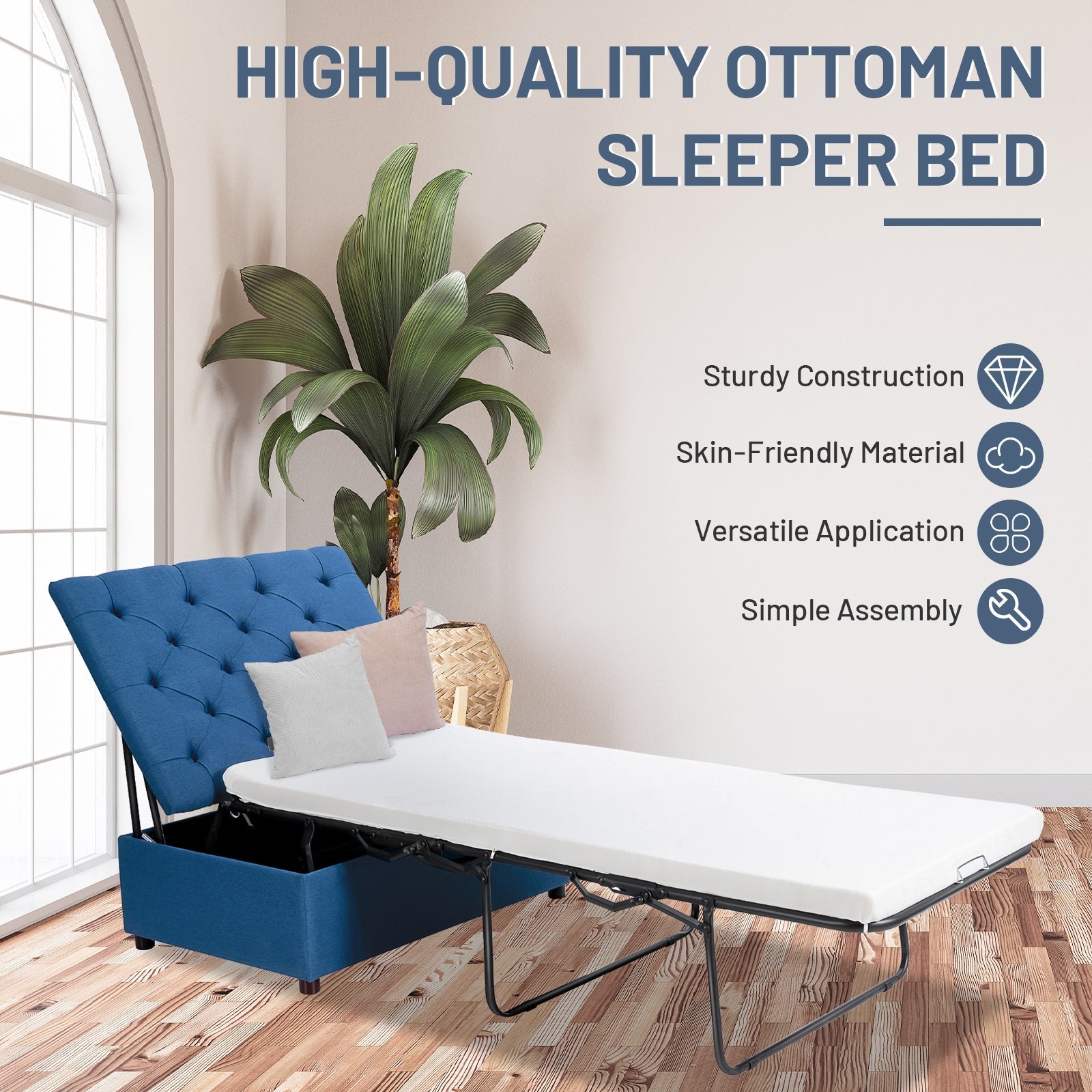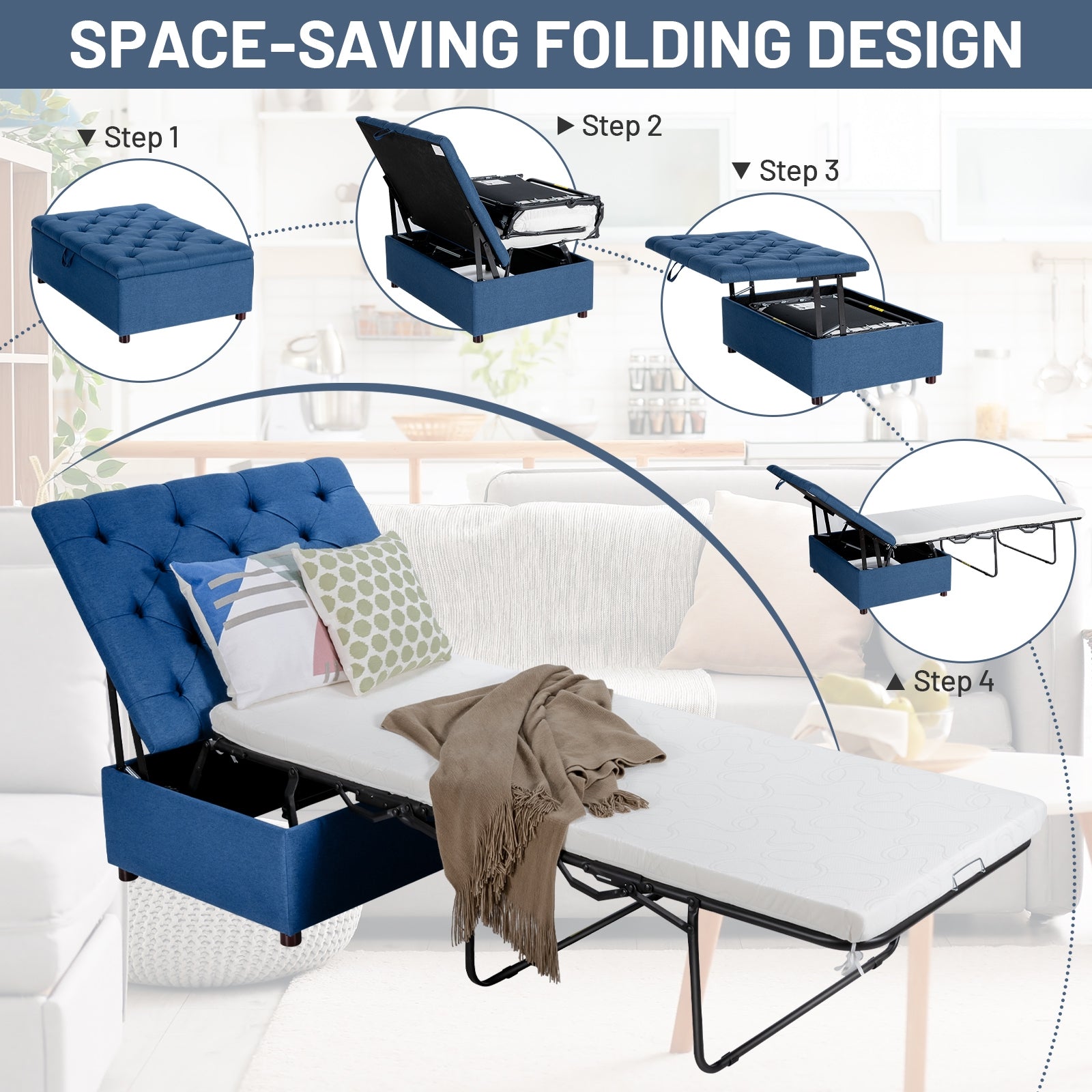 With its unique folding design, this ottoman is multi-functional as a bed or ottoman to meet your different needs. It is easy to fold and unfold with a simple pull; the steel frame with anti-slip foot pads ensures excellent reliability and sturdiness. This sleeper bed comes with a thick and soft mattress to support the neck and spine, while the padded seat cushion provides a comfortable sitting experience when used as an ottoman.