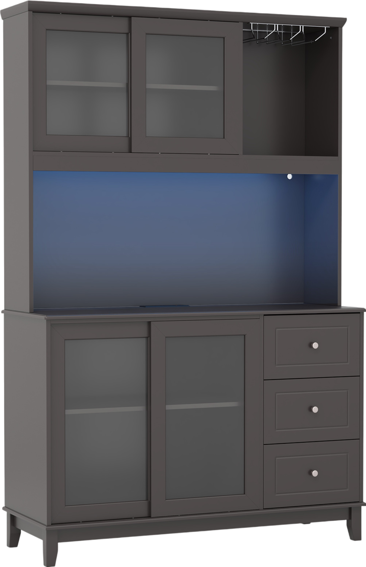 Sufficient Storage Space: The kitchen pantry storage cabinet is designed with 2 compartments with doors, an open compartment with wine glass holder, 3 deep drawers and a spacious countertop for all your kitchen necessities. The top of the cabinet can also be utilized as a storage shelf.