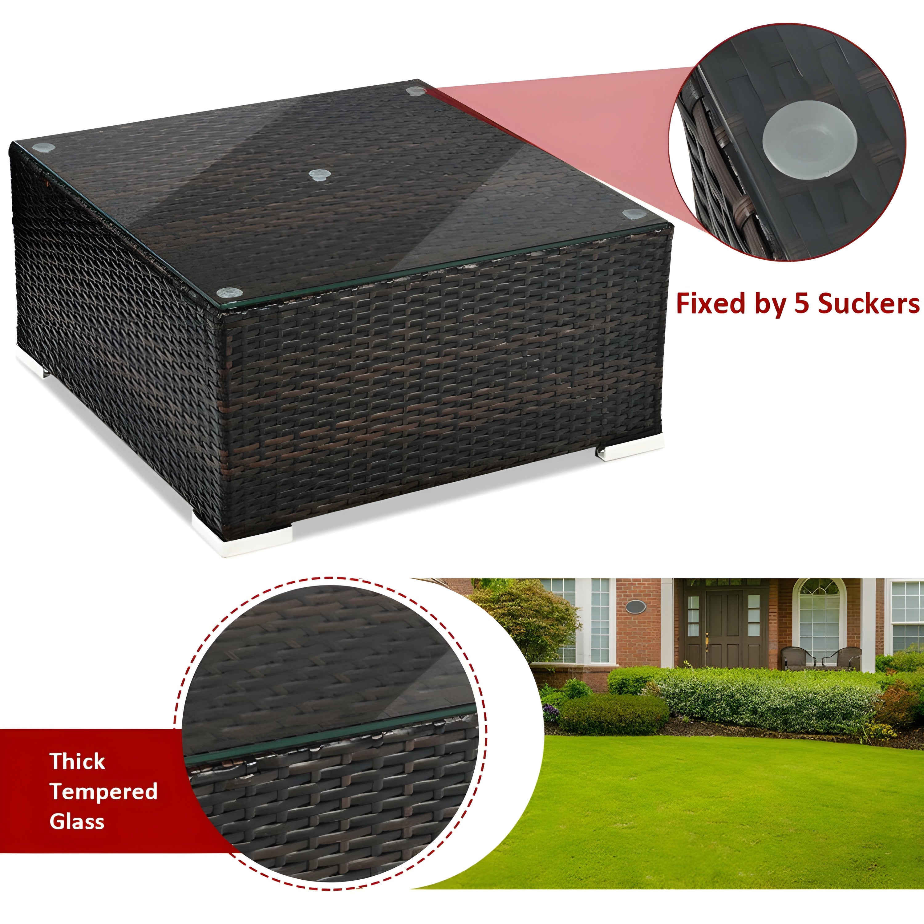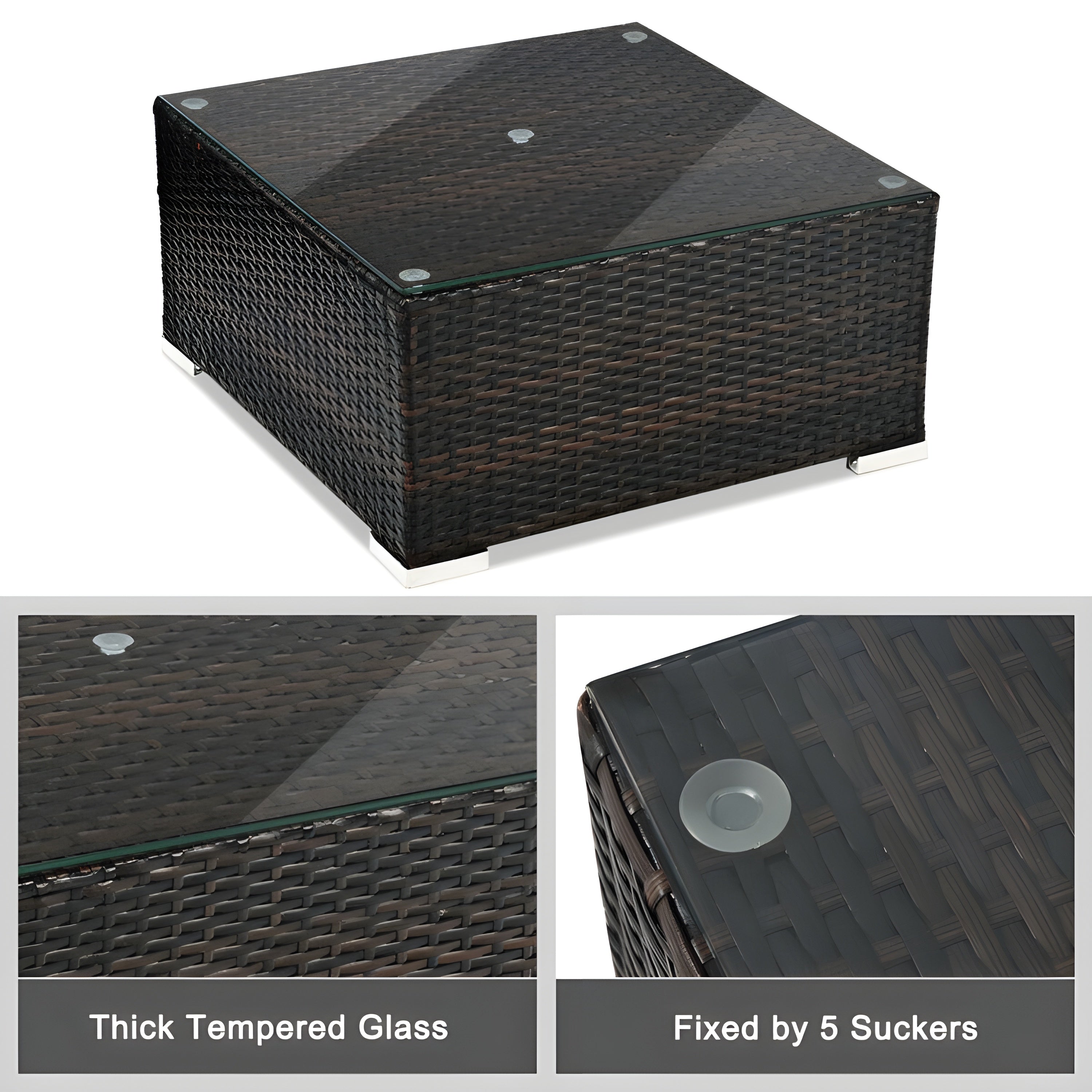 The Costway Rattan Sofa Set comfortably seats 4-6 people with soft cushions and wide armrests, perfect for indoor or outdoor use. The set includes a table with tempered glass secured by suctions and aluminum feet for added stability and protection. Made from durable PE rattan, it withstands moderate weather and is easy to assemble and clean with removable cushion covers.