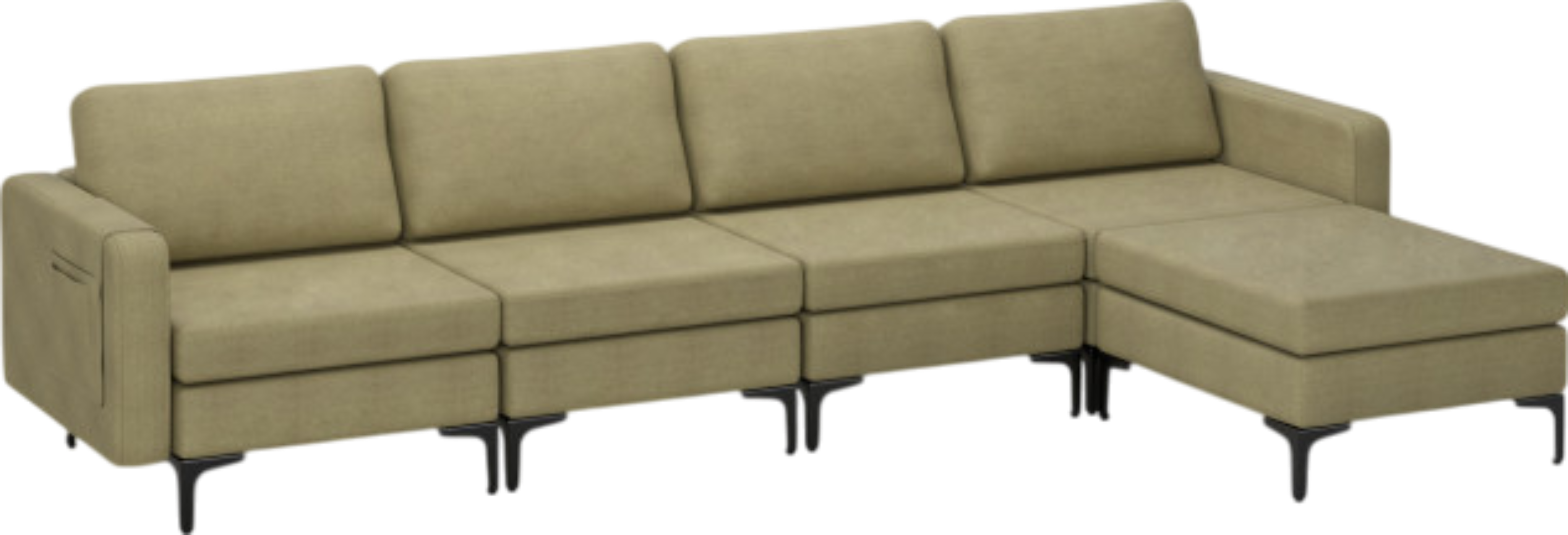 The Costway Modular L-Shaped Sofa features a sturdy steel and wood frame, non-slip metal legs, high-density sponge cushions, and a removable ottoman for customizable layouts. It includes a power outlet, USB ports, a hidden storage box, and a magazine caddy holder. The sofa ships in 4 packages that may not arrive on the same day.