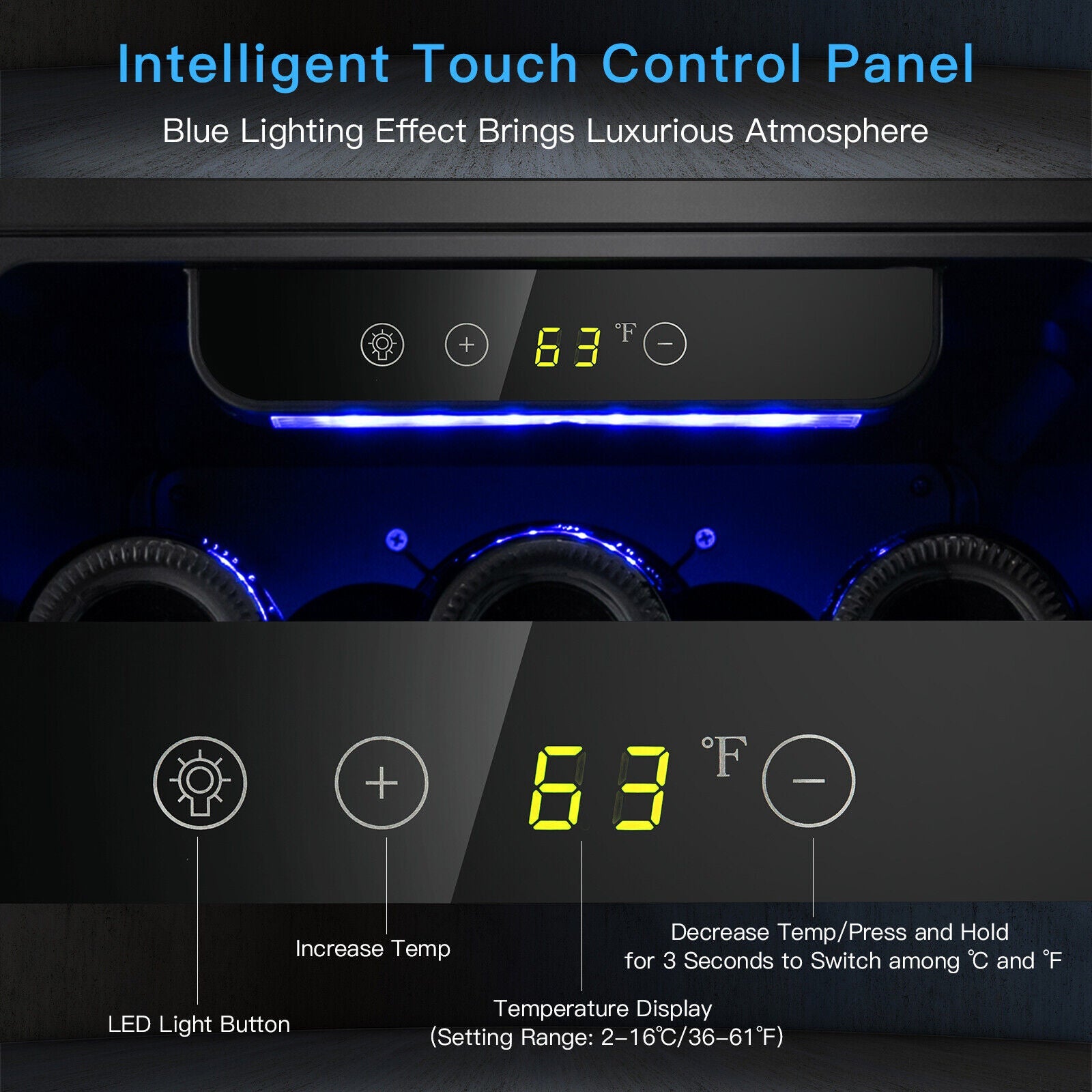 Smart Temperature Memory & Light Brightness: Smart digital control panel enables you to set the fridge to your preferred temperature between 36-61°F. What's more, it can restore the temperature history you set last time when restarted. With inner soft blue LED lighting which has a total/half brightness option, it's convenient to view wine at night.