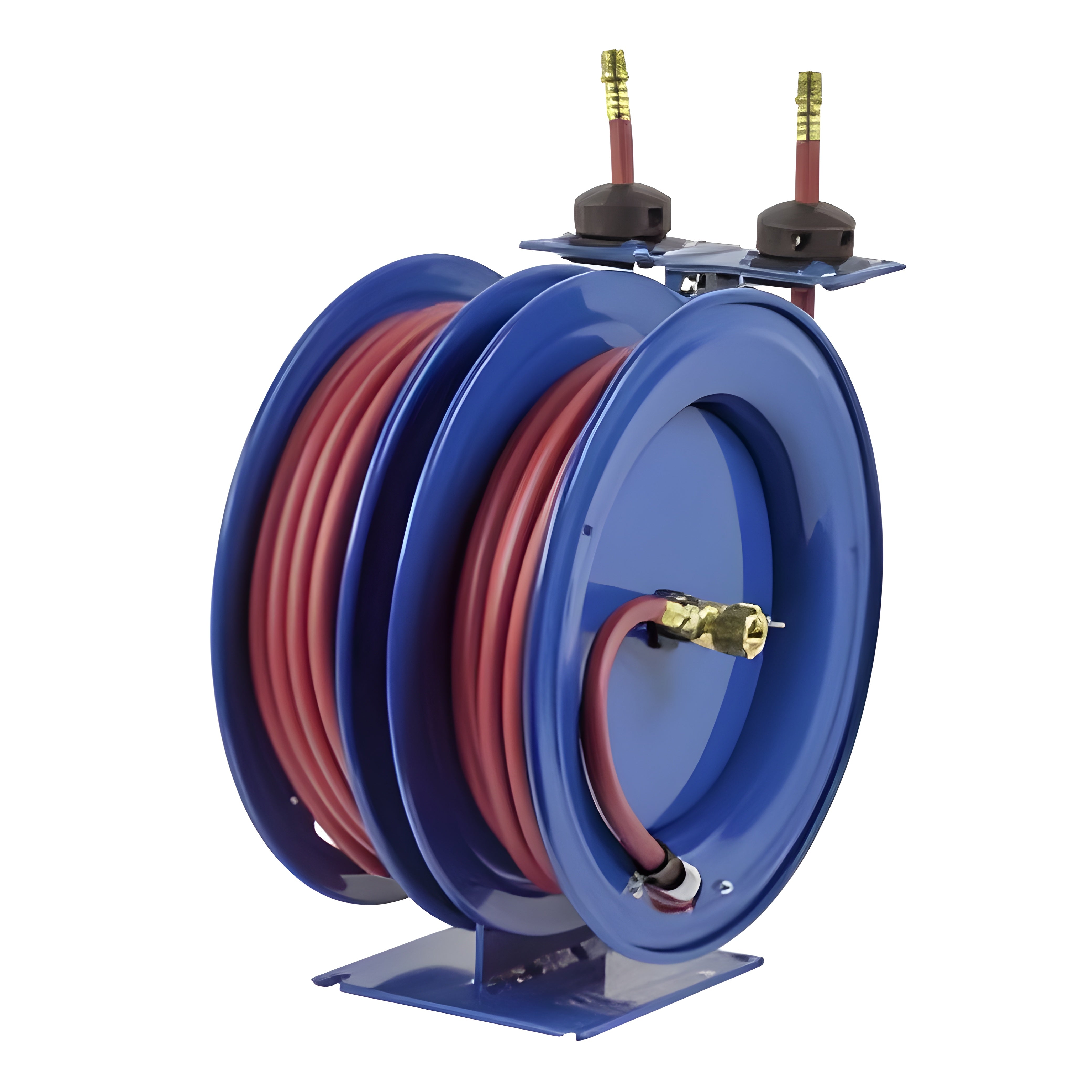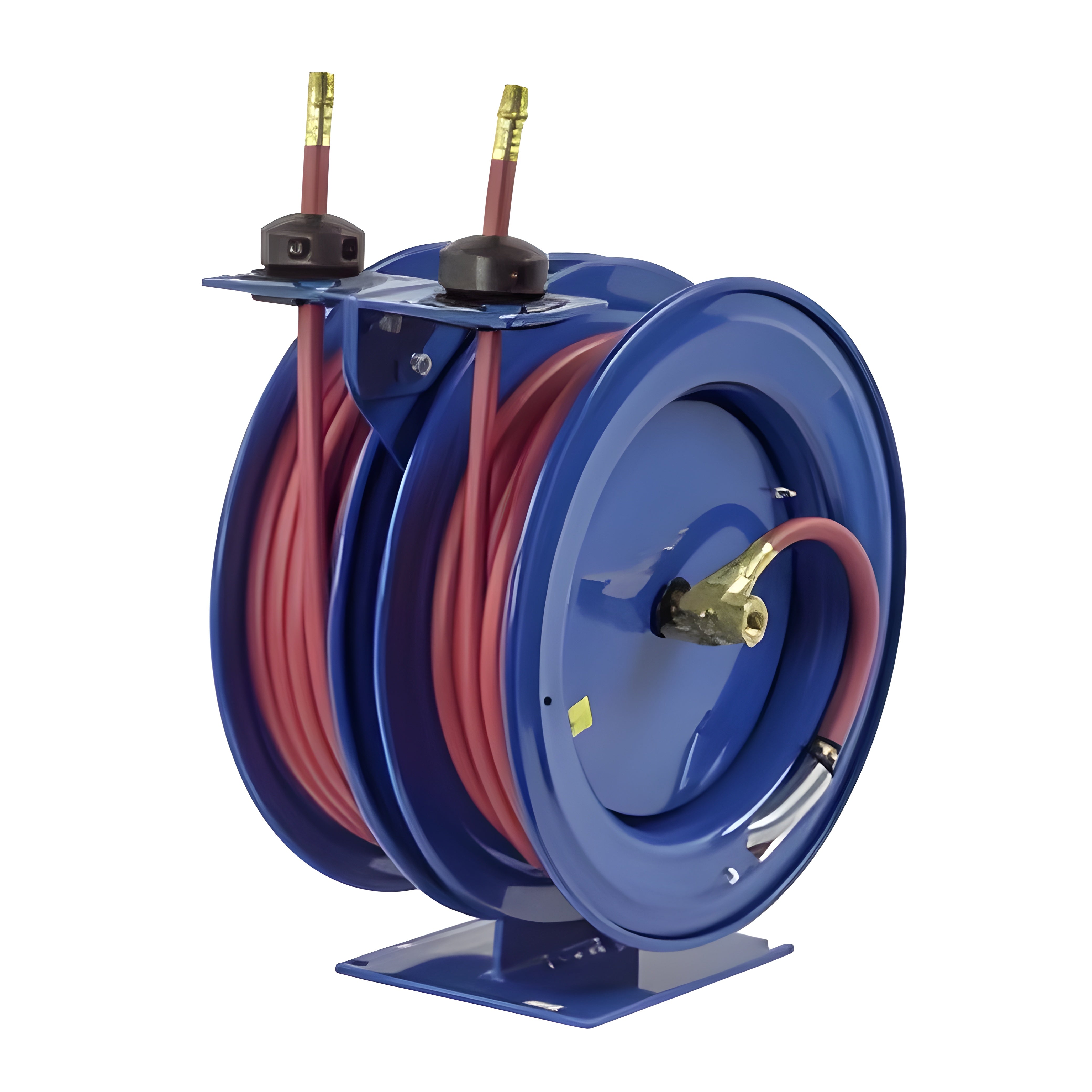 A: This reel is ideal for high-pressure fluid transfer in industries such as manufacturing, construction, automotive, and industrial cleaning, where dual hoses are required for operations.