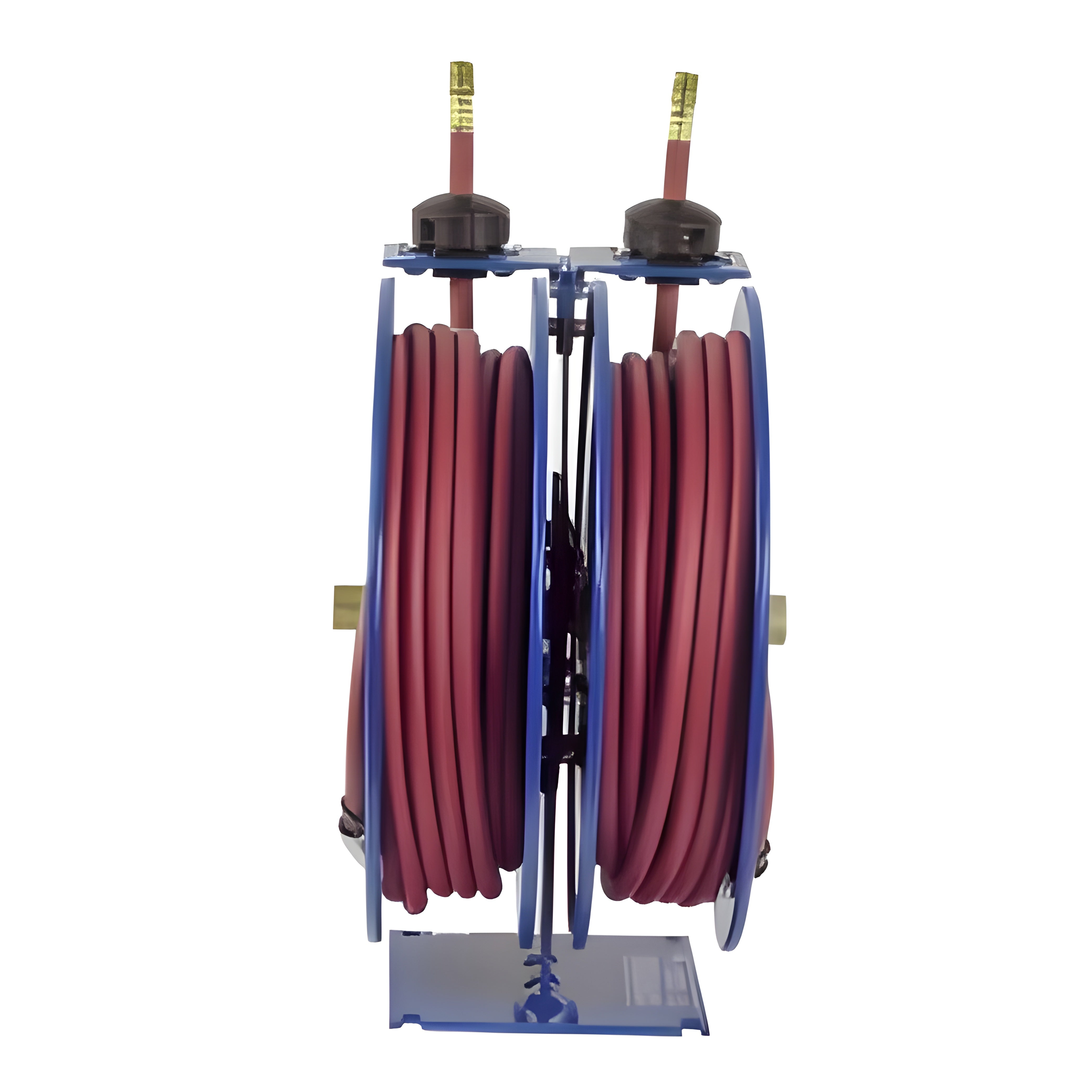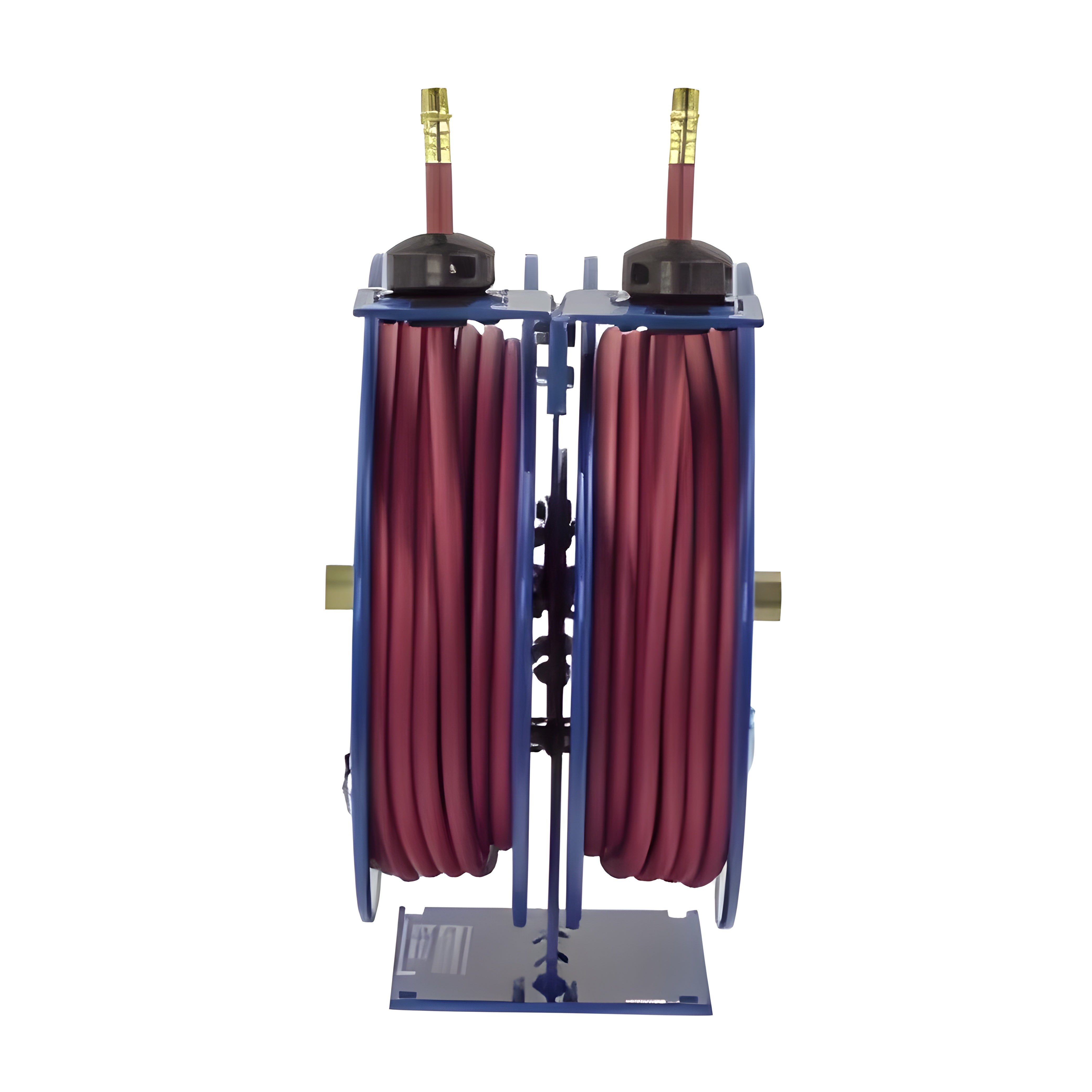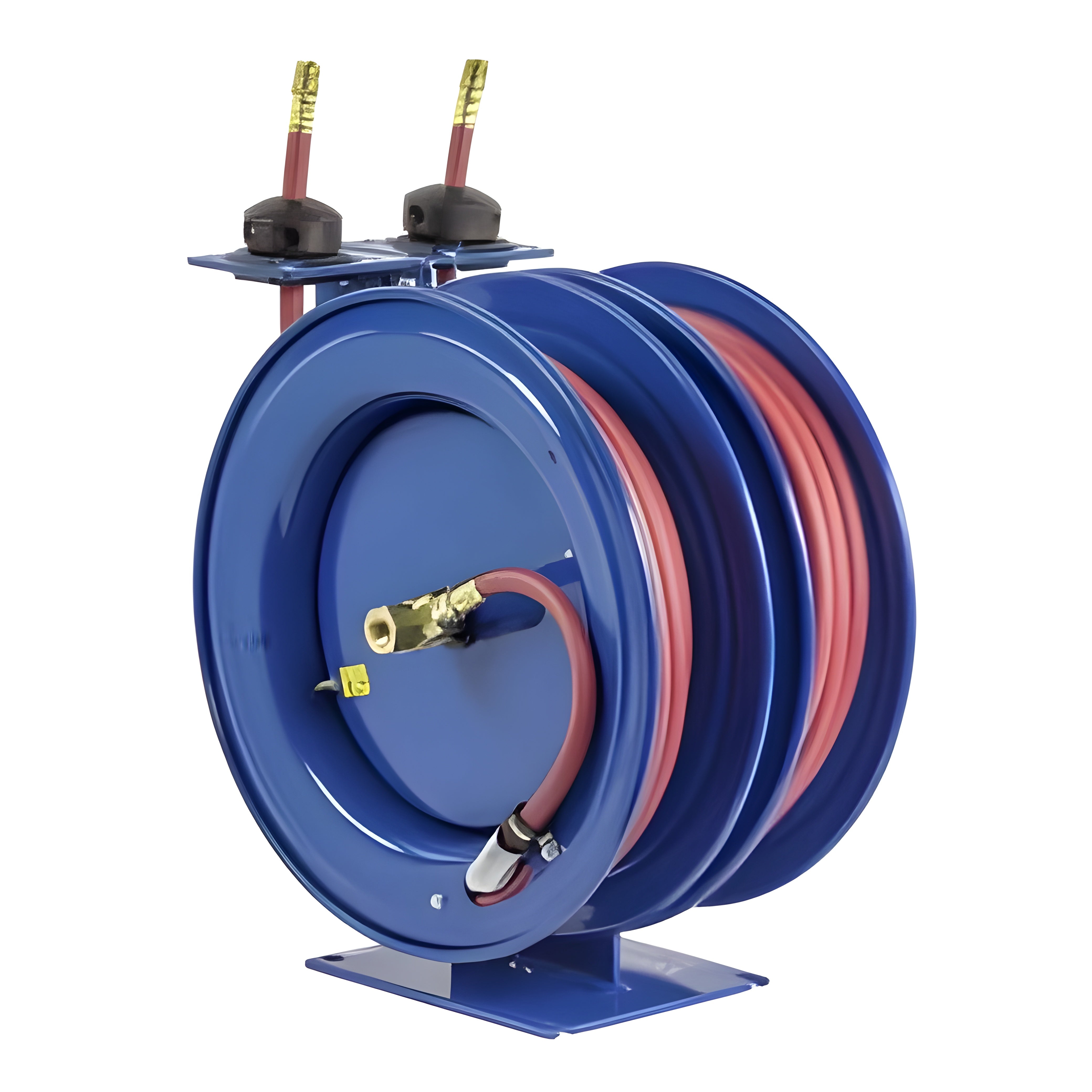 A: This reel is ideal for environments where dual low-pressure hoses need to be managed, such as in manufacturing, service trucks, agriculture, and industrial maintenance, where simultaneous fluid or air delivery is required.