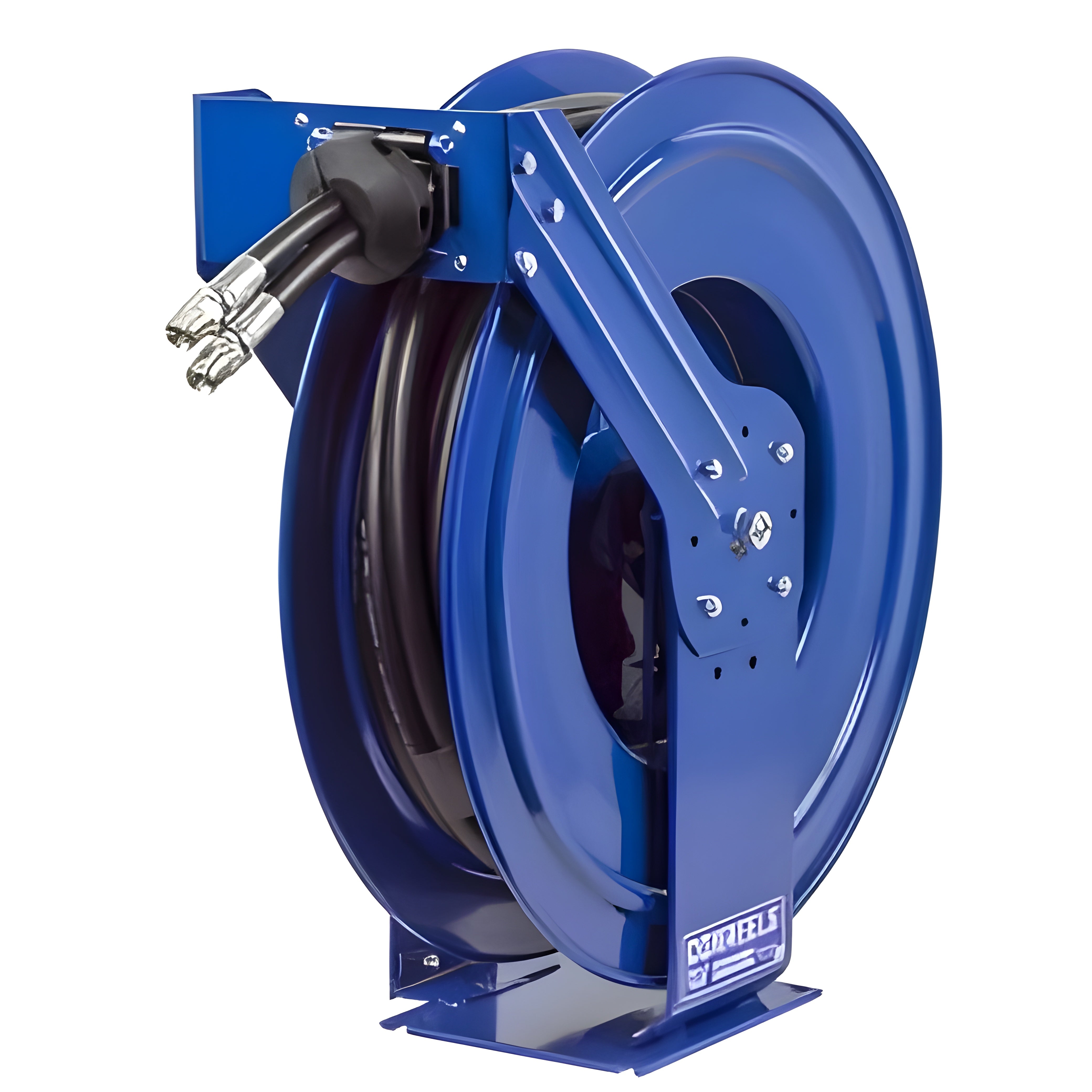 COXREELS MPD, TDMP and 1275HP Series "Dual Hydraulic" hose reels have similar features to their related series, but have been redesigned to handle dual hydraulic applications. Choose between spring driven retraction at 3,000 PSI to 50 feet and hand crank or motorized models at 10,000 PSI to 200 feet.