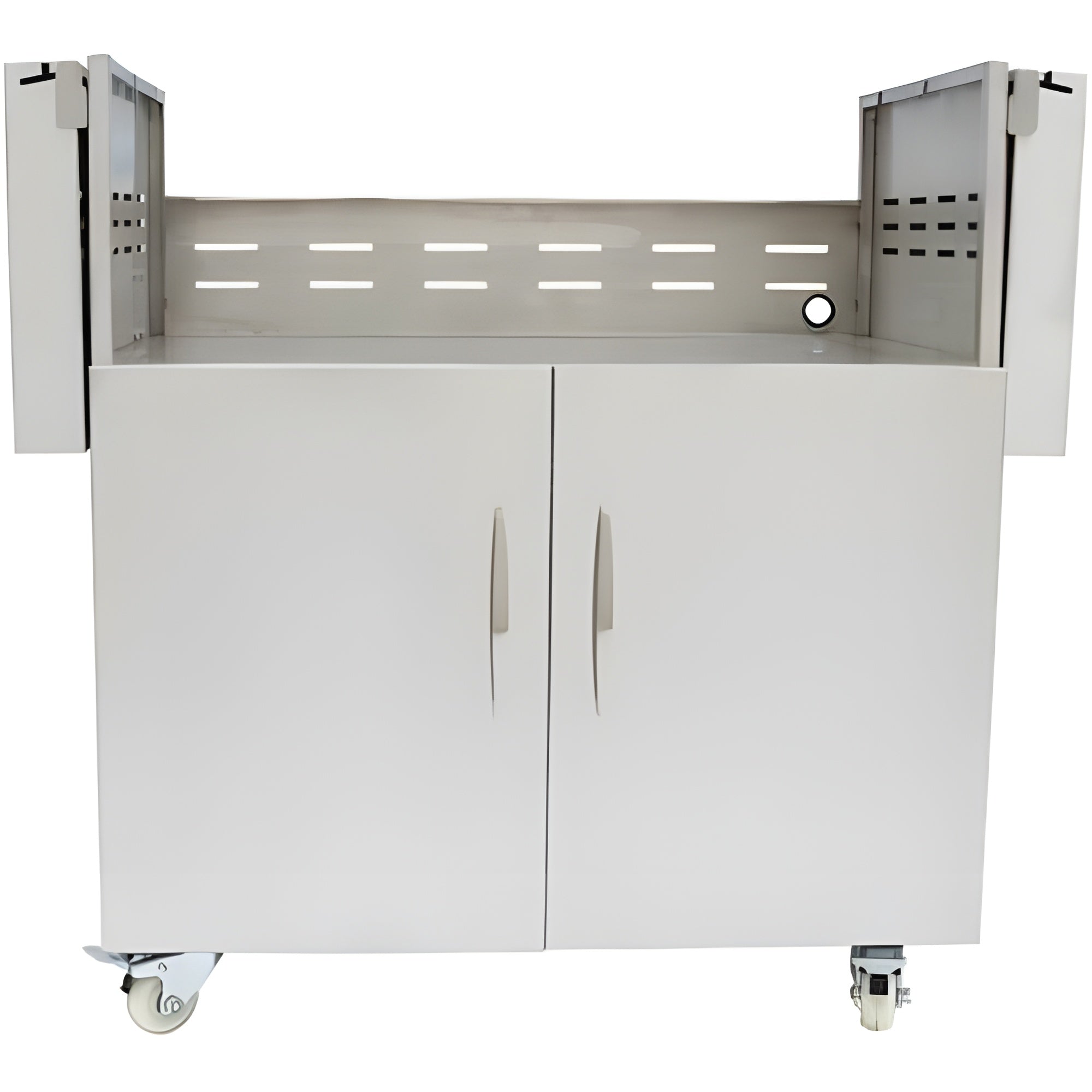 A: This is a premium stainless steel cart designed for outdoor cooking and storage, featuring self-closing door hinges, lockable casters, and fold-down shelving for convenience.