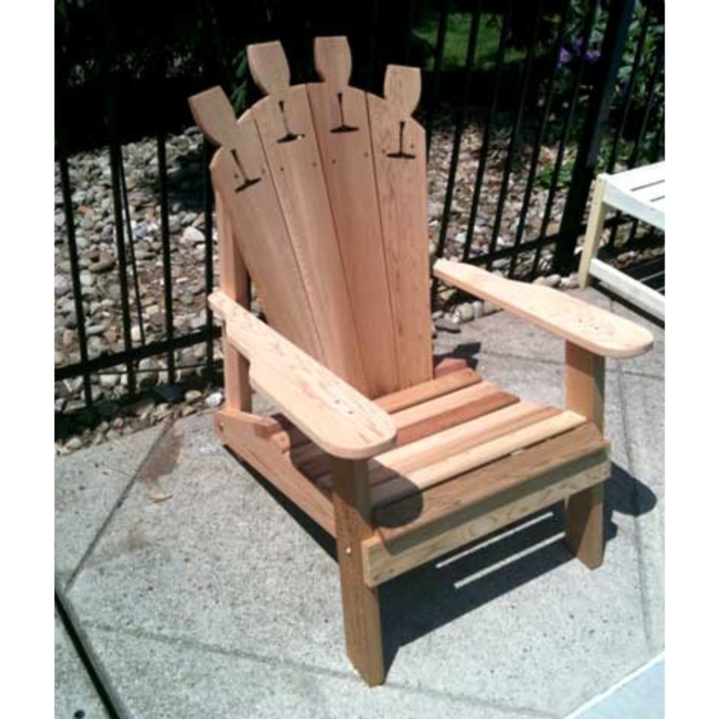 A: It’s a handcrafted Adirondack chair made from premium Western red cedar, featuring built-in wine glass holders on the armrests for added convenience and charm.