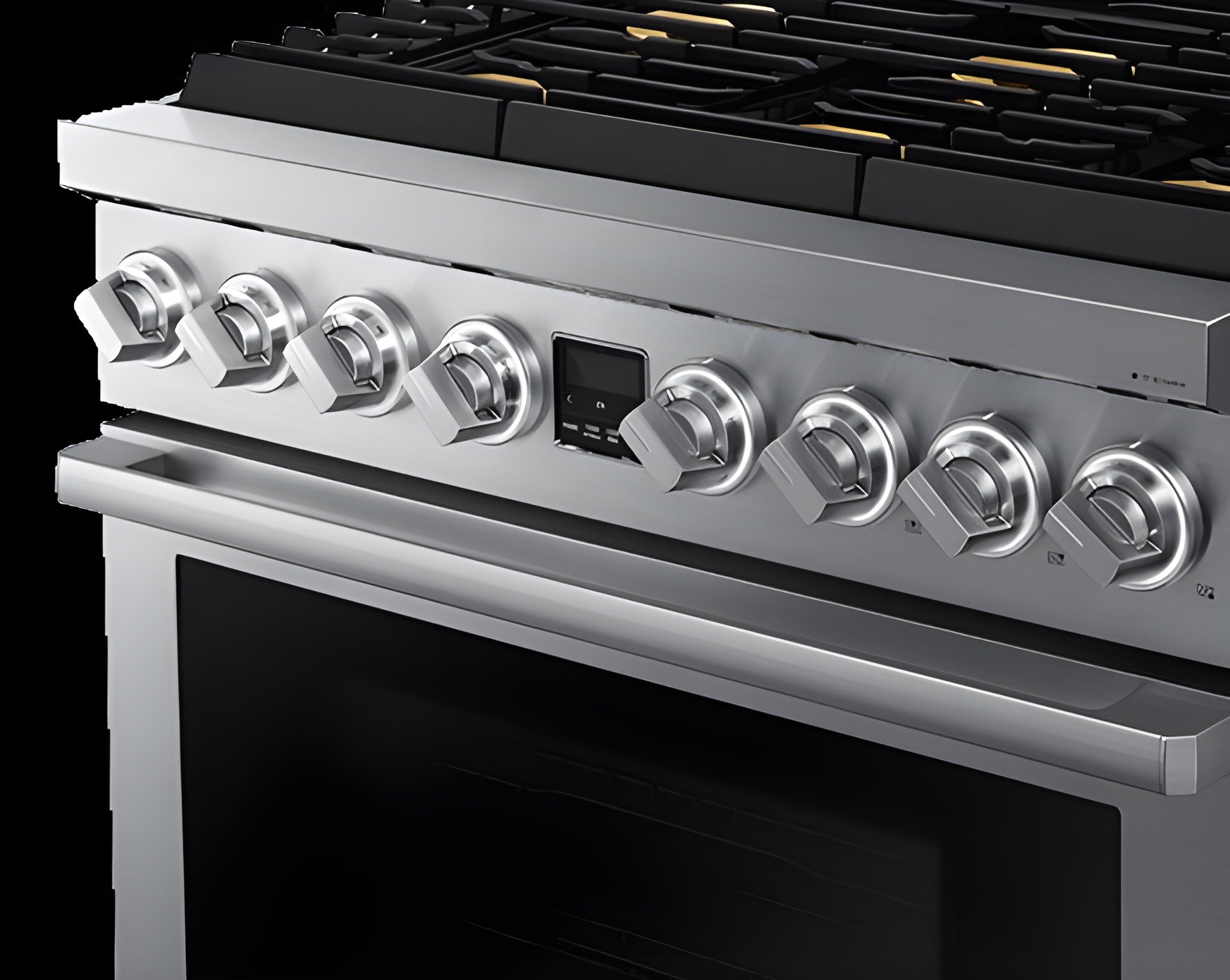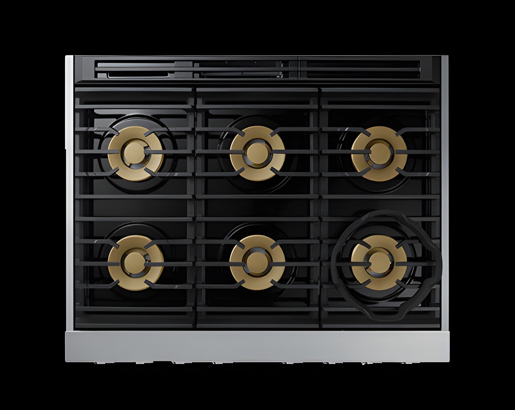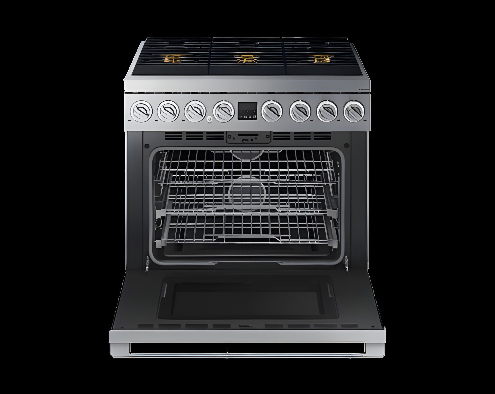 The 36" Gas Range boasts solid brass dual stack burners with an output of 22,000 BTU's and an extra large capacity oven which can accommodate multiple dishes with 5.9 cubic feet of space. Dual Three-Part Pure Convection reduces cooking time with superb consistency of zero flavour transfer. Combine all this performance with a Wi-Fi enabled 2.25" OLED touch control panel allowing SmartThings integration for communication between appliances as well as monitoring and operating remotely.
