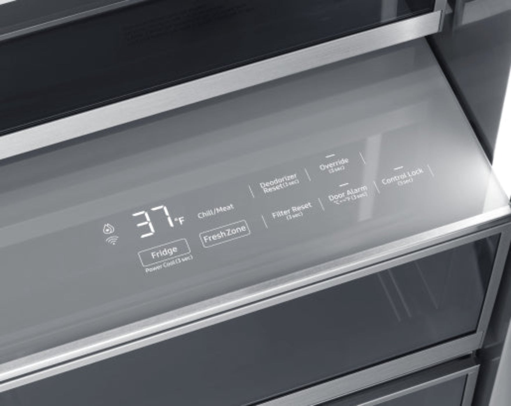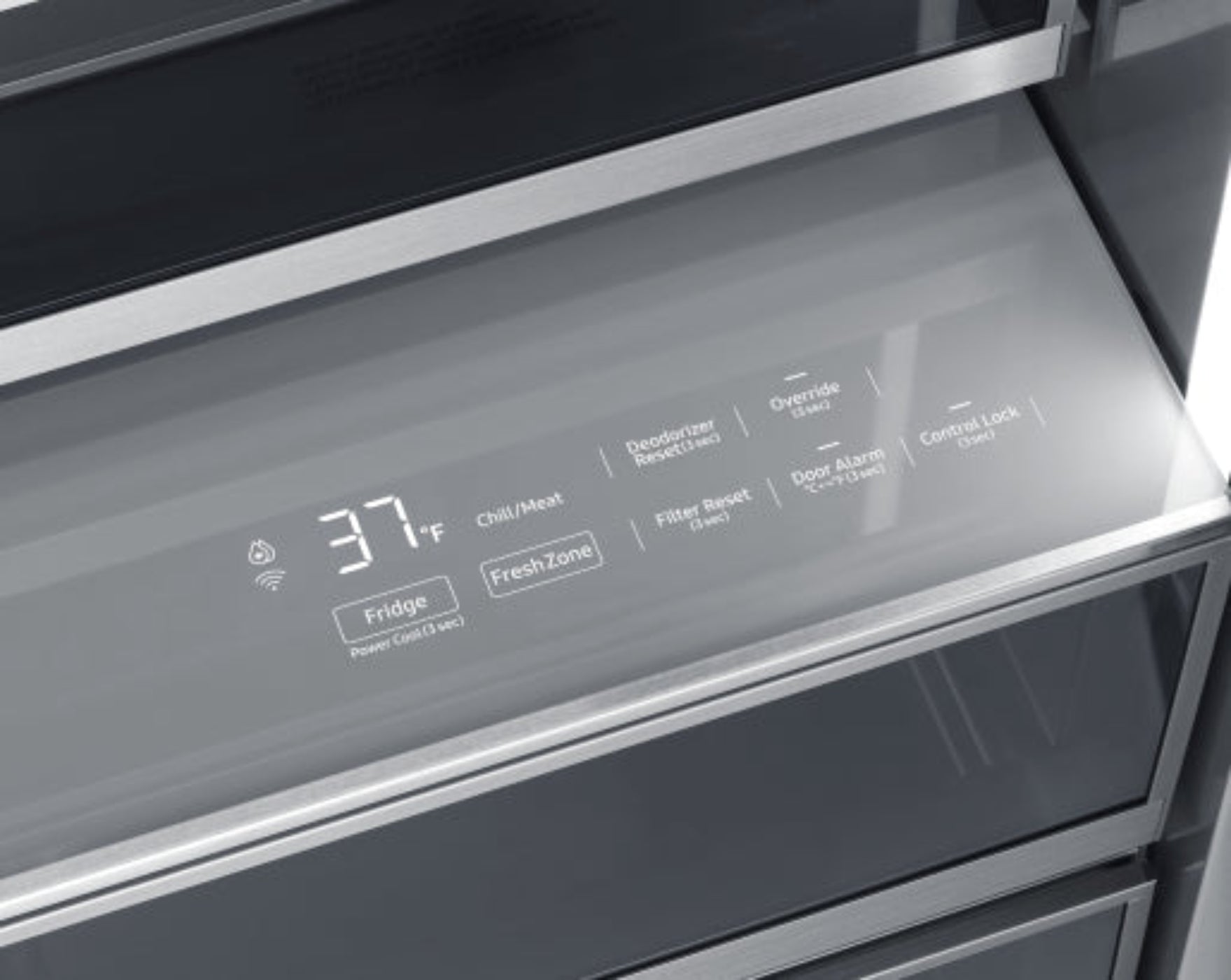 Interior Configuration | Full Width Shelves: 4 ea Shelf Material: Tempered Glass, Metal Trim, Spill-Proof Full Extension Drawers at 90° Door Opening Angle: Yes FreshZone Drawer: Yes - Cheese (37°F) / ColdDrinks (33°F) / Meat (29°F) Humidity Control Drawer: 2 ea Door Bins: 4 ea |