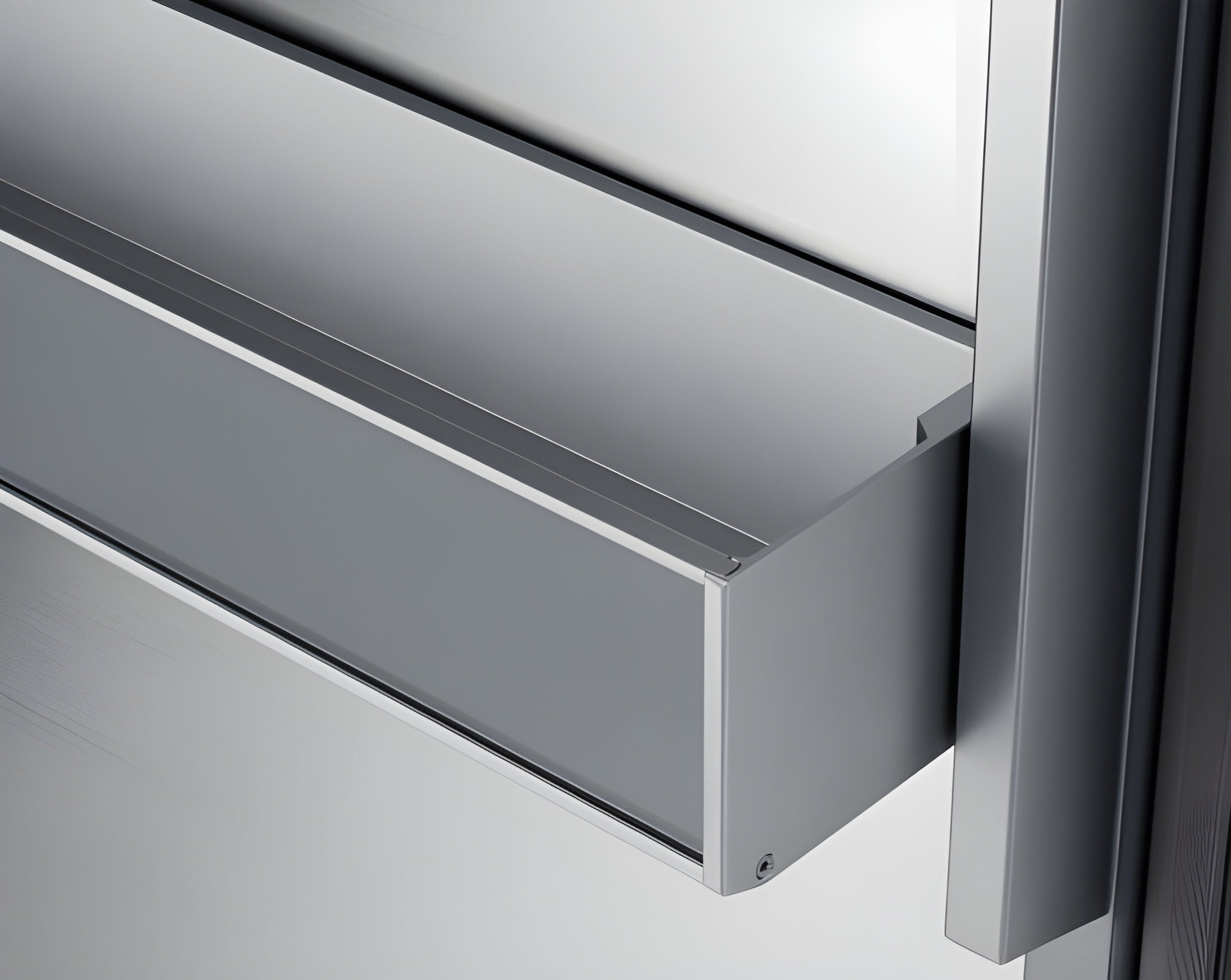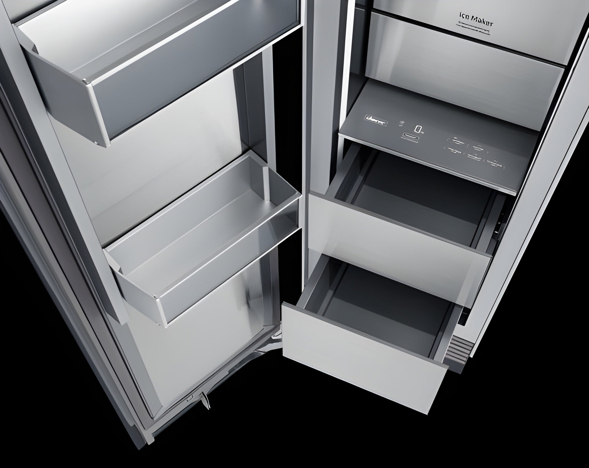 Interior Configuration | Full Width Shelves: 3 ea Shelf Material: Tempered Glass, Metal Trim, Spill-Proof Full Extension Drawers at 90° Door Opening Angle: Yes Hidden Box with Flip-up Cover: No Freezer Drawer: 2 ea Door Bins: 4 ea |
