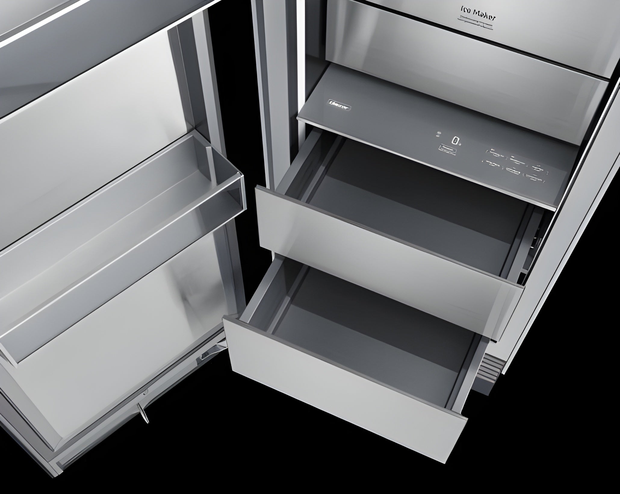 Interior Configuration | Full Width Shelves: 3 ea Shelf Material: Tempered Glass, Metal Trim, Spill-Proof Full Extension Drawers at 90° Door Opening Angle: Yes Hidden Box with Flip-up Cover: Yes Freezer Drawer: 2 ea Door Bins: 4 ea |