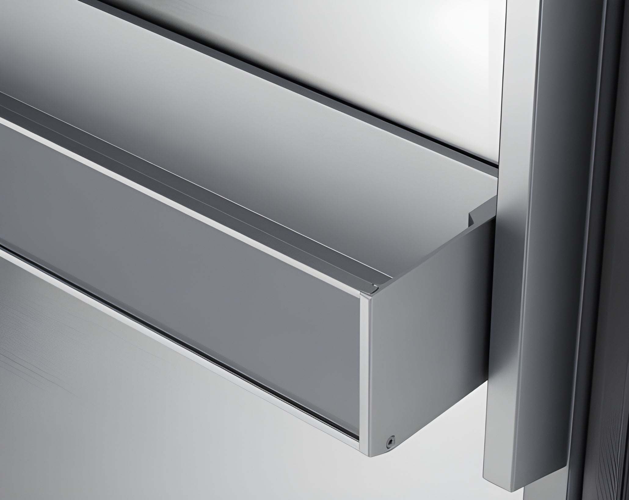 Interior Configuration | Full Width Shelves: 3 ea Shelf Material: Tempered Glass, Metal Trim, Spill-Proof Full Extension Drawers at 90° Door Opening Angle: Yes Hidden Box with Flip-up Cover: Yes Freezer Drawer: 2 ea Door Bins: 4 ea |