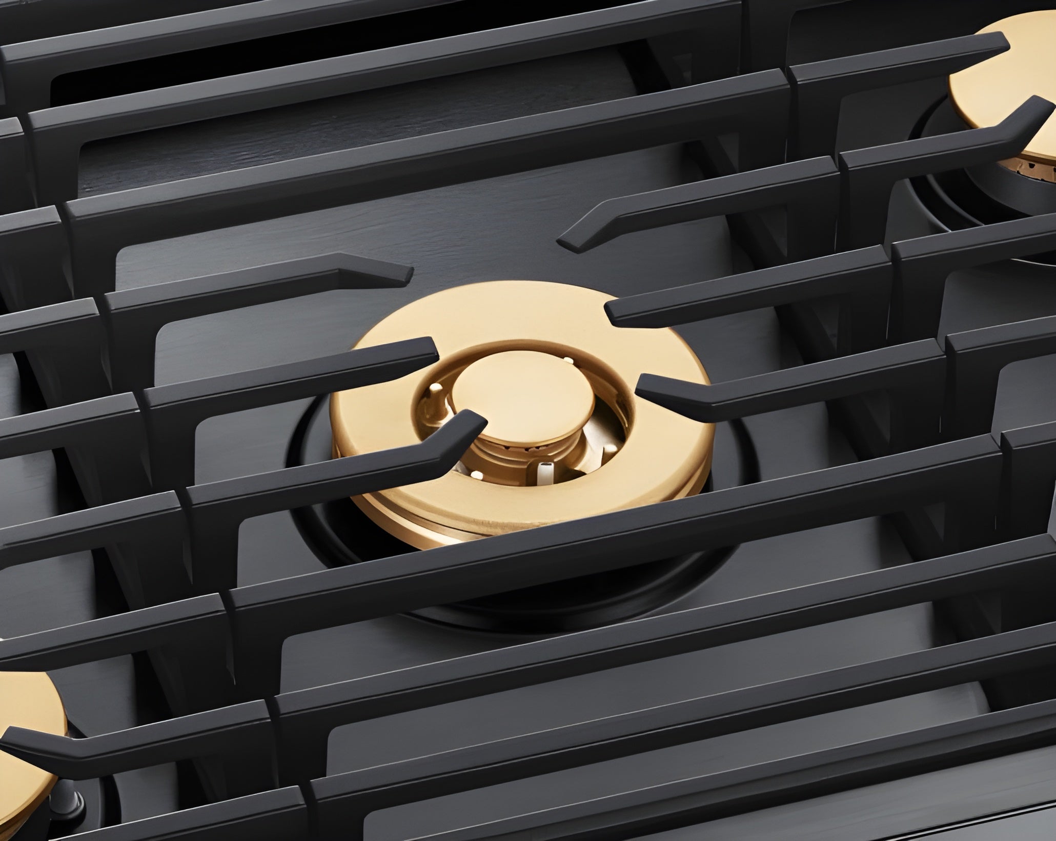 Our Gas Cooktops are designed to stand out while seamlessly integrating into the countertop. Finished in an easy-to-clean, heat-resistant, diamond-like carbon coating, and equipped with a central dual-stack, sealed brass burner for powerful performance and control.