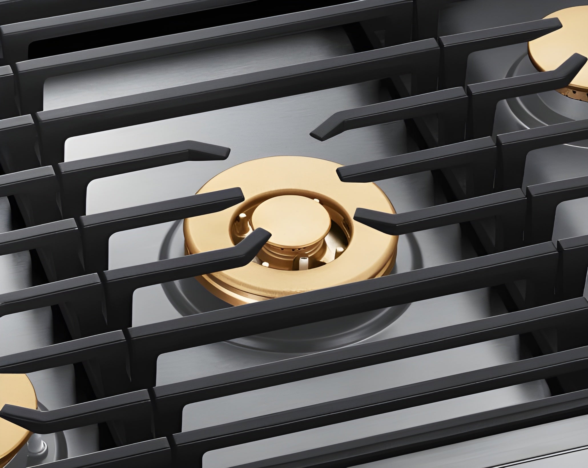 Our Gas Cooktops are designed to stand out while seamlessly integrating into the countertop. Finished in an easy-to-clean, heat-resistant, diamond-like carbon coating, and equipped with a central dual-stack, sealed brass burner for powerful performance and control.