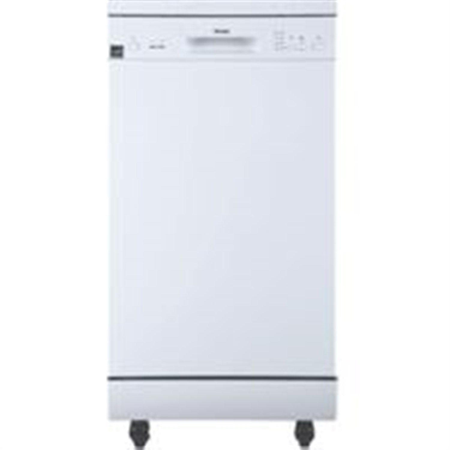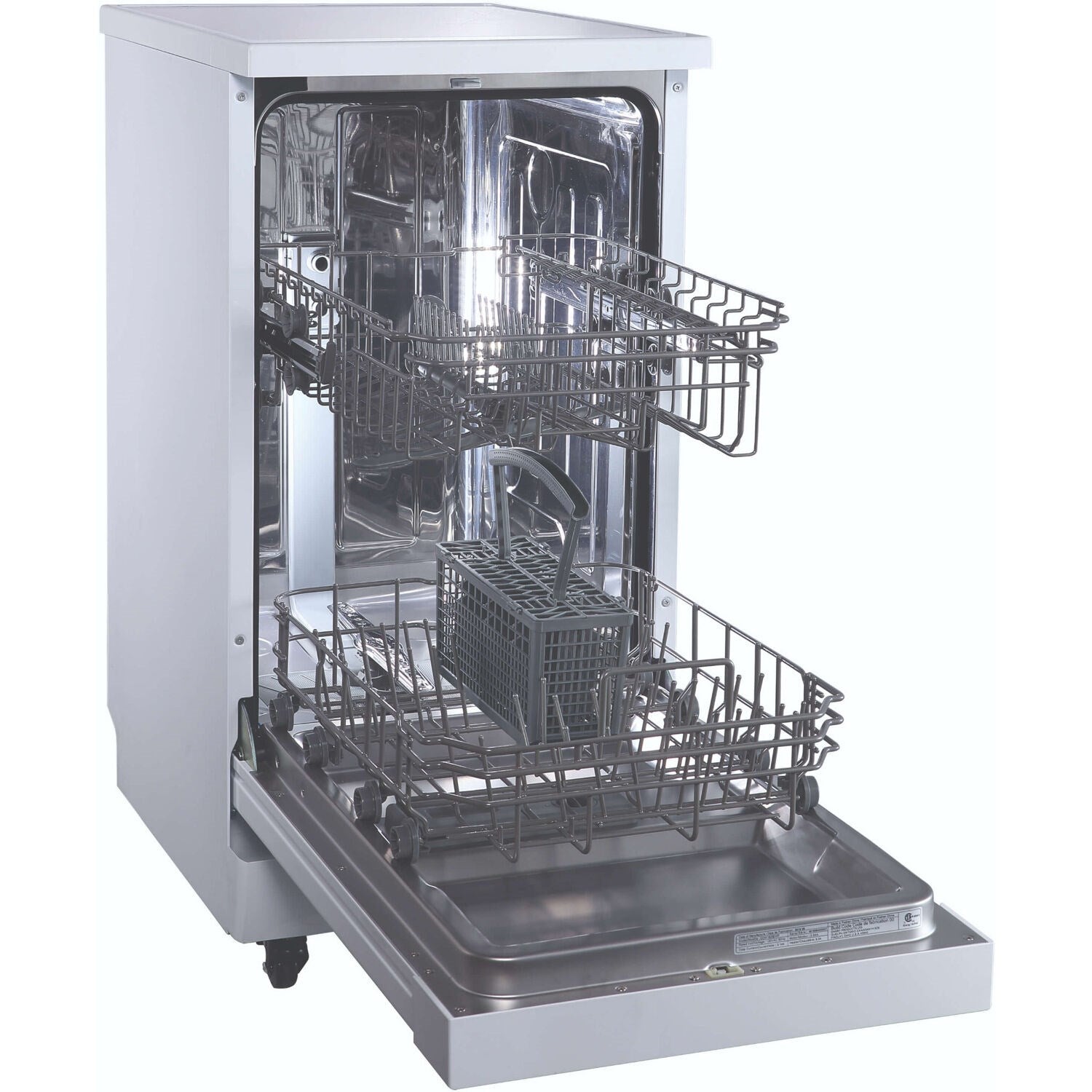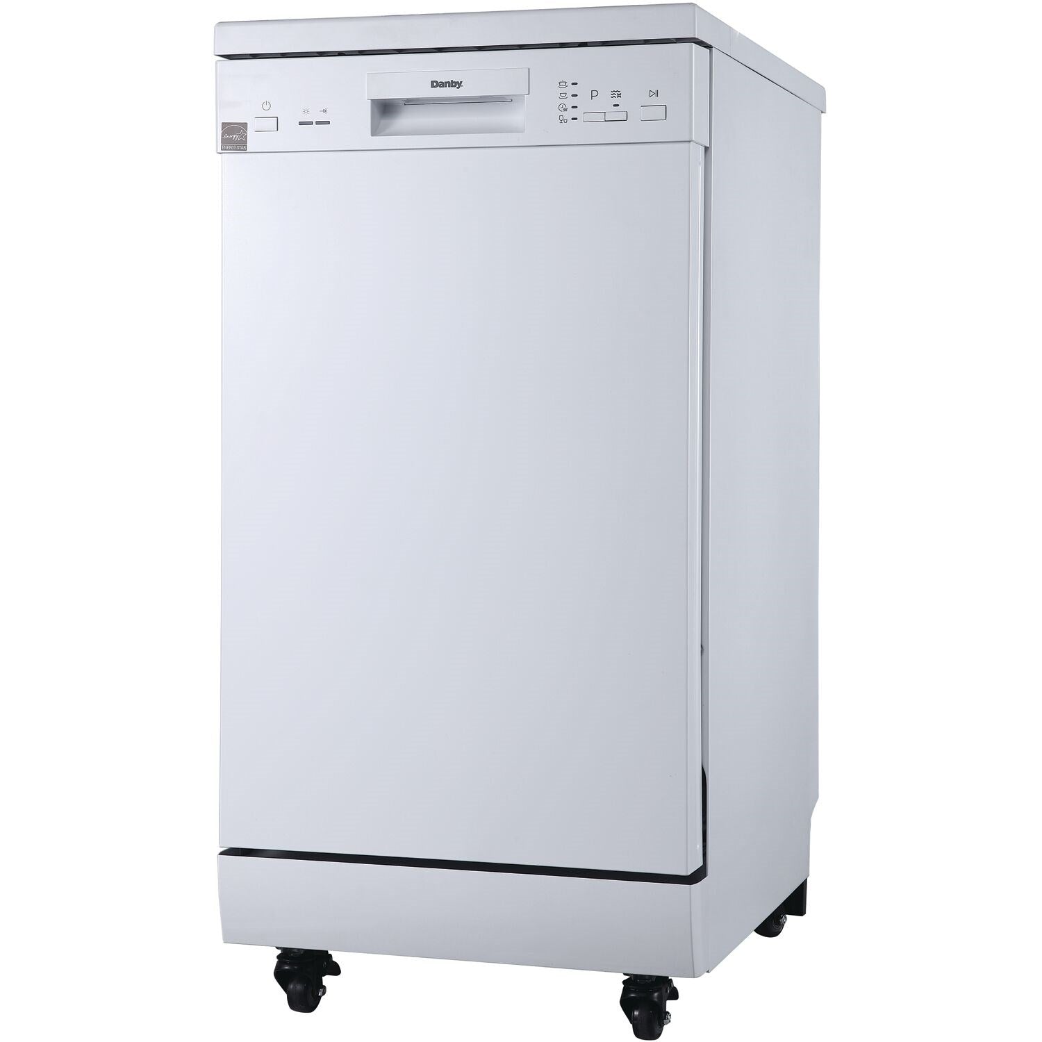 Washing dishes has never been as much fun as it is with this versatile dishwasher by Danby. This attractive machine comes with a silverware basket, an eight place settings capacity and four different wash cycles. Its just 18 in. wide (45.7 cm) meaning it can easily be installed in condos and apartments and the convenient built-in castors allow you to move it around with ease. Your electricity bills wont take a beating with this smart and eco-friendly unit as it boasts a valuable low-water consumption function and is also ENERGY STAR rated. The appliance features a durable stainless-steel spray arm and interior making it the ideal dishwasher for remote cottage locations. In addition, youll find an automatic detergent dispenser and rinse-agent dispenser and the entire unit can easily be programmed by the state-of-the-art electronic controls. This highly-efficient model also comes with a 12-month warranty on parts and labor with in-home service.