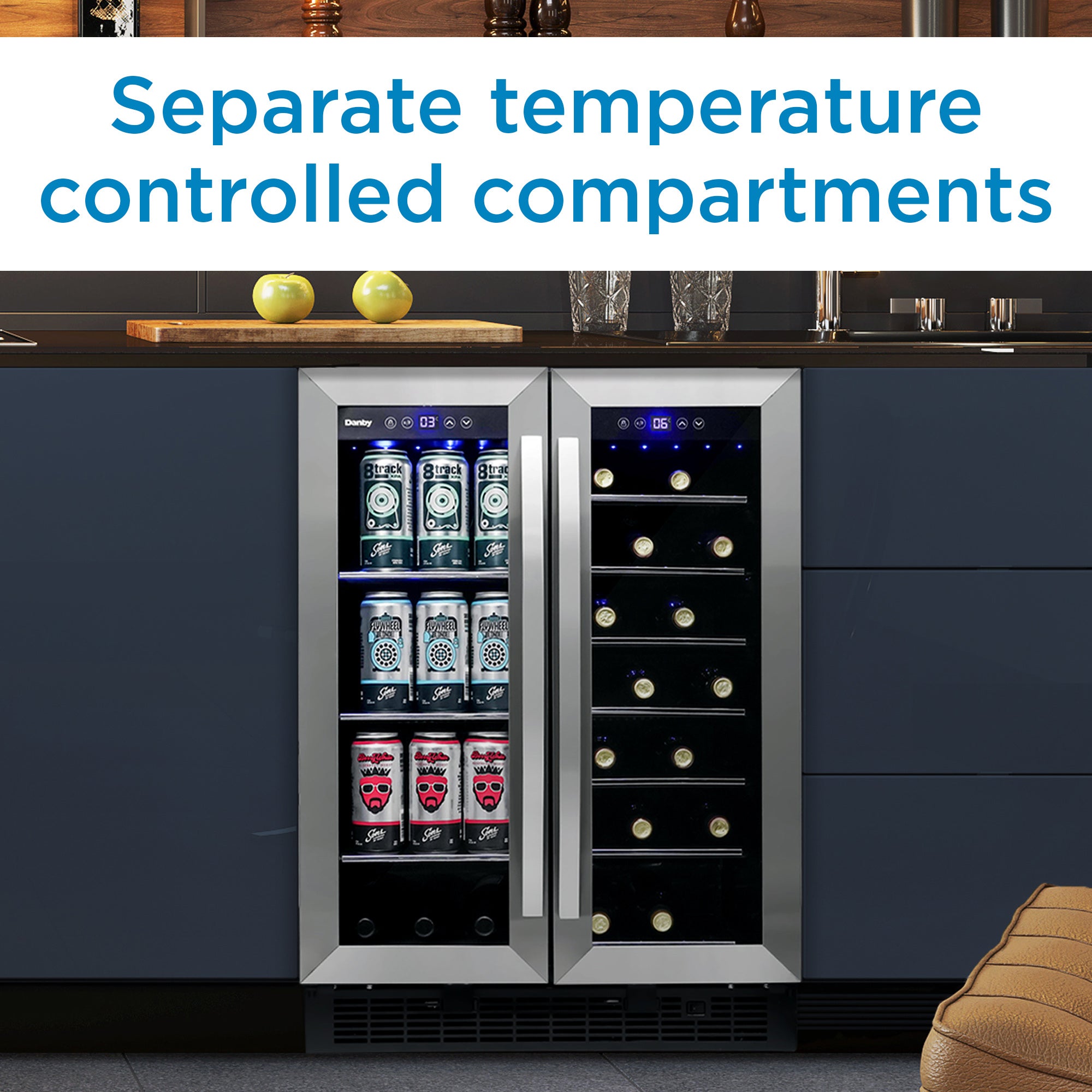 Upgrade your beverage storage with the Danby 5.2 cu. ft. Beverage Center, now available for purchase on Appliance Guys. This modern solution organizes up to 60 cans or 27 wine bottles in a sleek, fan-forced French Door design. The superior fan-forced cooling maintains optimal temperatures for both beverages and wine compartments. With a wide temperature range, LED interior lighting, and a digital thermostat, this beverage center provides convenience and efficiency. The stainless-steel door frame, dual-pane glass, and matching handle enhance its stylish appeal. Enjoy the flexibility of placing it under a counter or in your kitchen, home bar, or man cave.