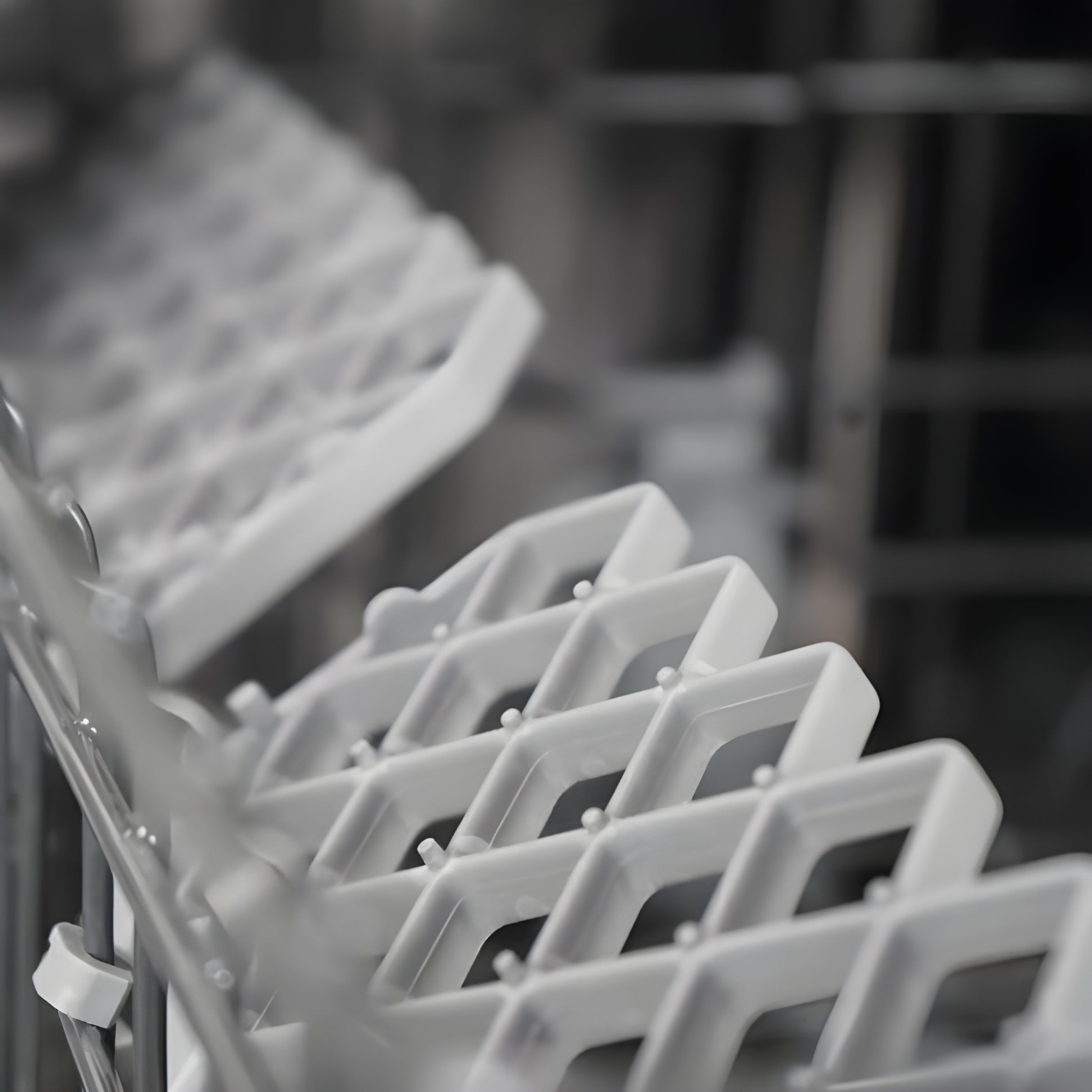 A: It comes with a clean white finish, adding a sleek and modern look to your kitchen with its semi-integrated design.