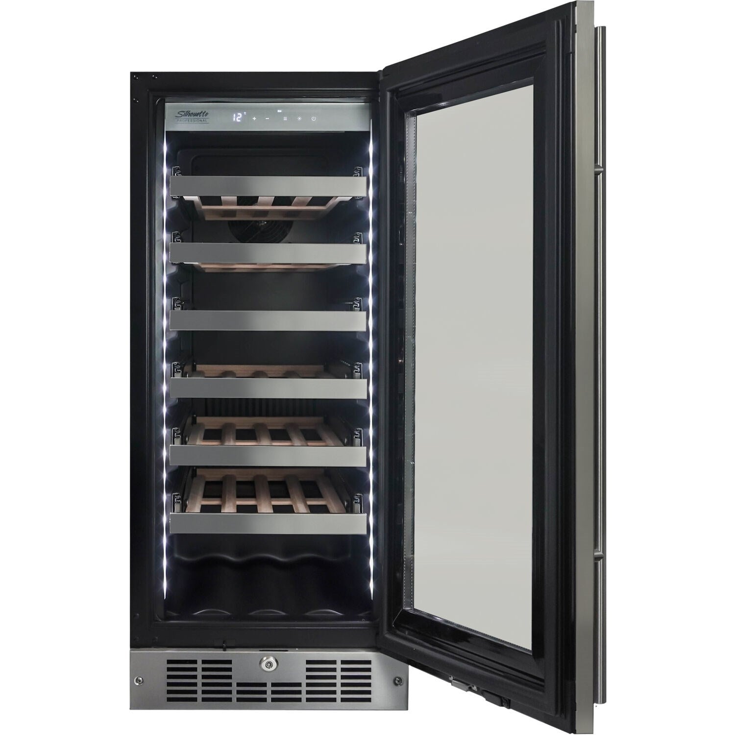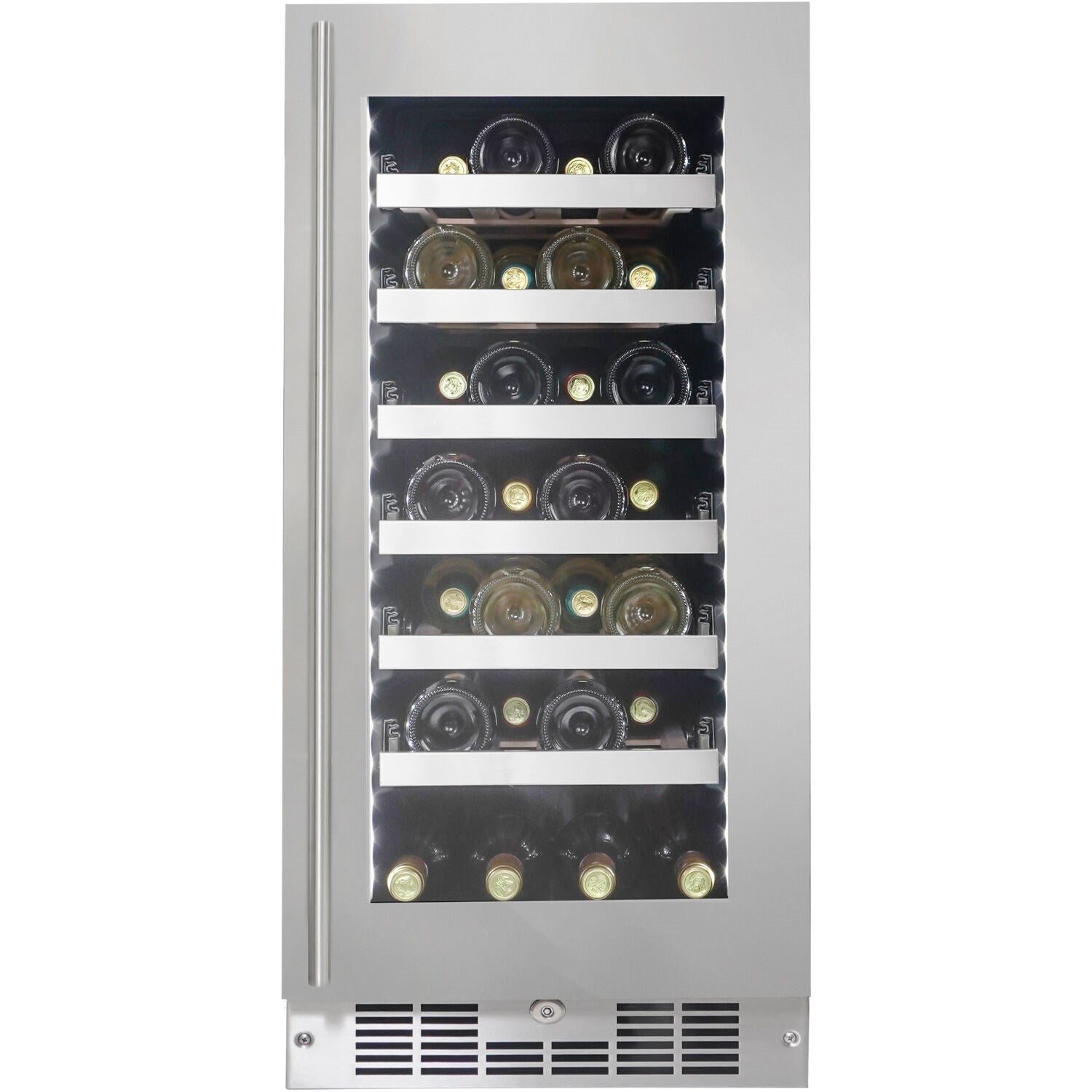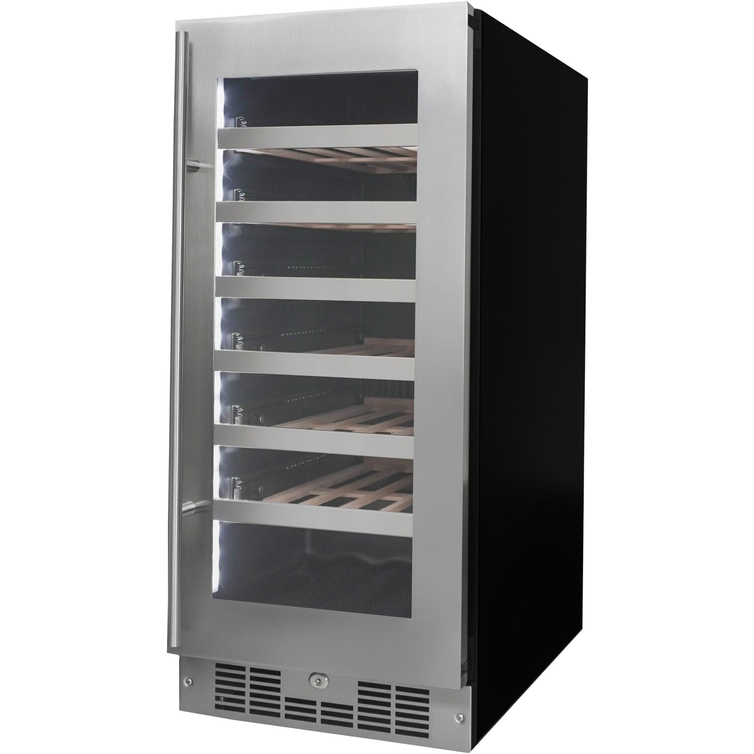 15 Inch Built-In Wine Cellar with 3.1 Cu. Ft. (27 Bottle) Capacity, Pro-vection Cooling, Dual Pane Glass Door, Natural Wood Full Extension Shelving, Integrated Door Lock, Temperature Alarms, in 304 Grade Stainless Steel