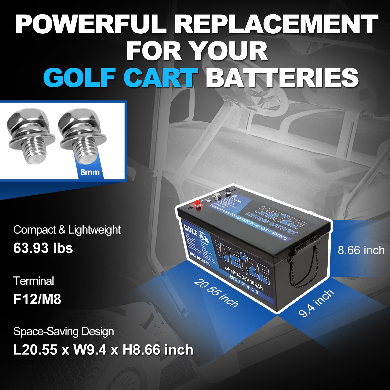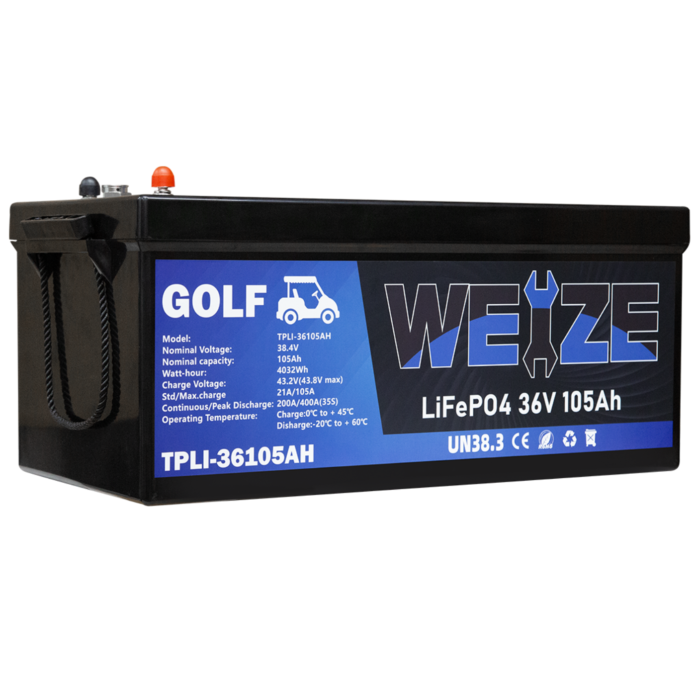 Q: What is the WEIZE 38.4V 105Ah LiFePO4 Golf Cart Battery?