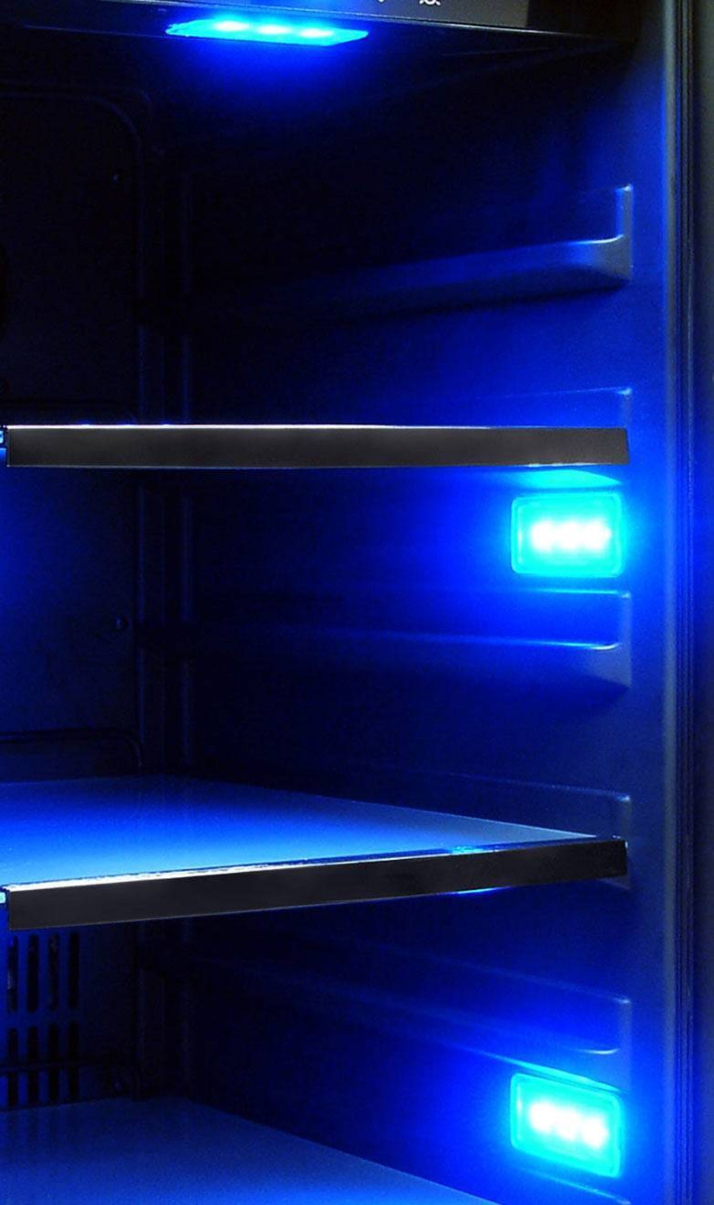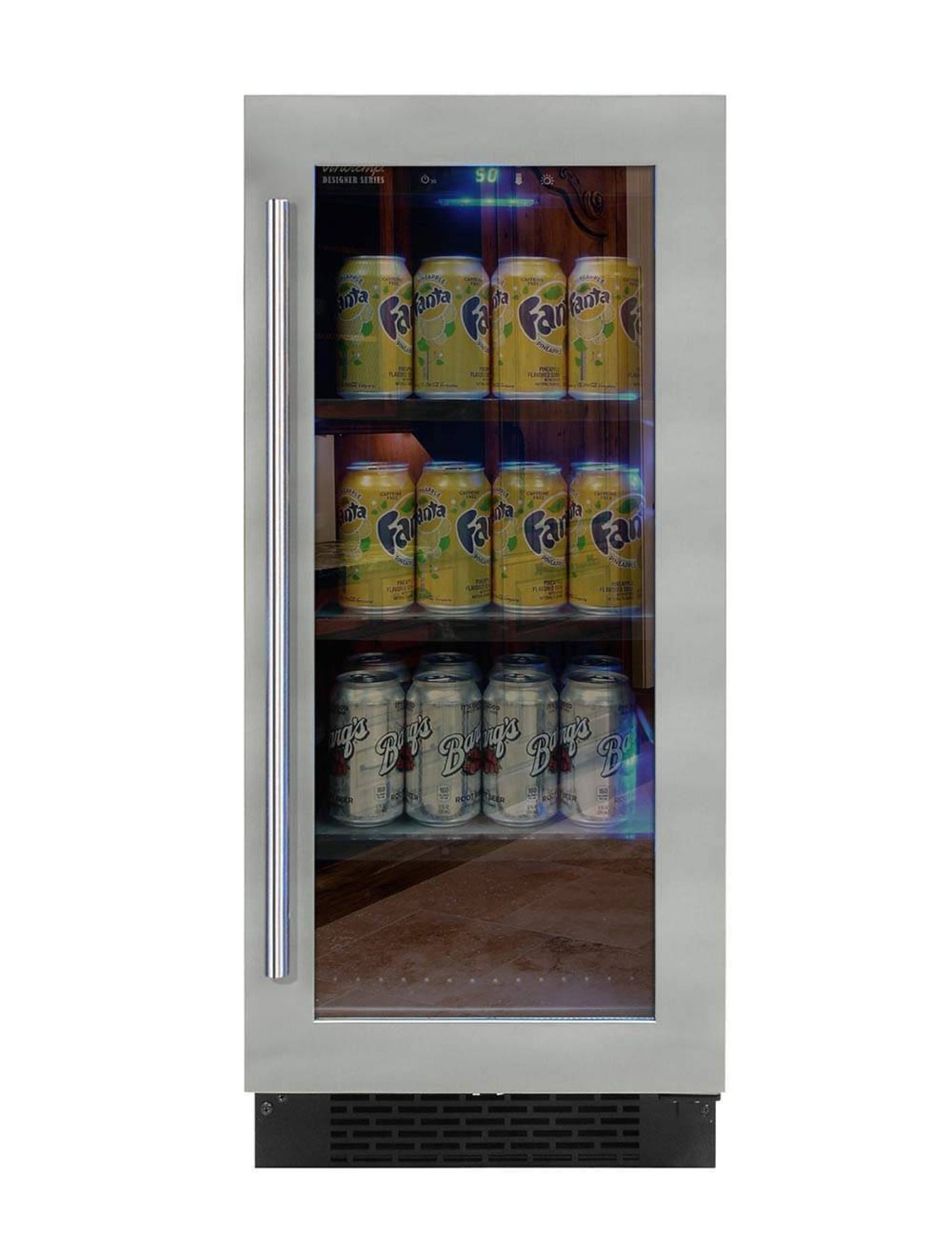 The Vinotemp Designer Series 15-inch Beverage Cooler is an essential for those who love to entertain. Equipped with front exhaust, this beverage cooler is designed to fit seamlessly in existing cabinetry. Outfitted with 3 sturdy tempered glass shelves with a black lip, there’s plenty of room for an assortment of your favorite drinks. The easy to use digital control panel makes adjusting the temperature simple while providing peace of mind that your beverages are always ready to be enjoyed. The blue LED lighting illuminates the cooler’s contents behind a seamless stainless steel door, making this beverage cooler an aesthetically pleasing addition to any room. This beverage cooler holds approximately 86 12 oz. cans. Beautiful and functional, this beverage cooler is sure to be the centerpiece of get-togethers for years to come.