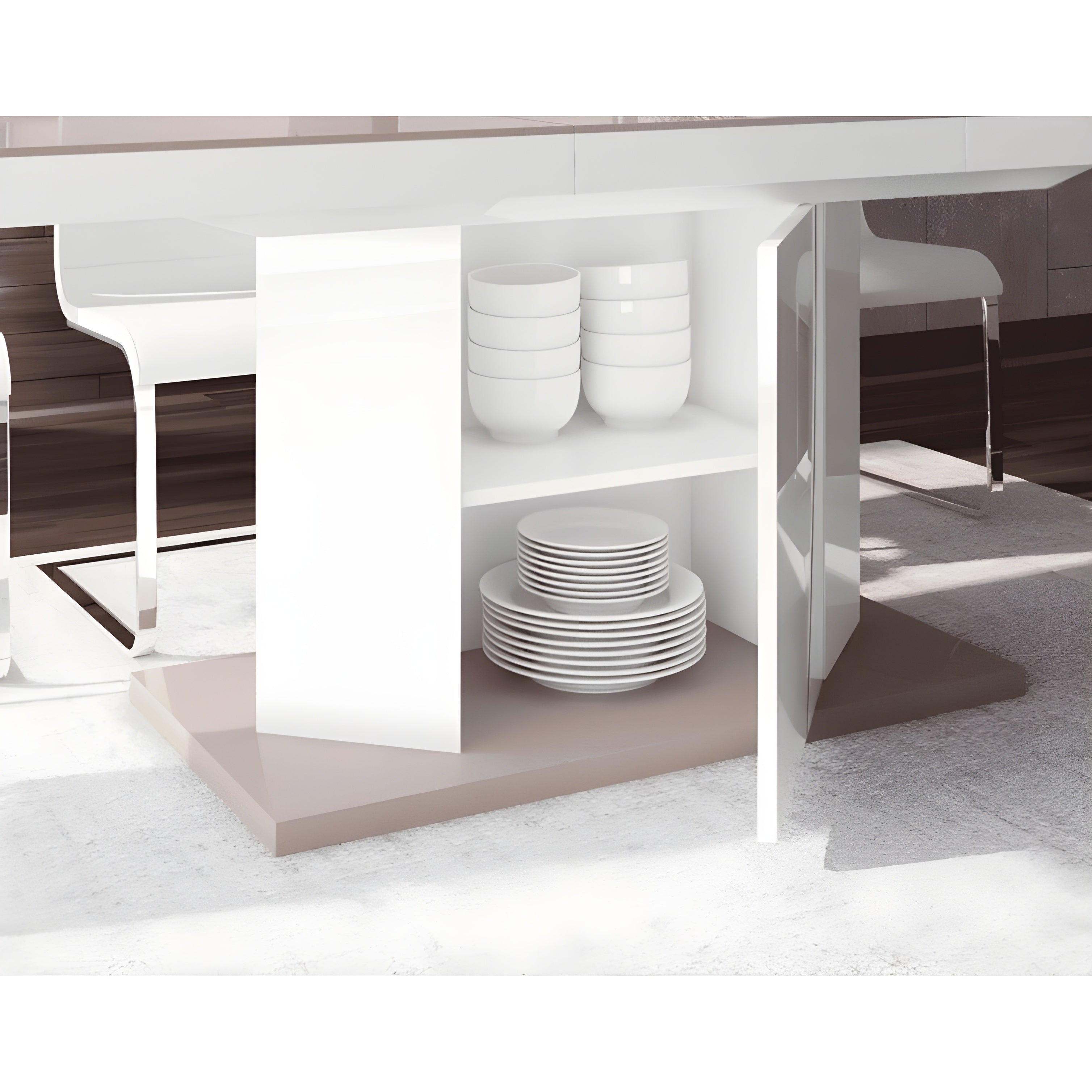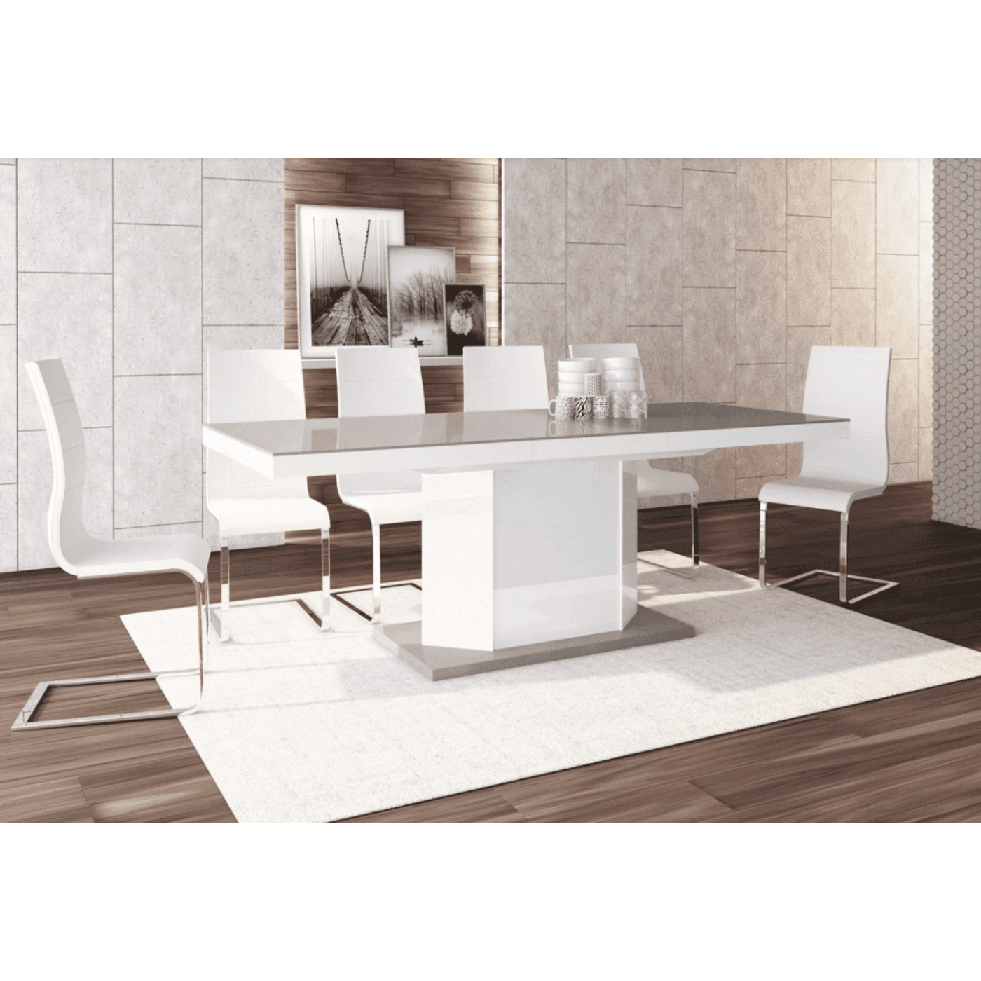 The set includes High Gloss Extendable Dining Table with 6 chairs. Multifunctional Table features storage inside the base for kitchen ware or linens and is the perfect solution for everyday and entertaining table use. It easily transforms from a medium size (63-inch, with 6-person seating) to an extended (81.8-inch, with 8-person seating or 100.7 inch, with 10-person seating) table.