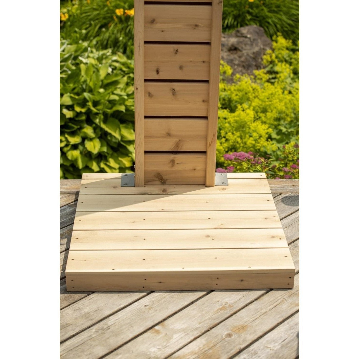 A: It's a freestanding outdoor shower made from Eastern White Cedar, perfect for use by pools, hot tubs, or saunas.