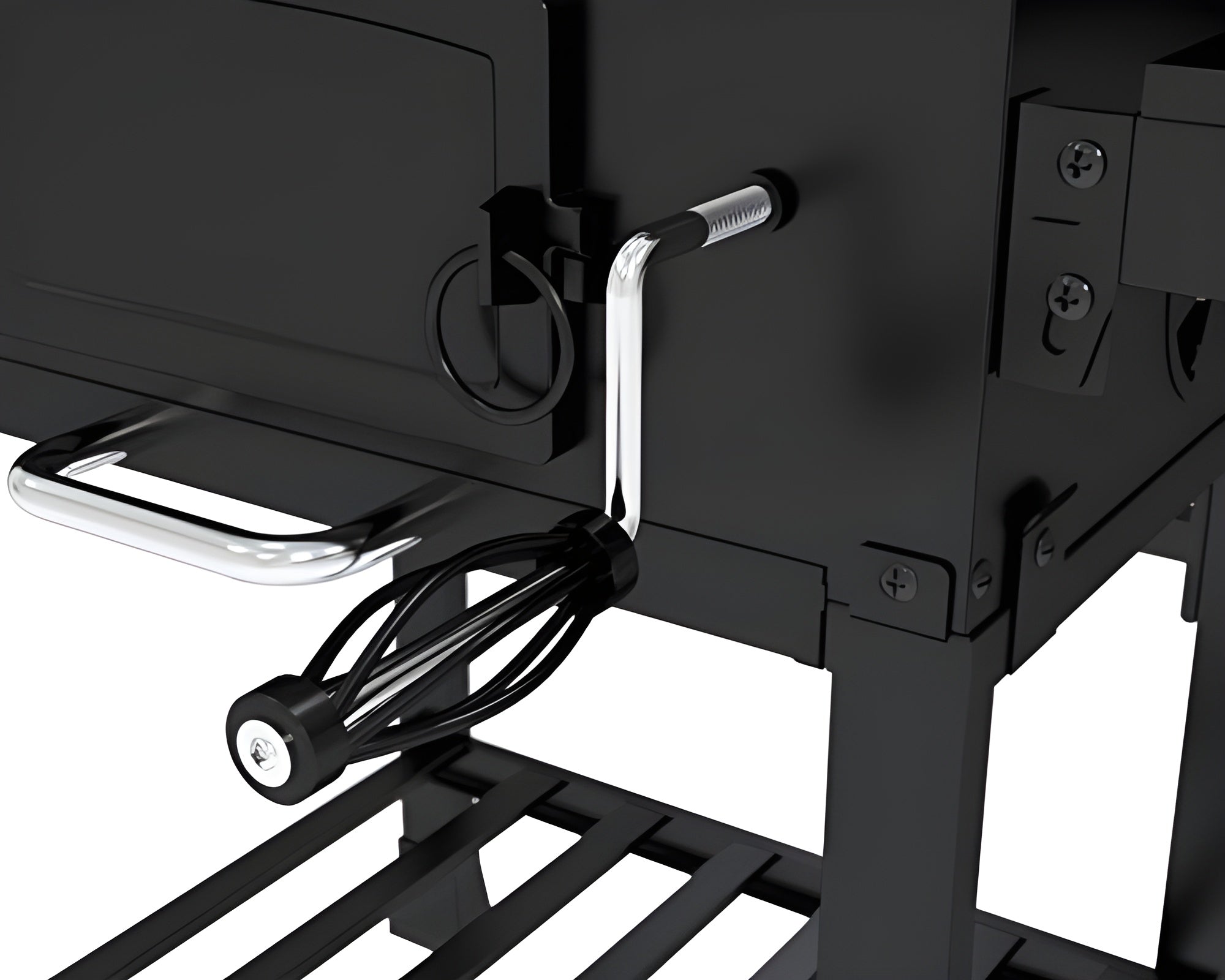 A: The grill is constructed from durable steel with a black powder-coated finish, ensuring long-lasting use and protection against the elements.
