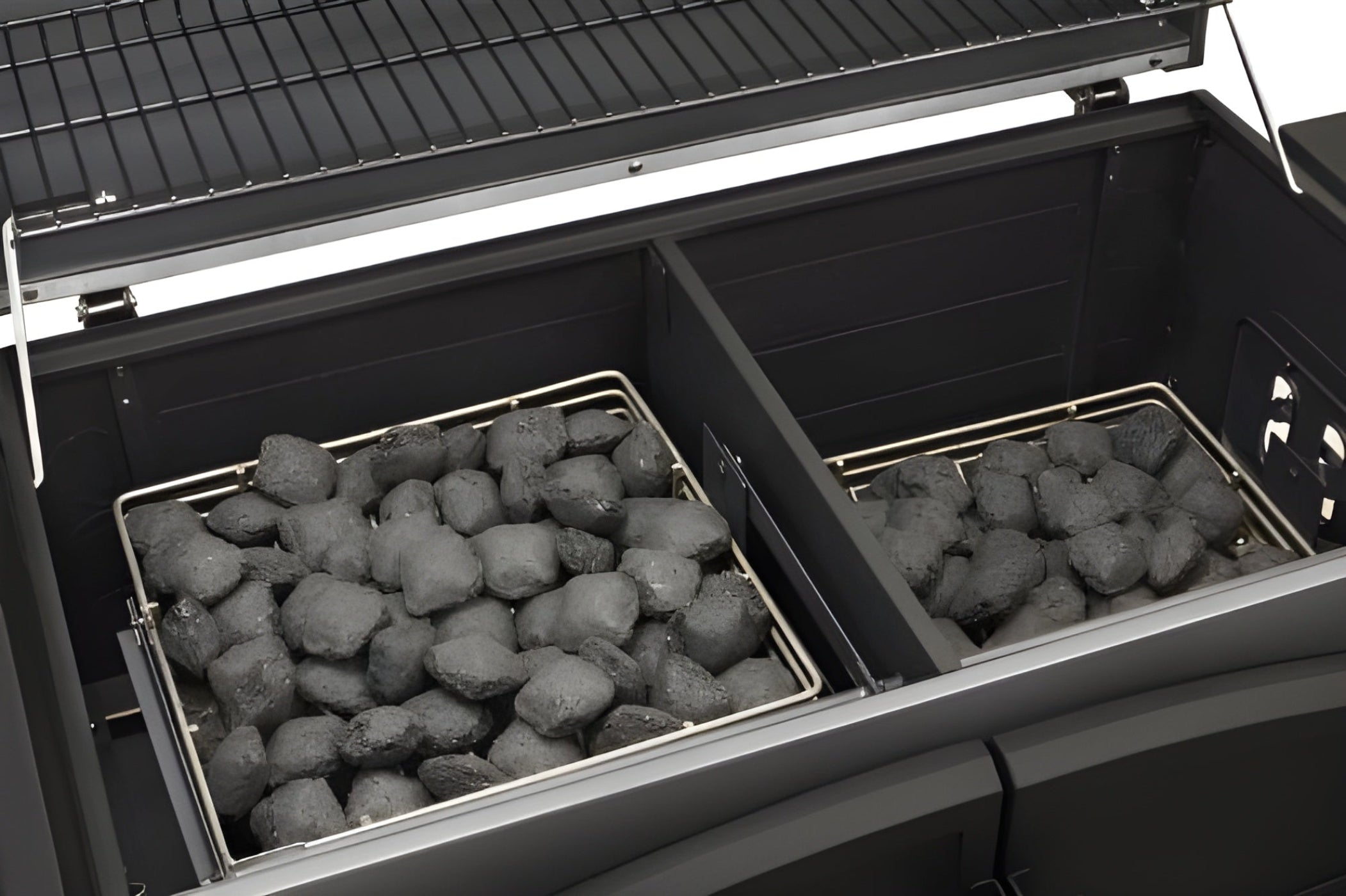 A: Features include two adjustable charcoal trays for temperature control, a durable steel construction with a black powder-coated finish, an easy-to-read temperature gauge, and a unique dual chamber design for multitasking with different foods.