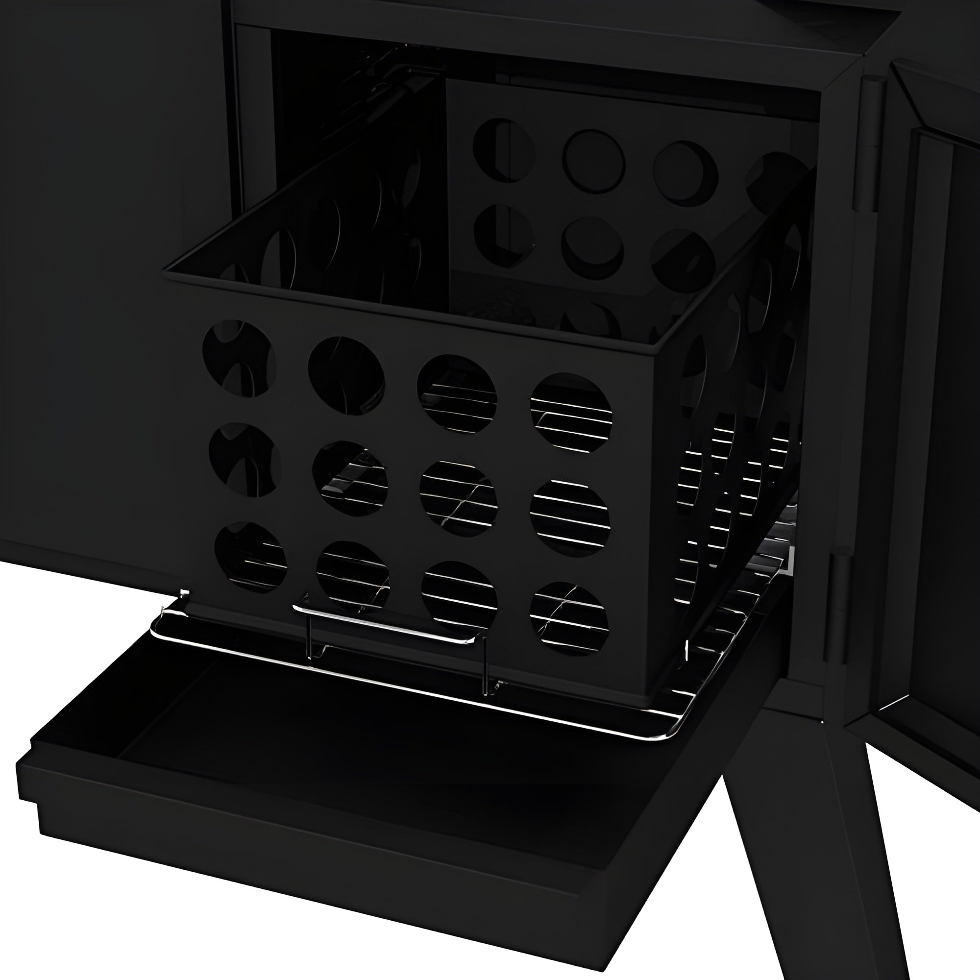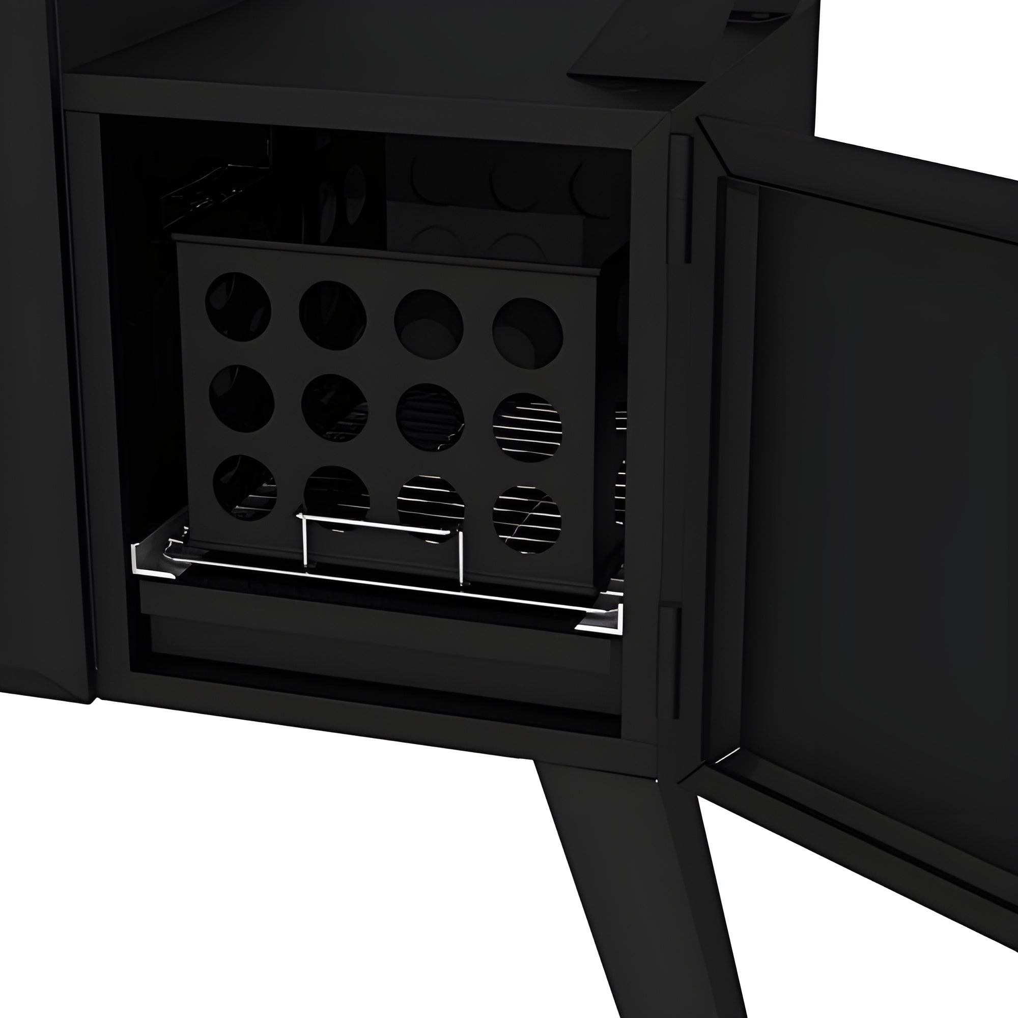 Charcoal and ash management system with charcoal chamber, grate and sliding, removable steel ash pan. Designed to handle large amounts of ash for hours of maintece-free cooking