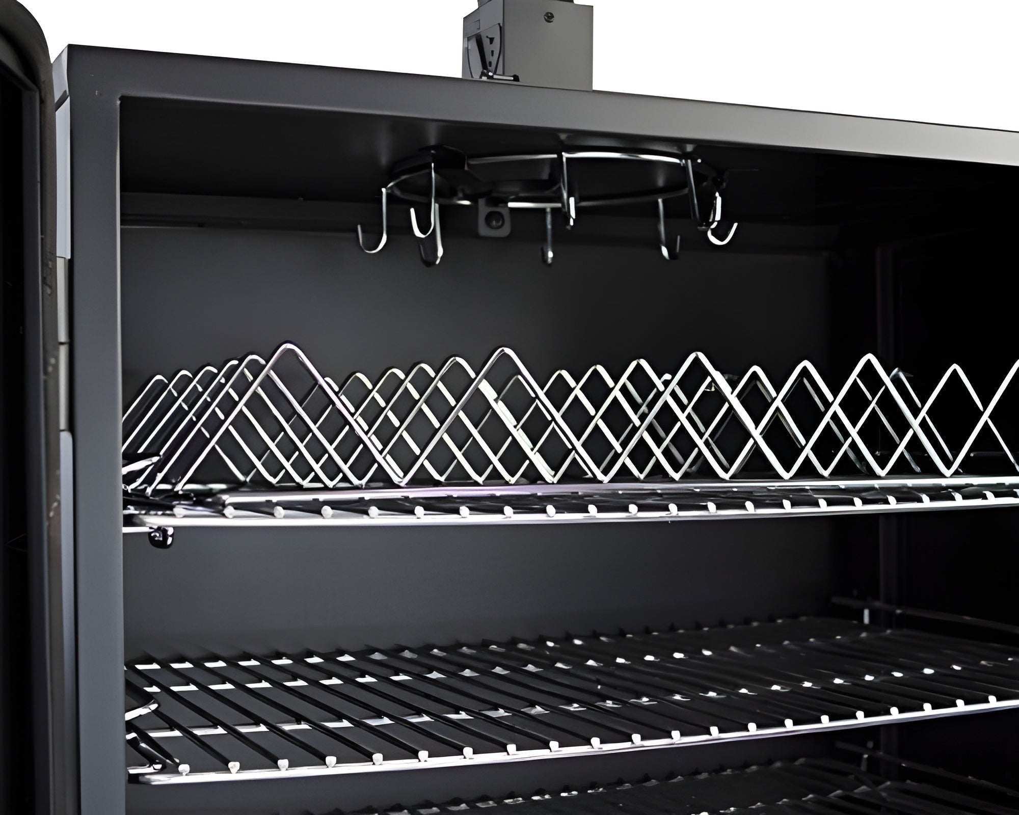 Six height-adjustable cooking grates accommodate various sizes of food, giving 1890 square inches of total cooking space with 25-pounds capacity per grate.
